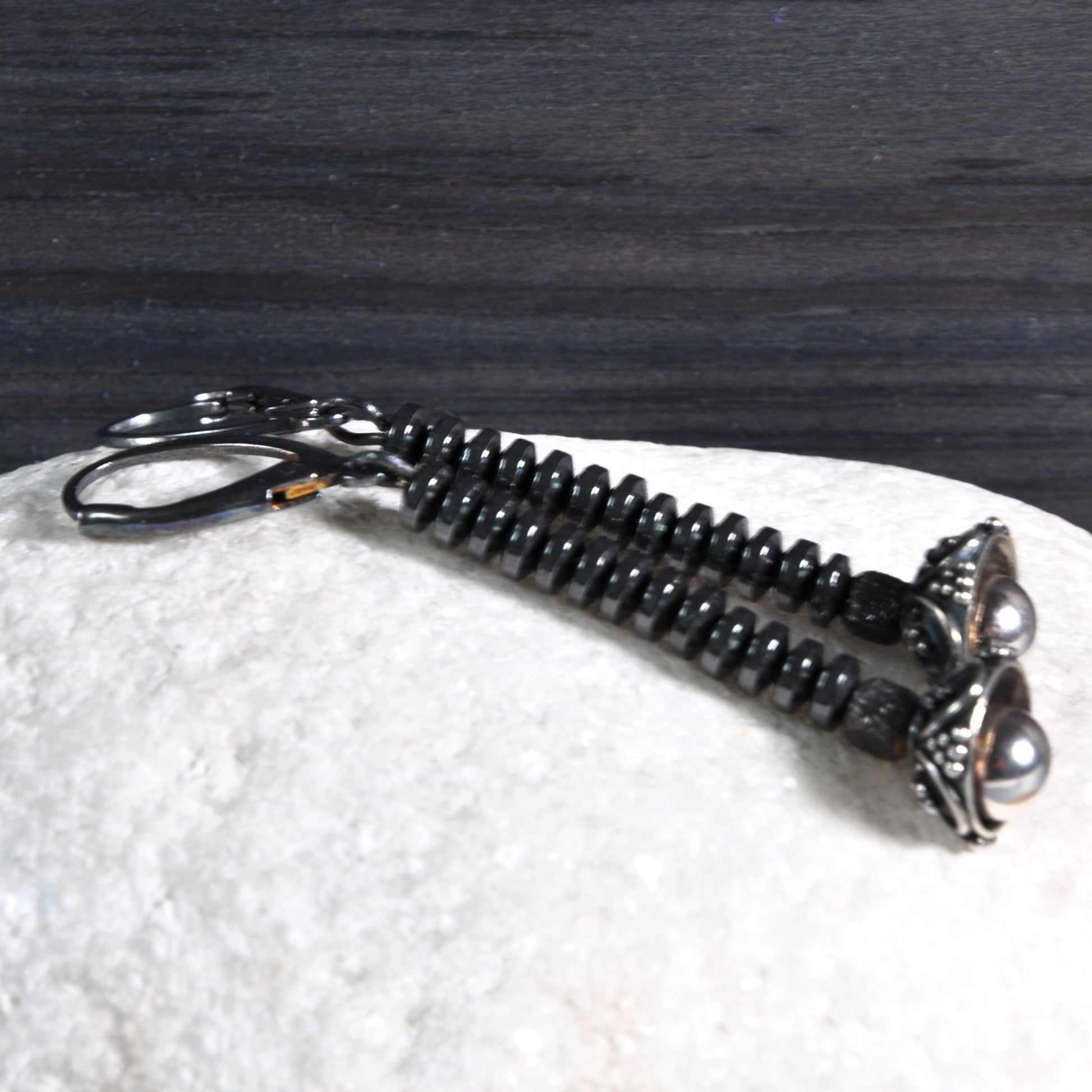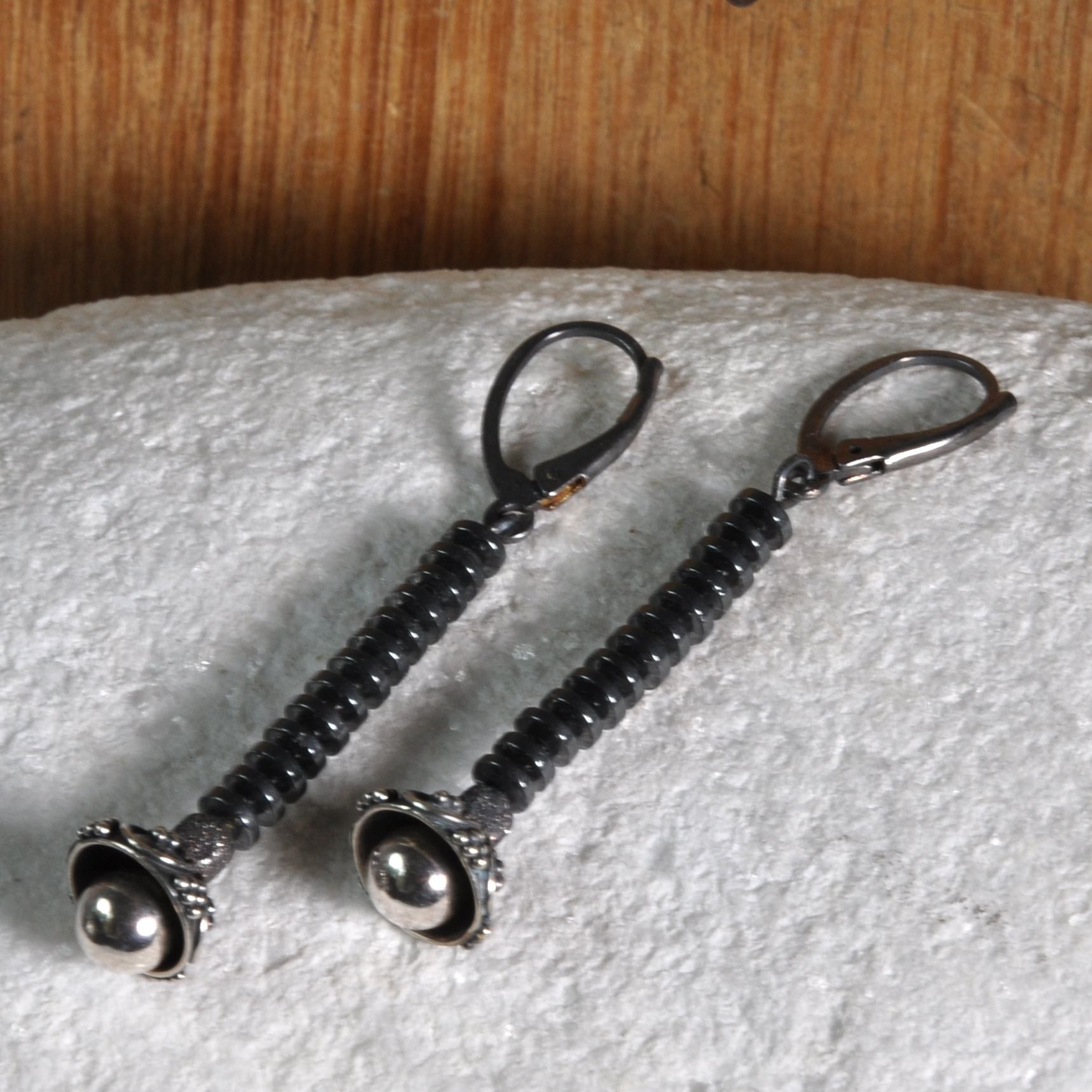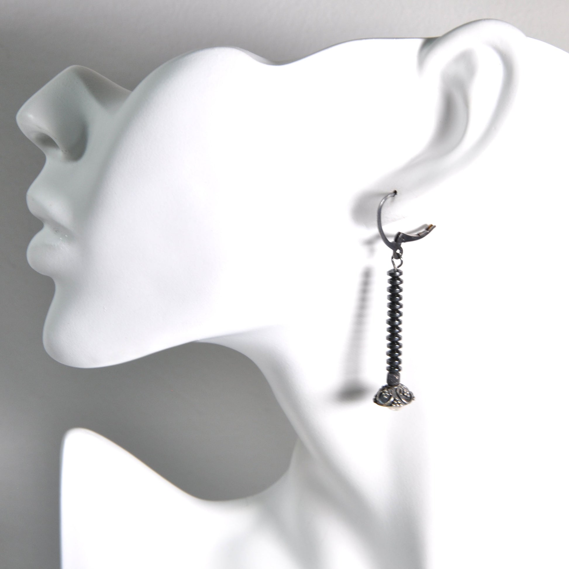 Pendientes elaborados en plata y rondelles de hematites. Una combinación de forma moderna y sencilla con toques de romance. Las flores con tallos negros hechos de diminutos discos de hematita, están coronadas con cuencos decorativos de plata y de ellos emergen, casi invisibles, suaves bolas de plata brillante y pulida. Toda la pieza se mantiene en un tono oscuro, oxidado a un tono de plata grafito oscuro, dando a los pendientes un carácter único. La longitud de los pendientes es de unos 5,7 cm (aprox. 2,24 pulgadas).