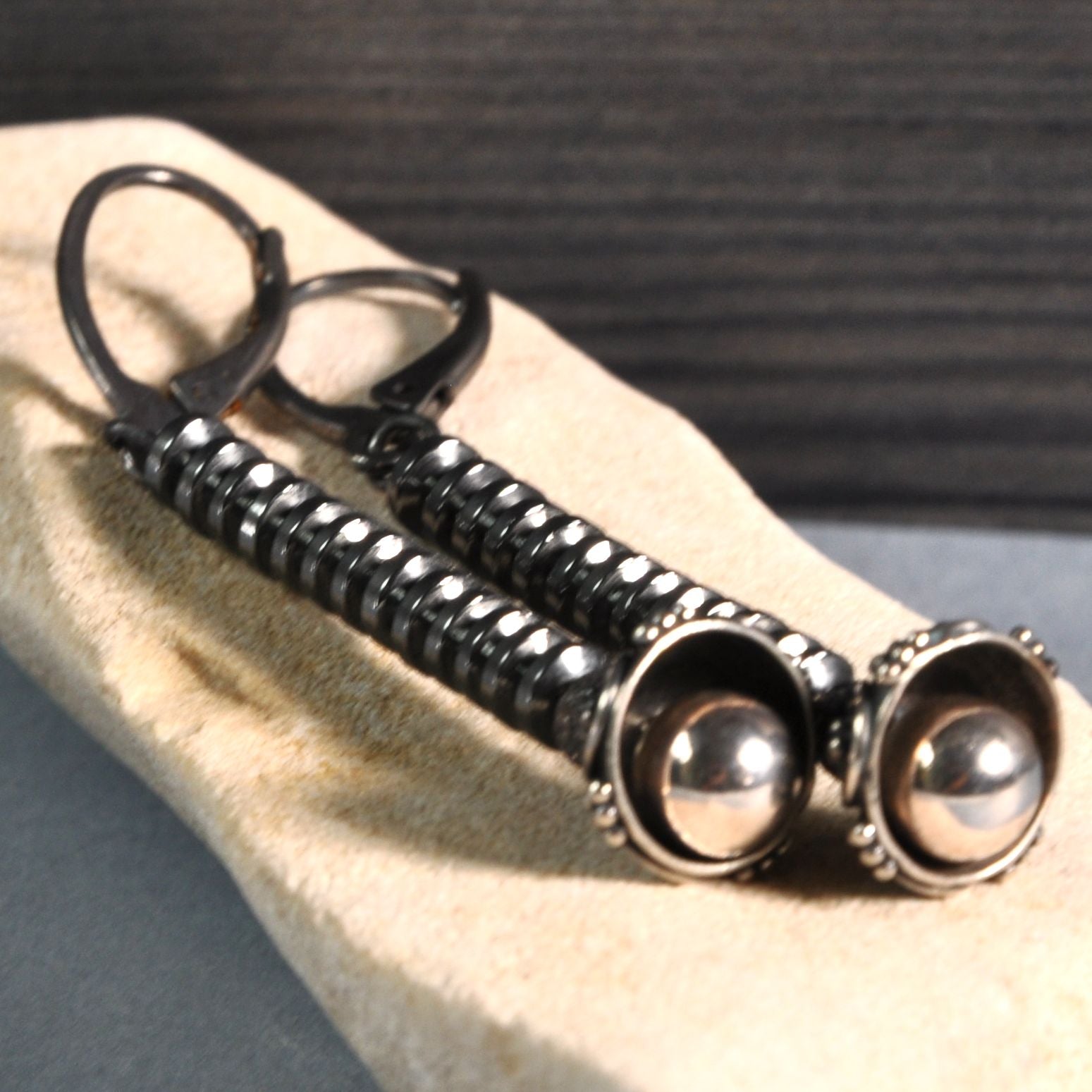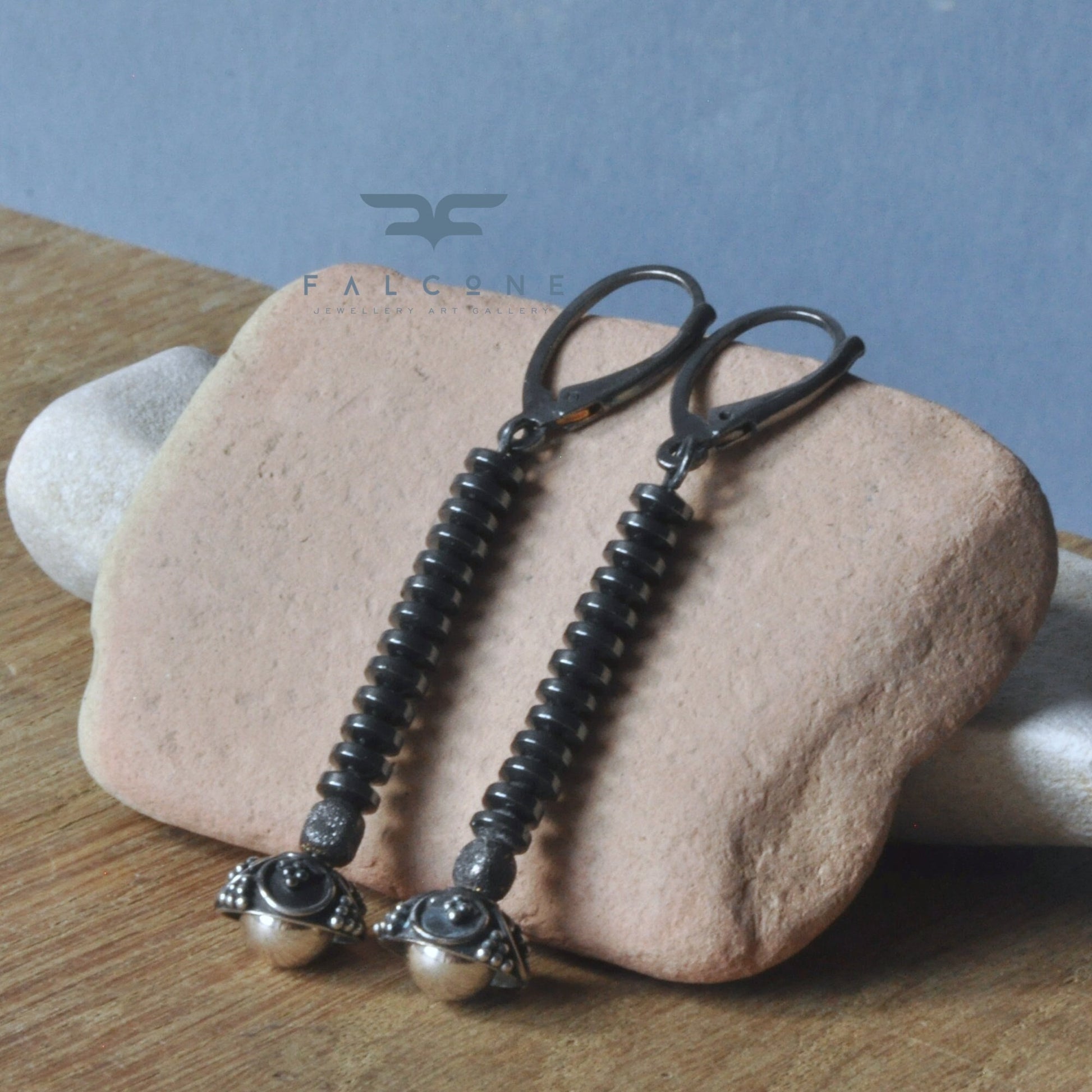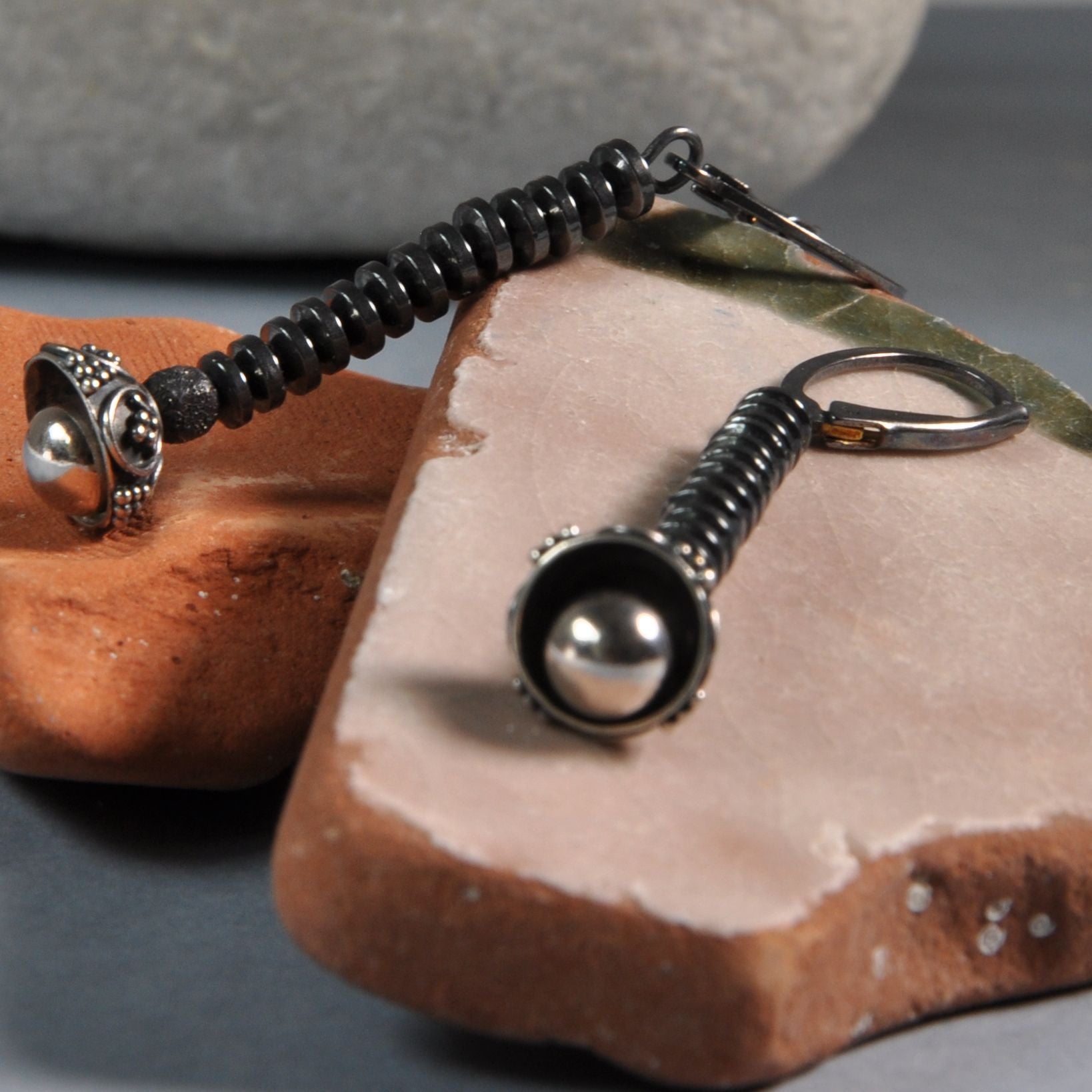 Pendientes elaborados en plata y rondelles de hematites. Una combinación de forma moderna y sencilla con toques de romance. Las flores con tallos negros hechos de diminutos discos de hematita, están coronadas con cuencos decorativos de plata y de ellos emergen, casi invisibles, suaves bolas de plata brillante y pulida. Toda la pieza se mantiene en un tono oscuro, oxidado a un tono de plata grafito oscuro, dando a los pendientes un carácter único. La longitud de los pendientes es de unos 5,7 cm (aprox. 2,24 pulgadas).