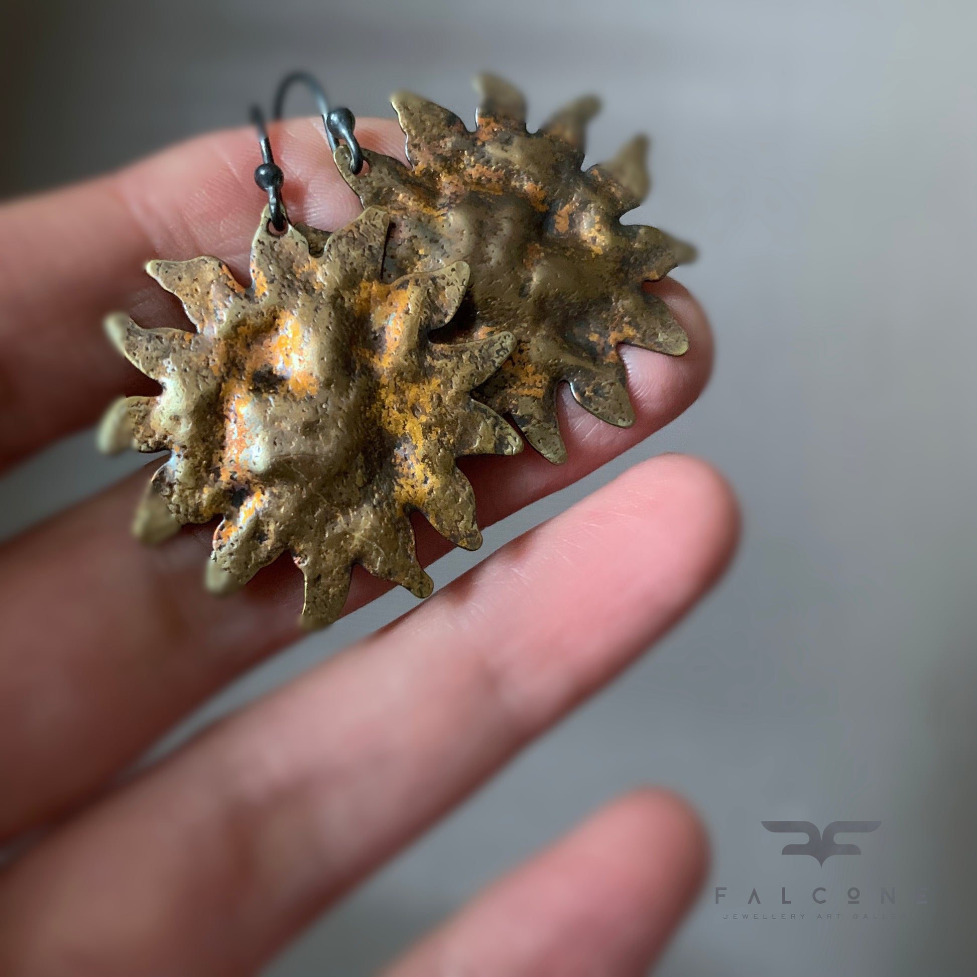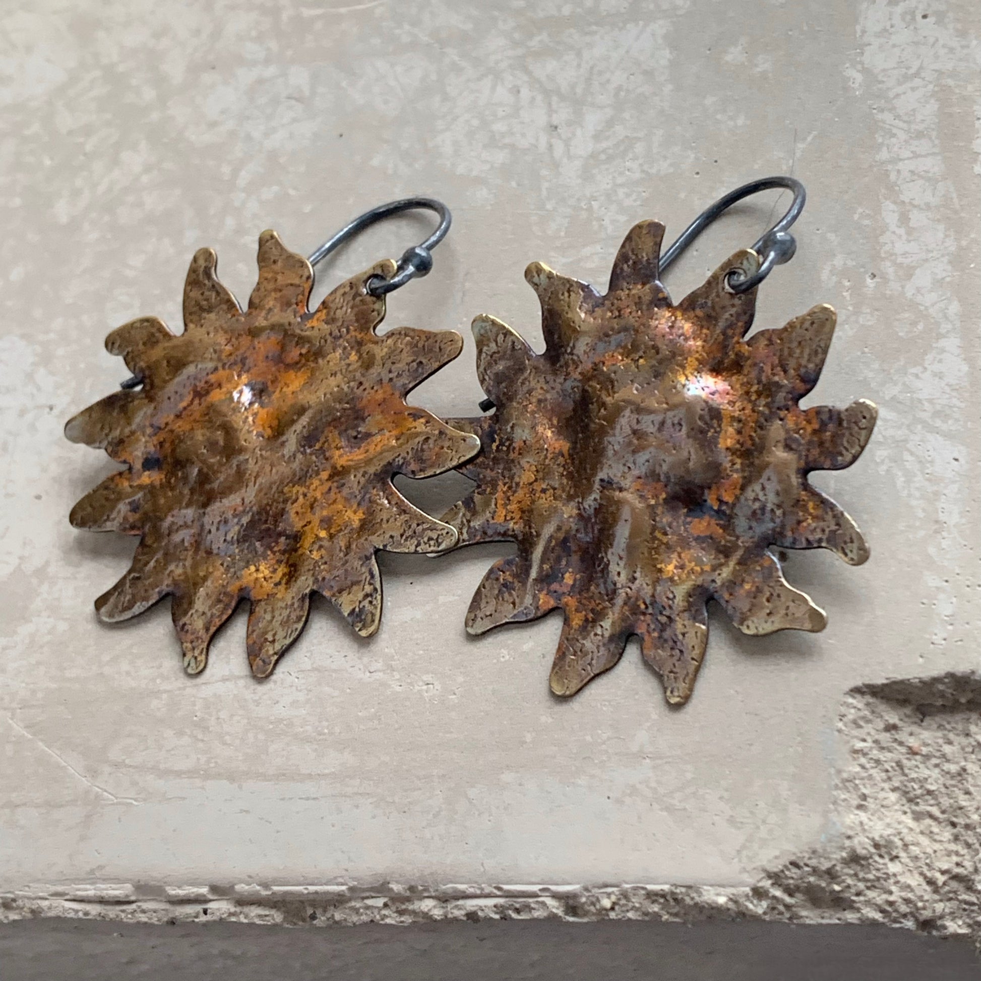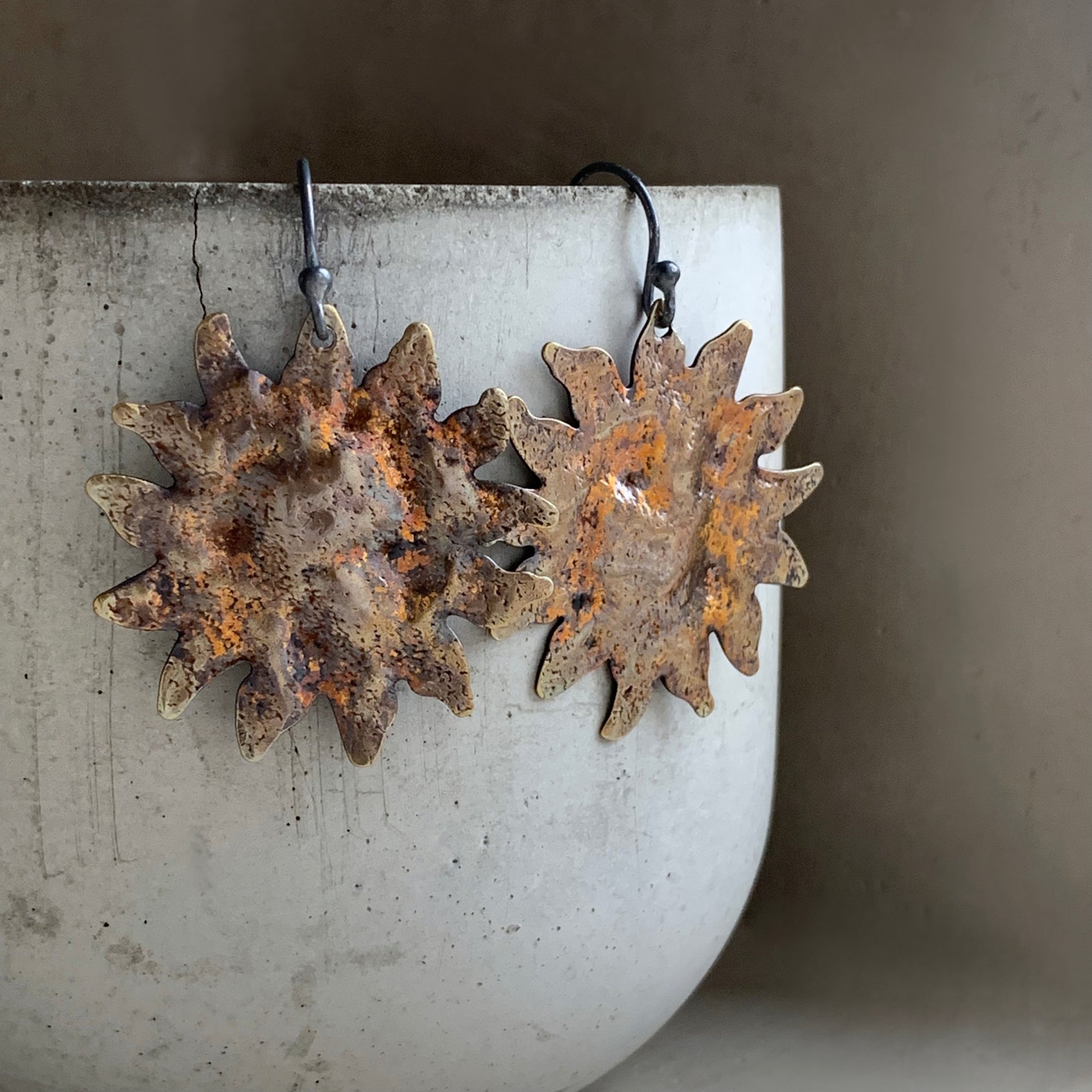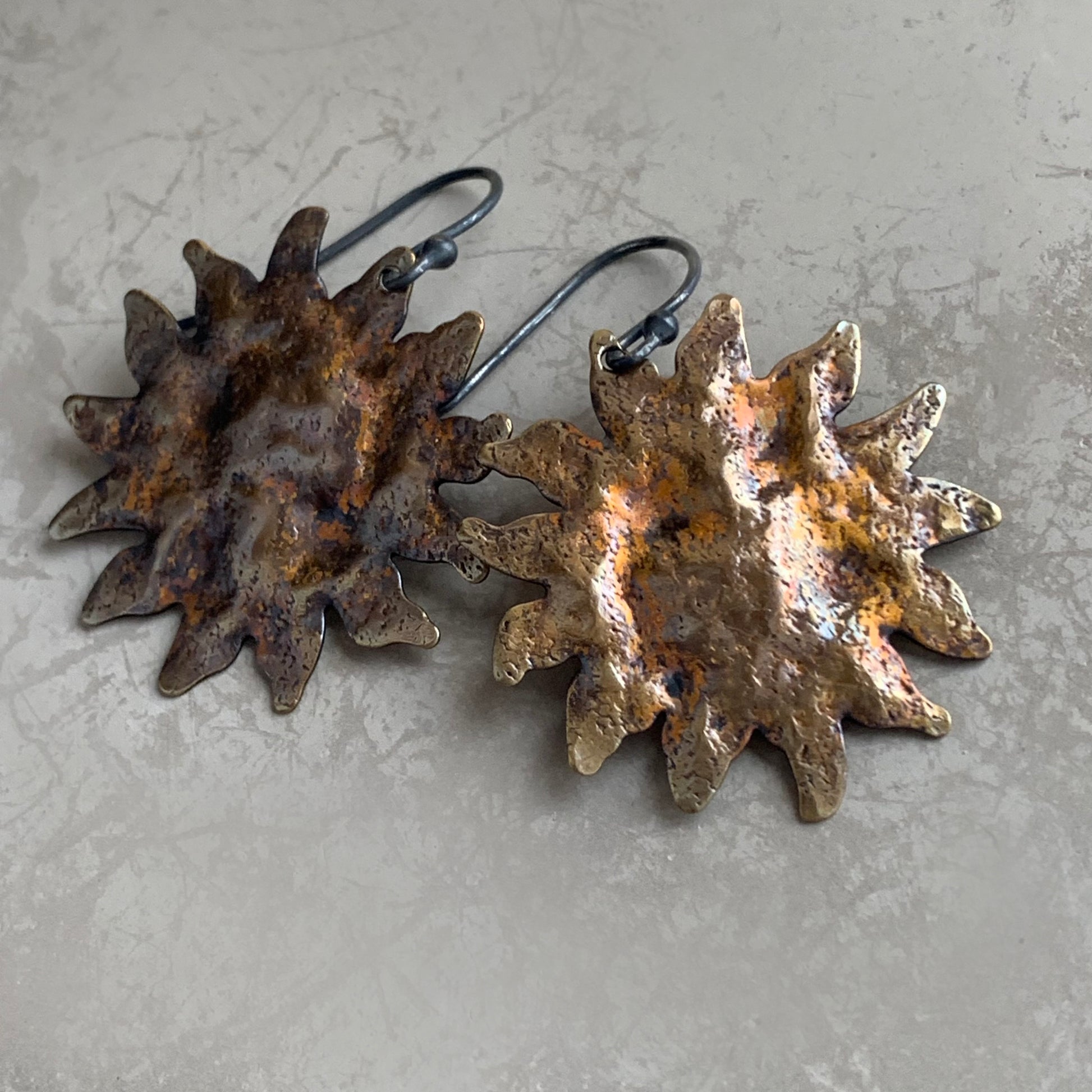 Pendientes de plata de ley y latón. El latón está martillado, texturizado y patinado. La pátina presenta un color dorado con toques de marrón óxido, inspirado en la paleta de ornamentación barroca, lo que les confiere un carácter ligeramente teatral. Los motivos solares se complementan con ganchos minimalistas de plata de ley en contraste. Ganchos abiertos de plata de ley 925.