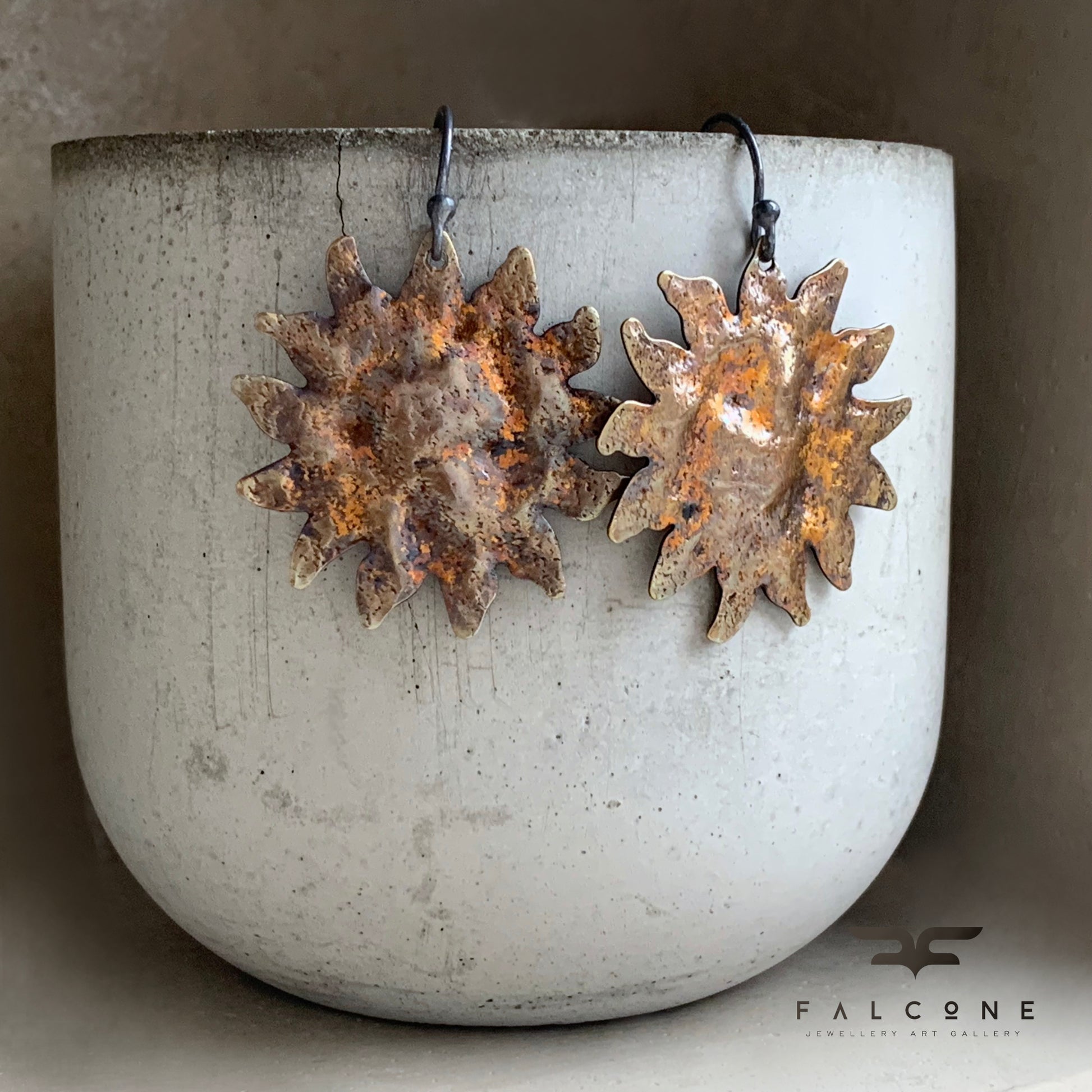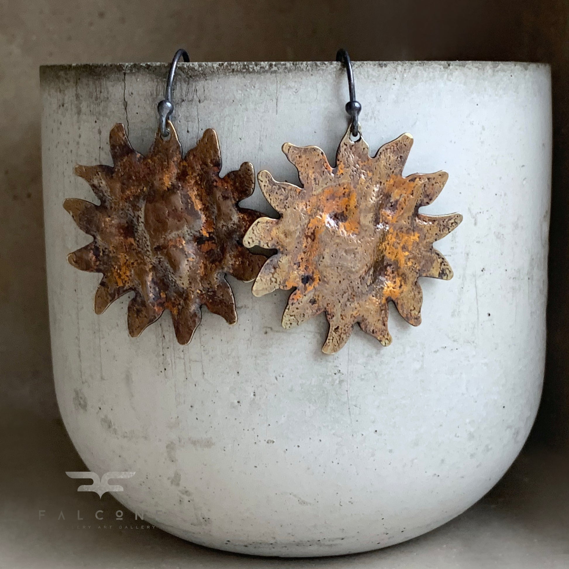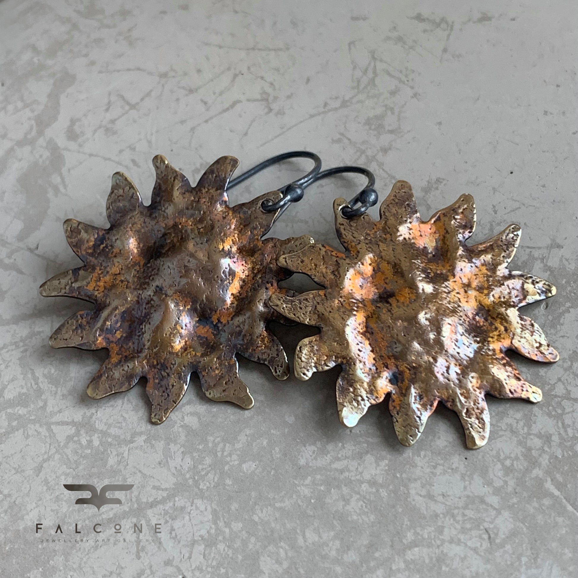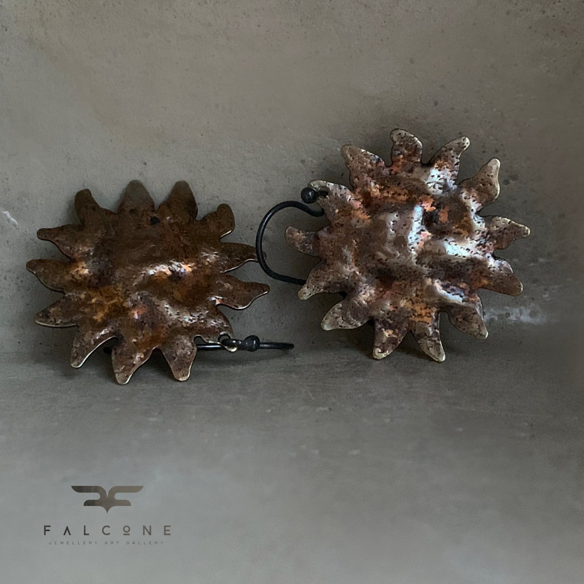 Pendientes de plata de ley y latón. El latón está martillado, texturizado y patinado. La pátina presenta un color dorado con toques de marrón óxido, inspirado en la paleta de ornamentación barroca, lo que les confiere un carácter ligeramente teatral. Los motivos solares se complementan con ganchos minimalistas de plata de ley en contraste. Ganchos abiertos de plata de ley 925.