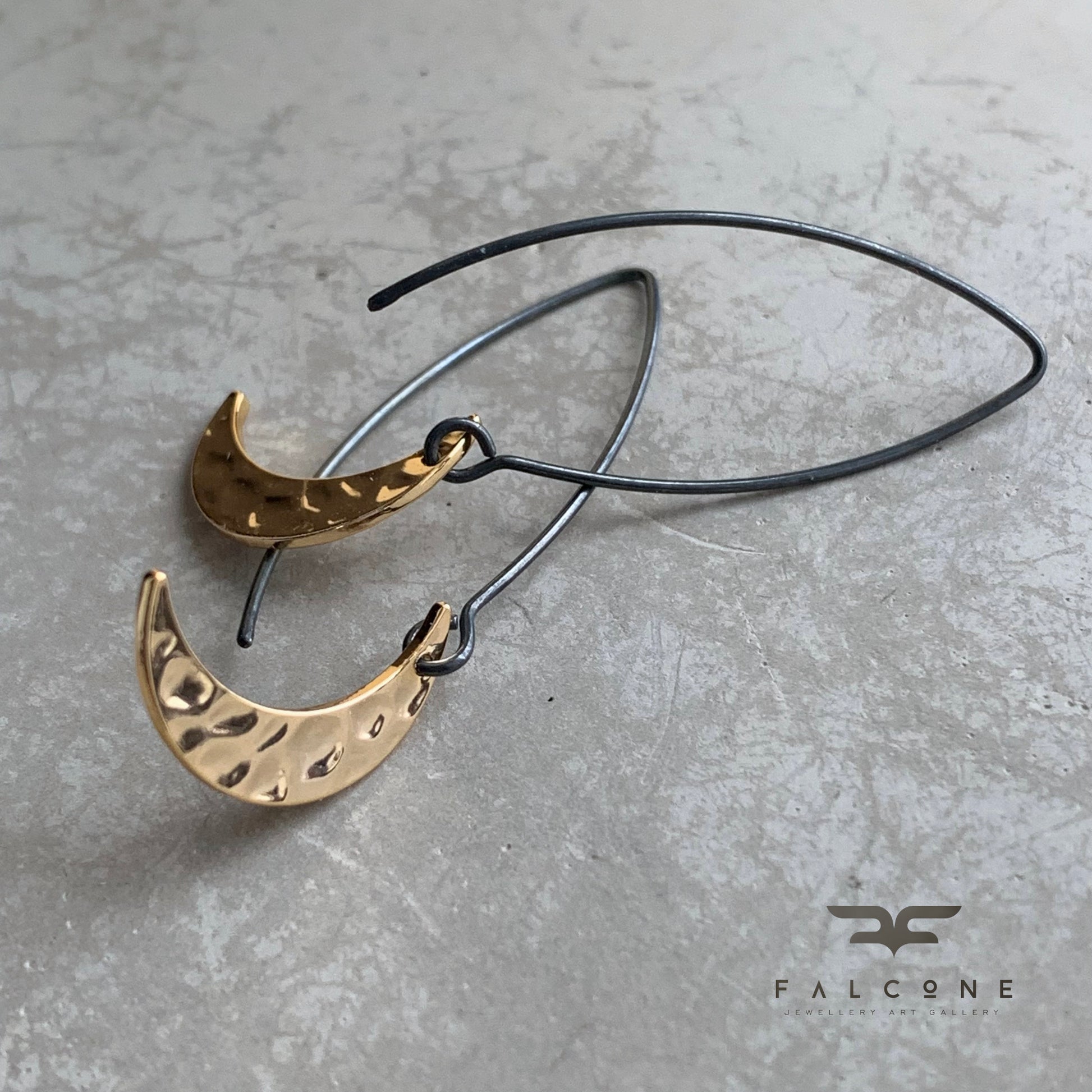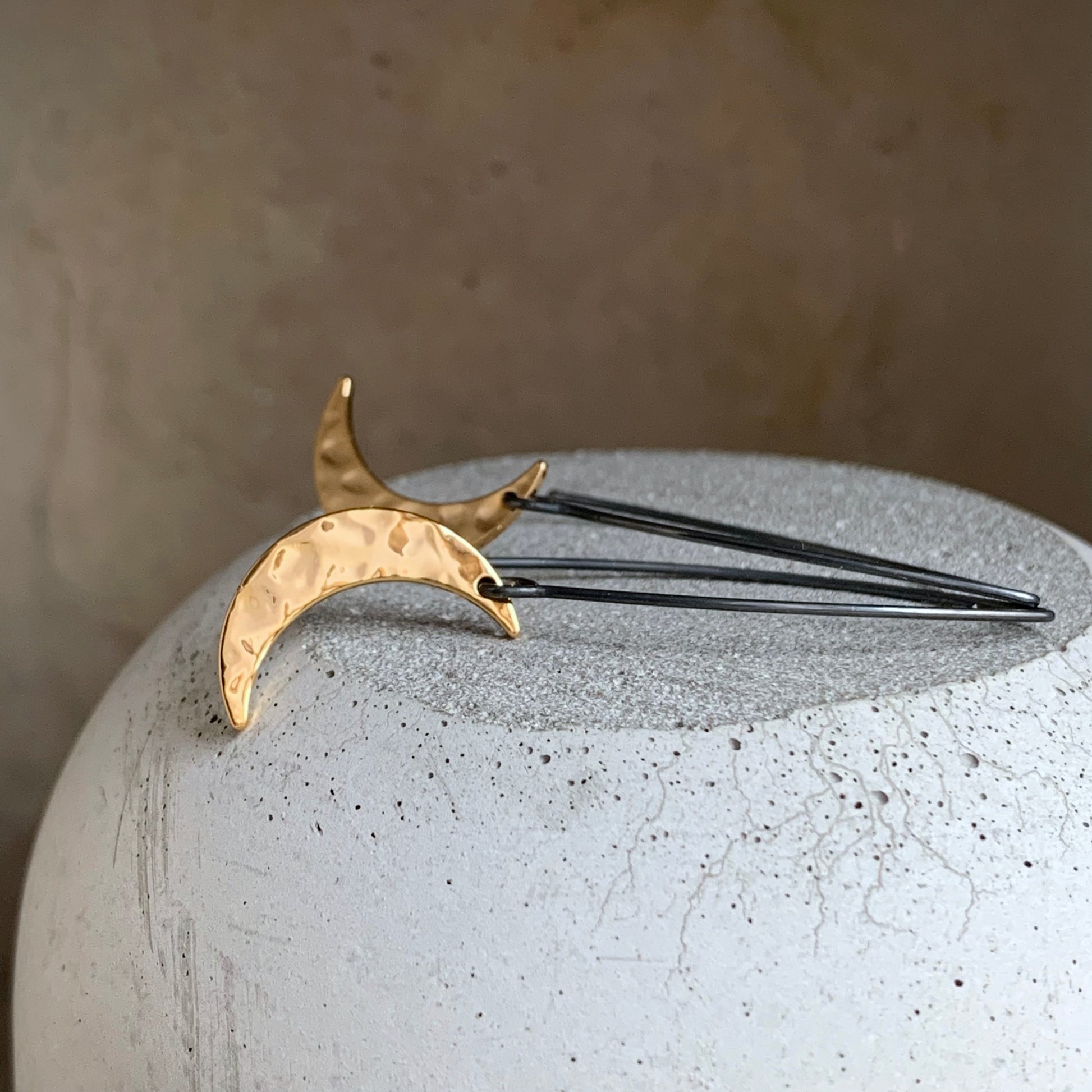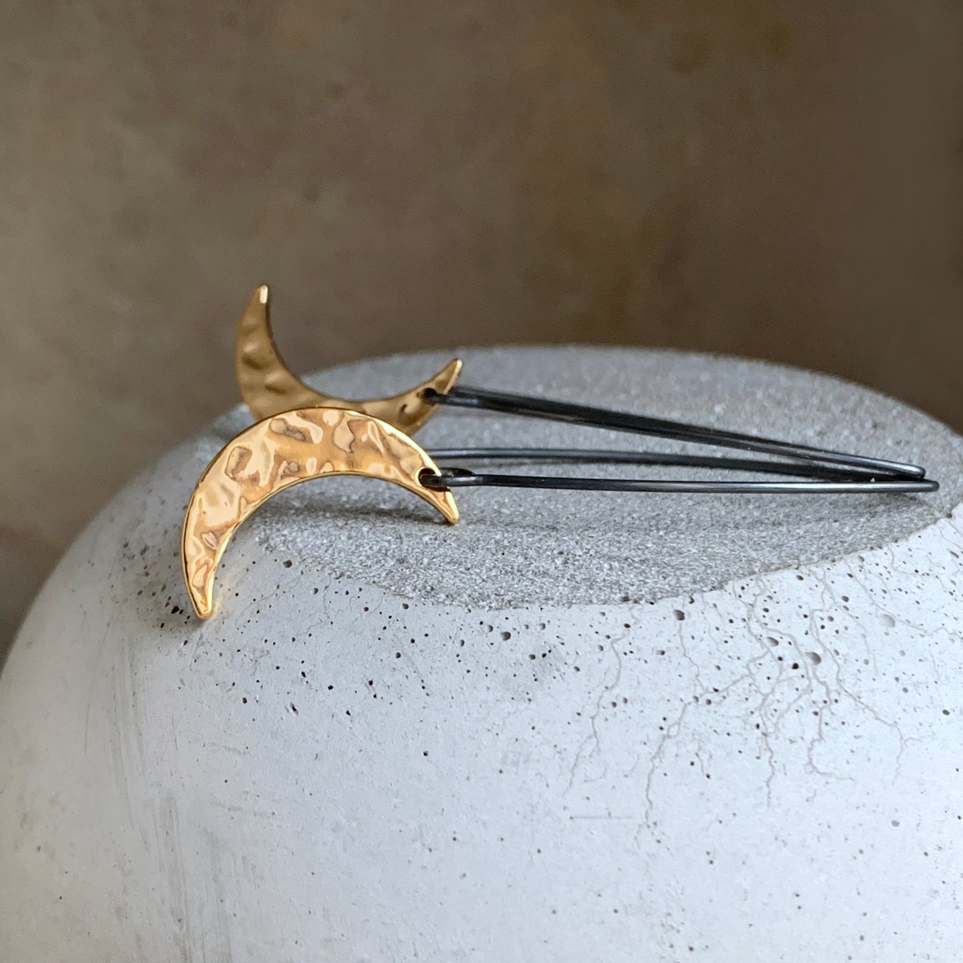 Pendientes de plata y latón bañado en oro. Las medias lunas están elaboradas en latón bañado en oro con una superficie brillante, repujada y pulida que refleja la luz con gran belleza. De forma delicada, cuelgan de largos y llamativos alambres de plata oscura que contrastan elegantemente con el cálido tono dorado de las lunas.