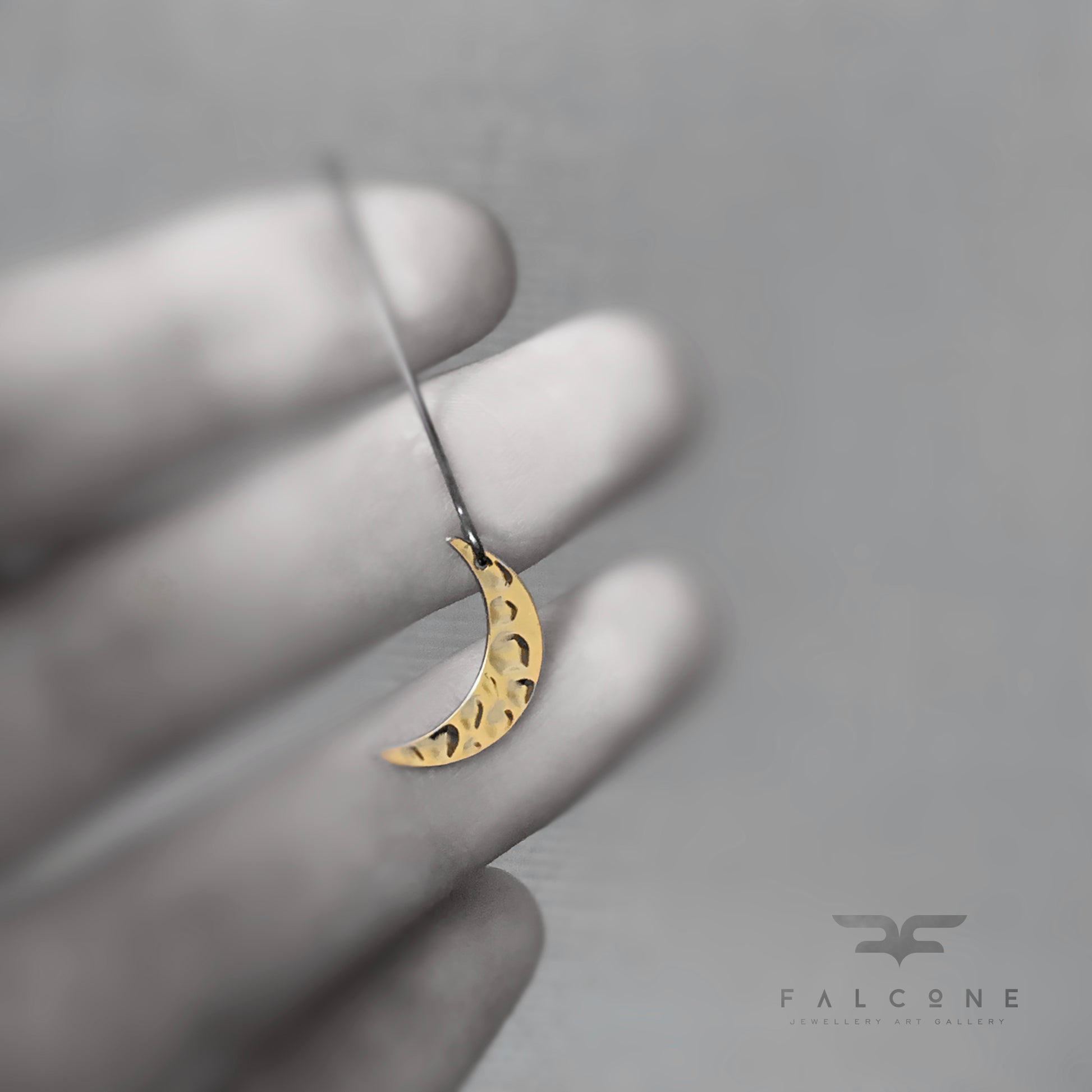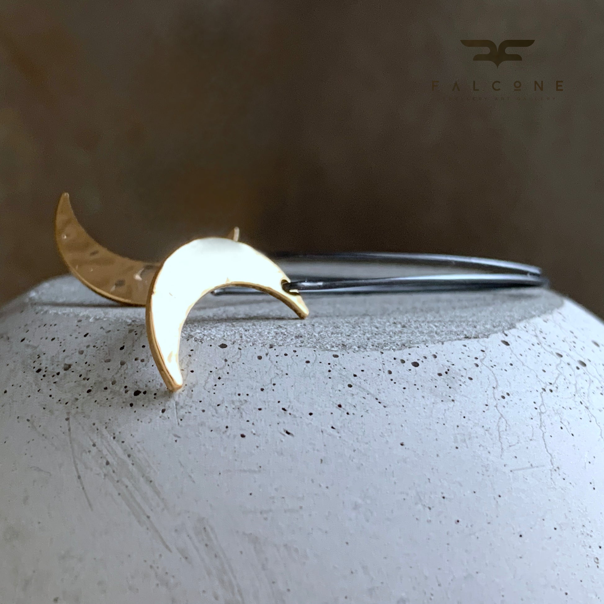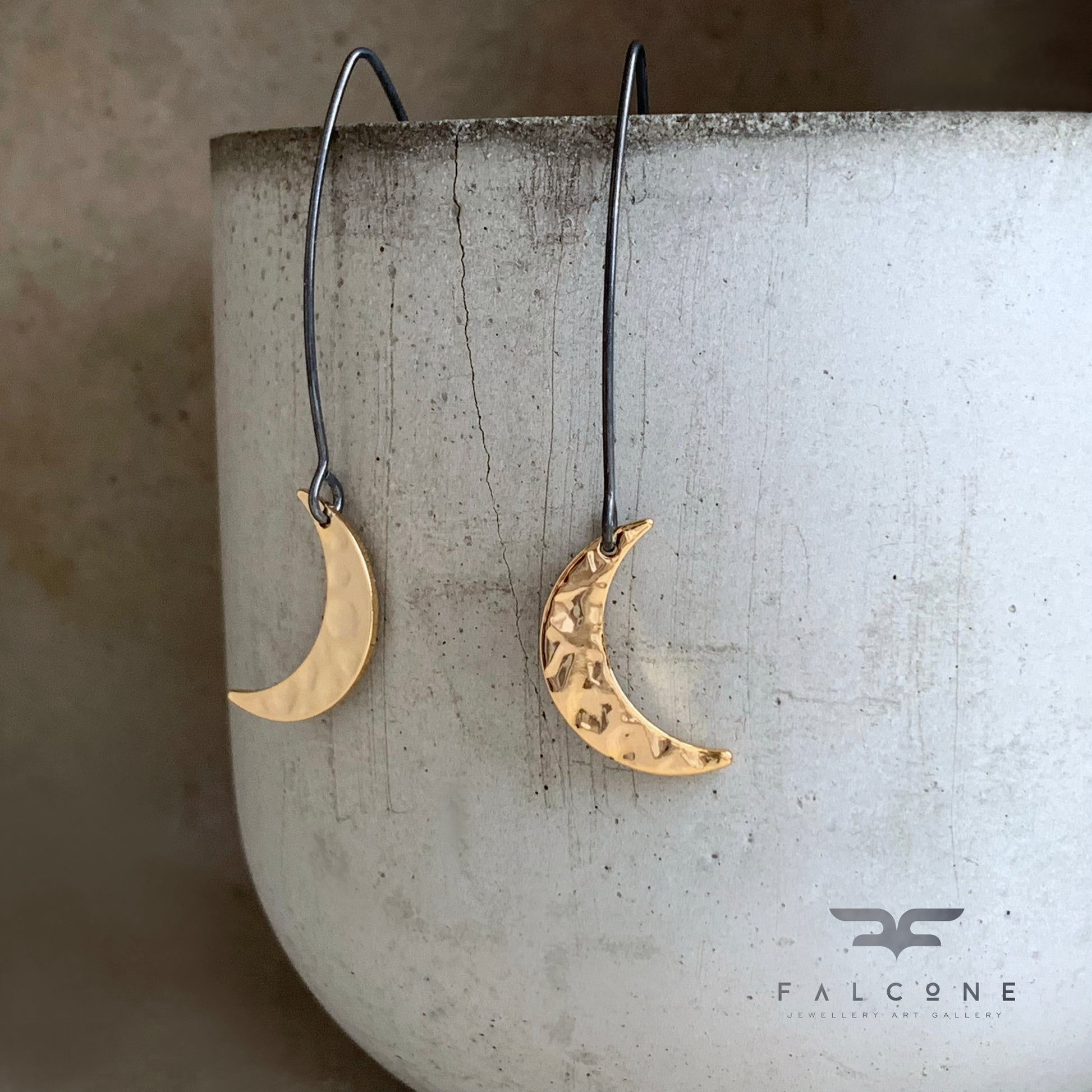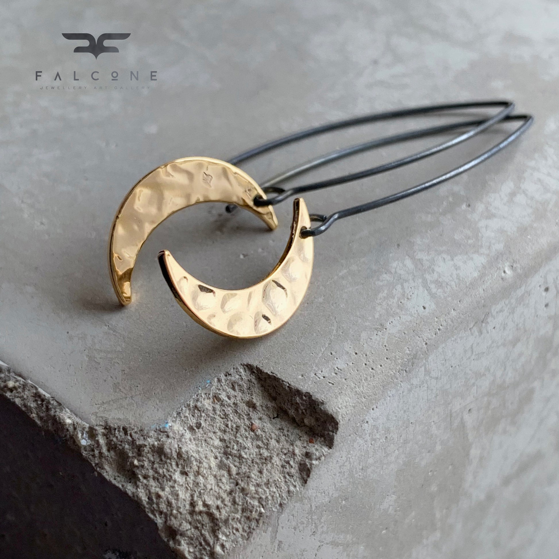 Pendientes de plata y latón bañado en oro. Las medias lunas están elaboradas en latón bañado en oro con una superficie brillante, repujada y pulida que refleja la luz con gran belleza. De forma delicada, cuelgan de largos y llamativos alambres de plata oscura que contrastan elegantemente con el cálido tono dorado de las lunas.