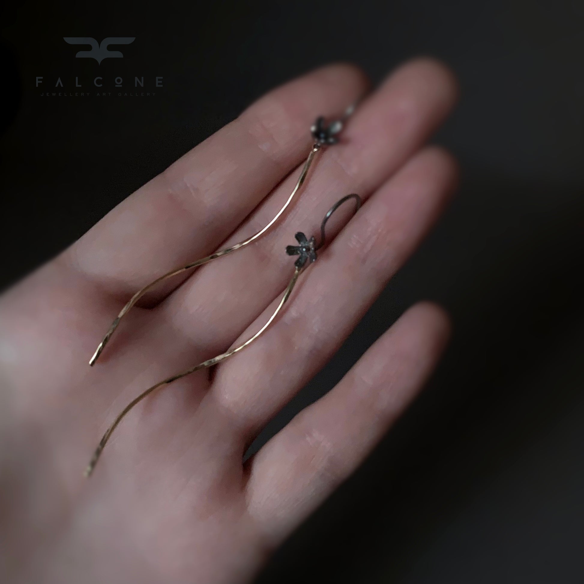 Elegantes y finos pendientes con forma de largos tallos dorados, ligeramente retorcidos y ondulados. Cuelgan de ganchos de plata decorados con pequeñas flores plateadas.