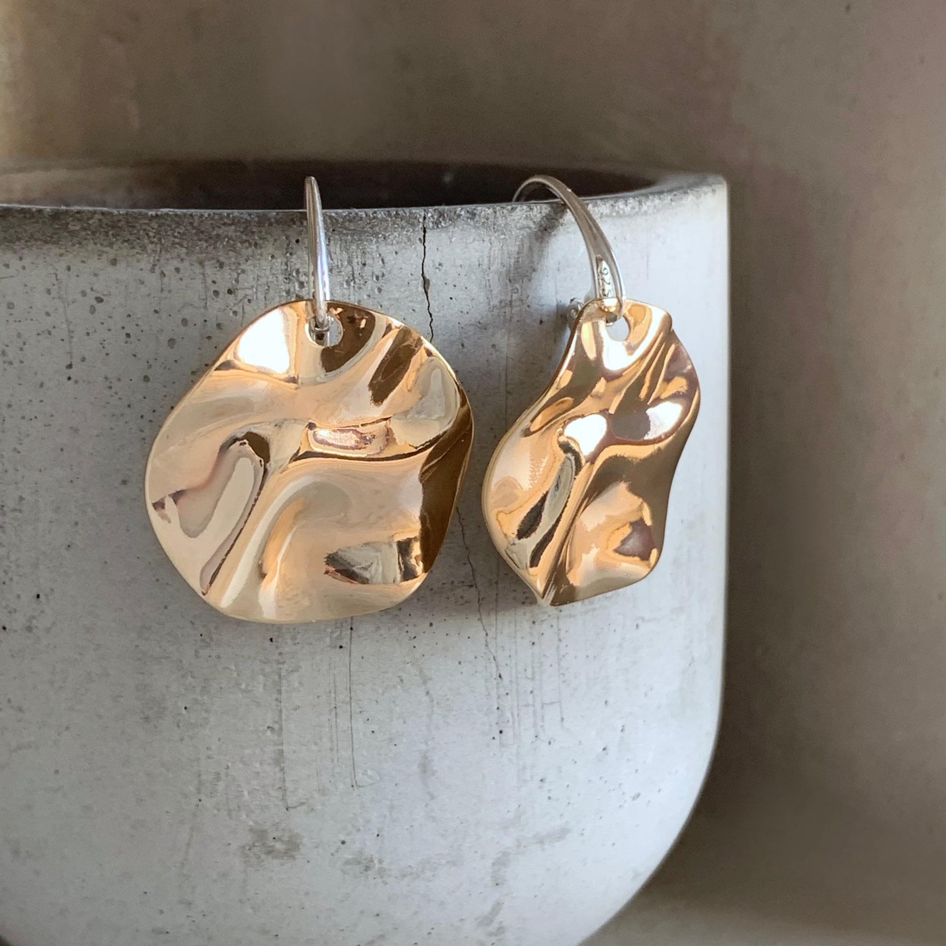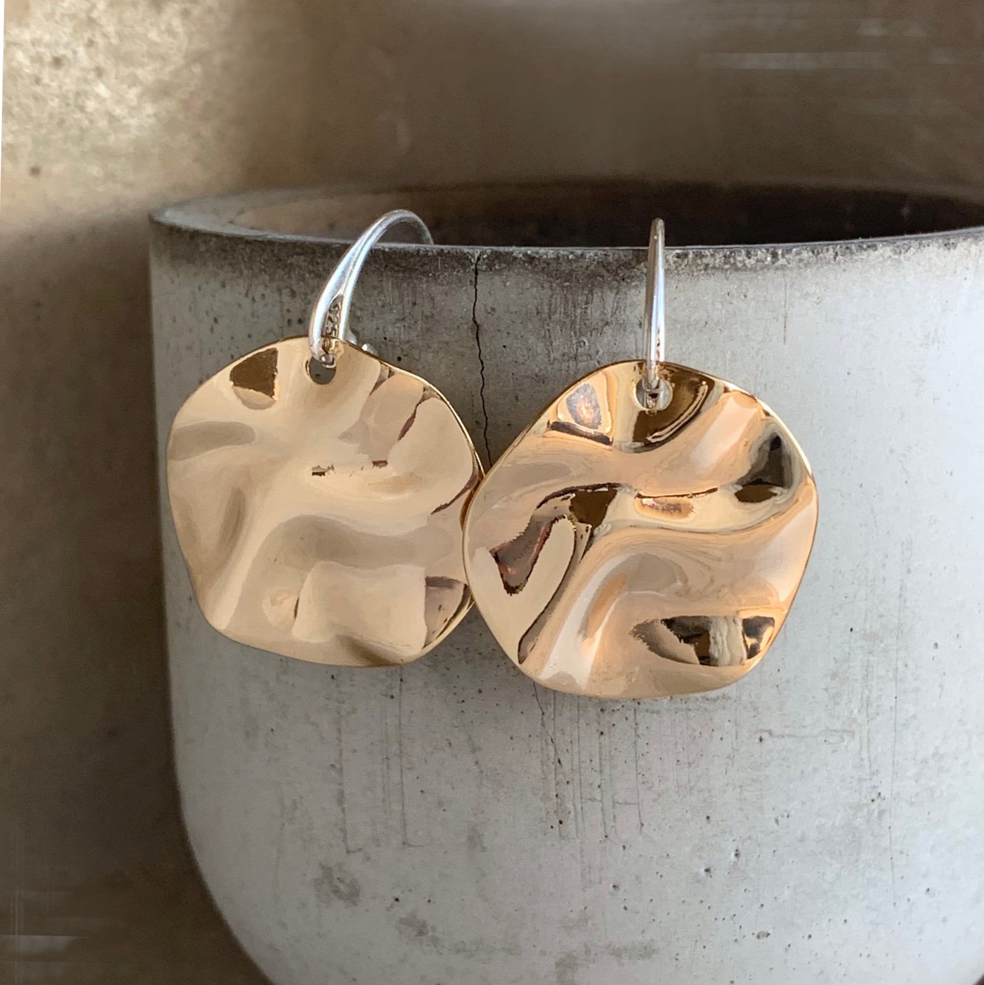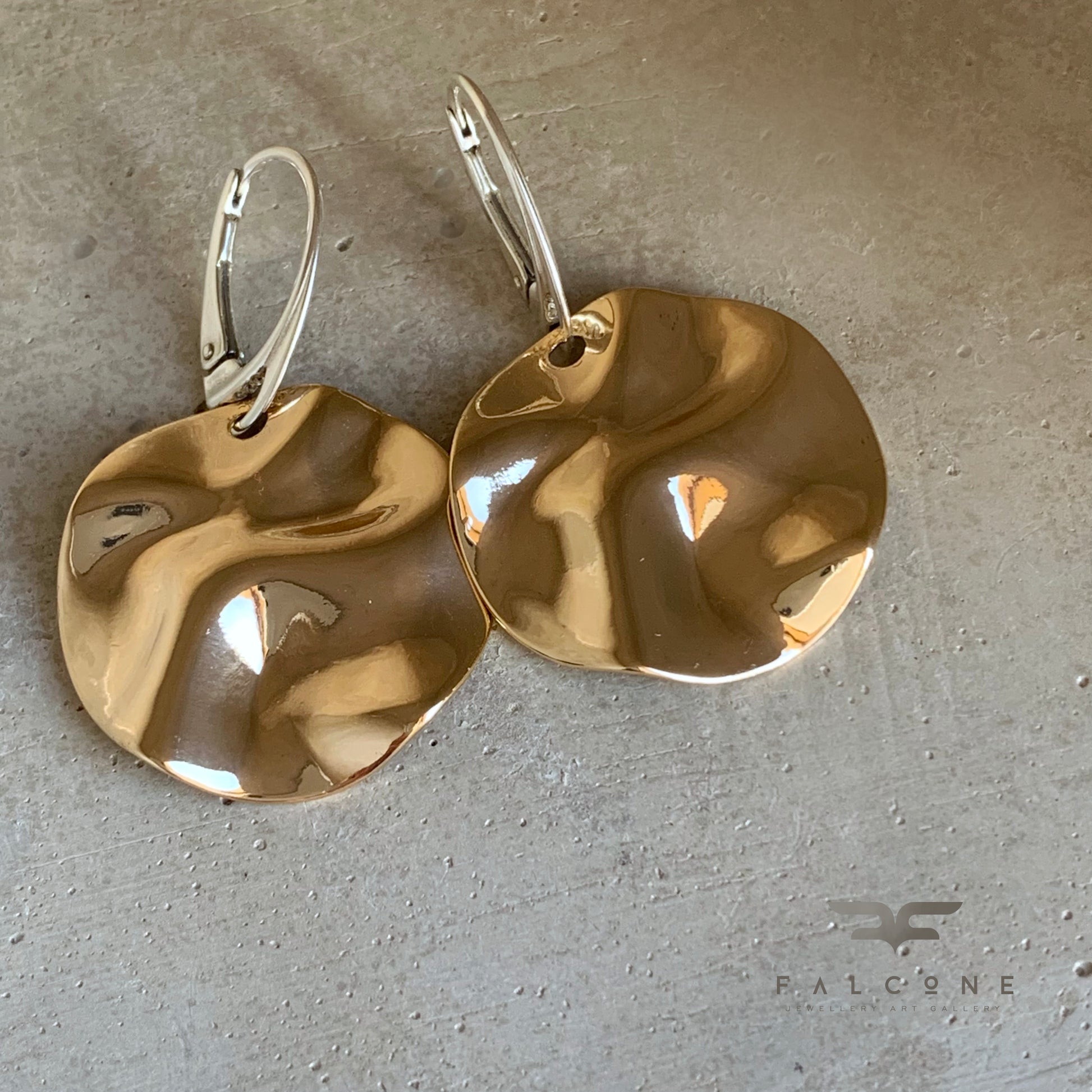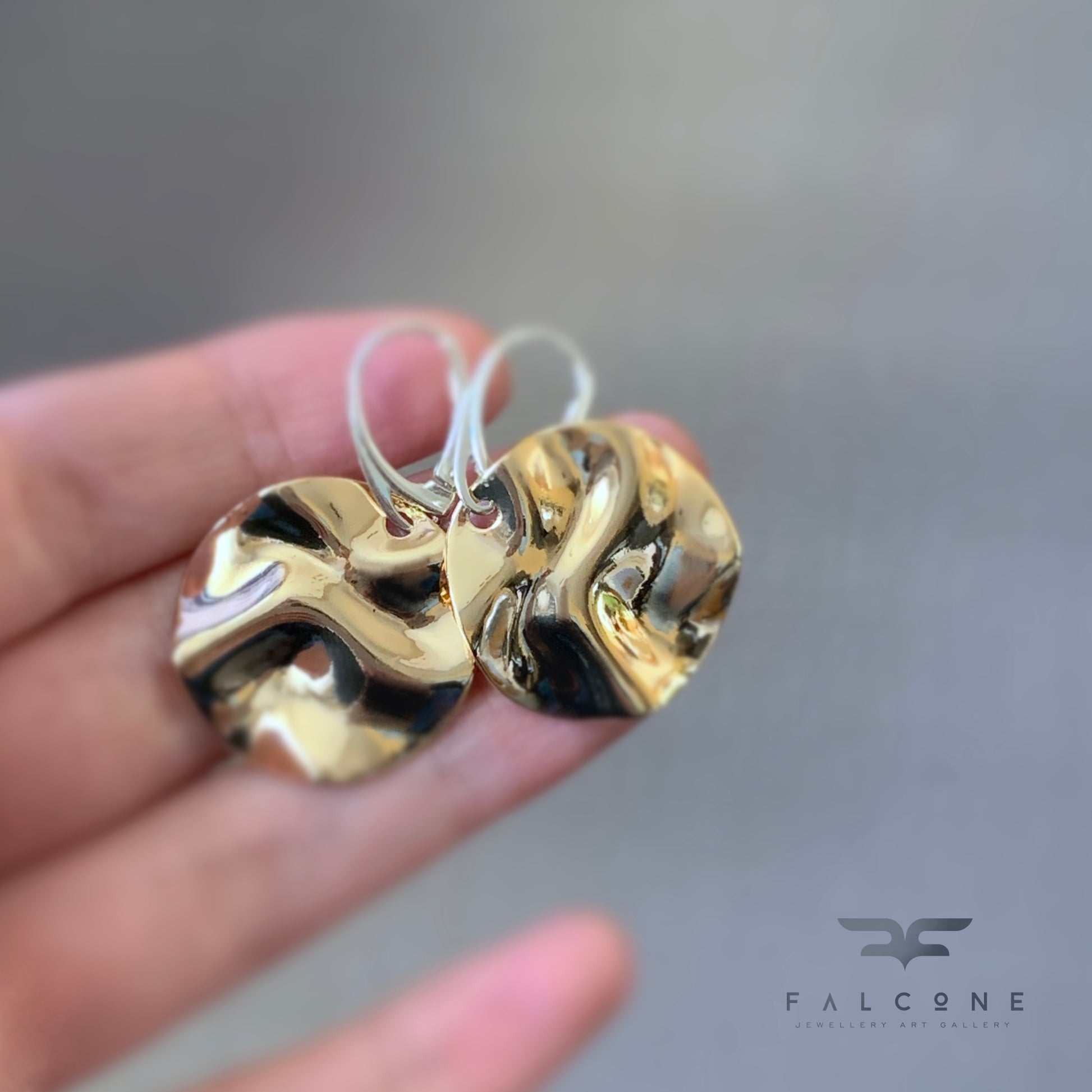 Estos pendientes circulares geométricos presentan una superficie irregular y suavemente ondulada que capta y refleja la luz con gran belleza. El baño de oro aporta un brillo cálido, que contrasta con los elegantes ganchos de plata de ley (925) en tonos fríos.