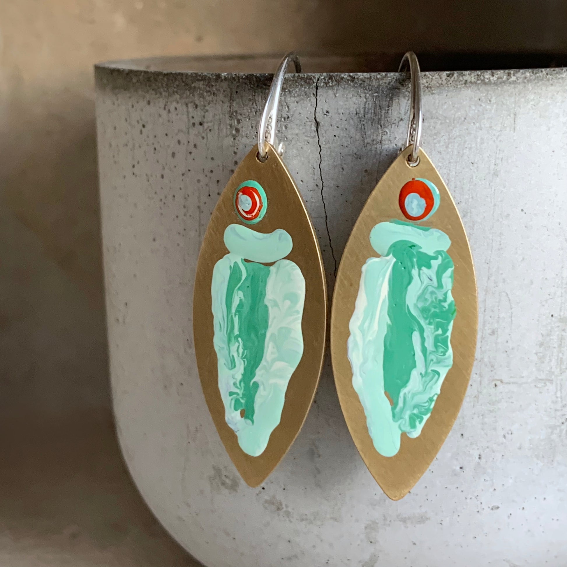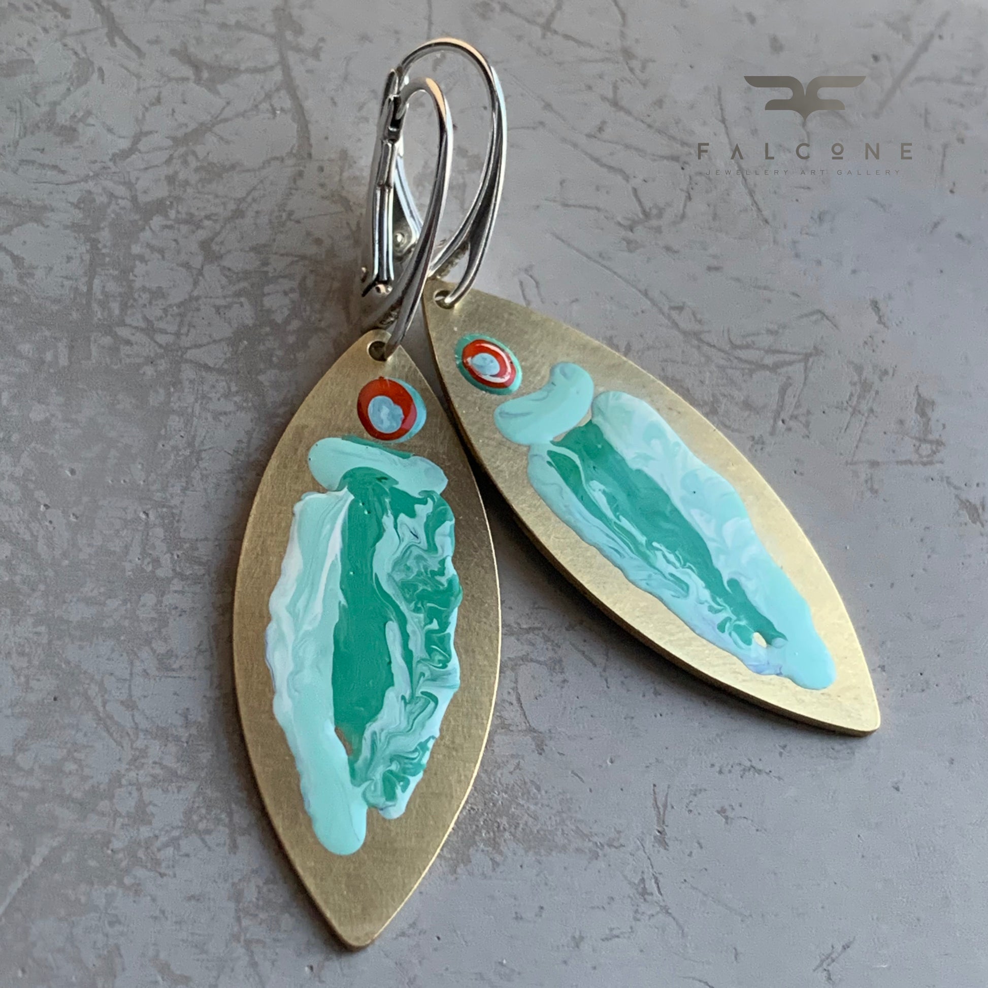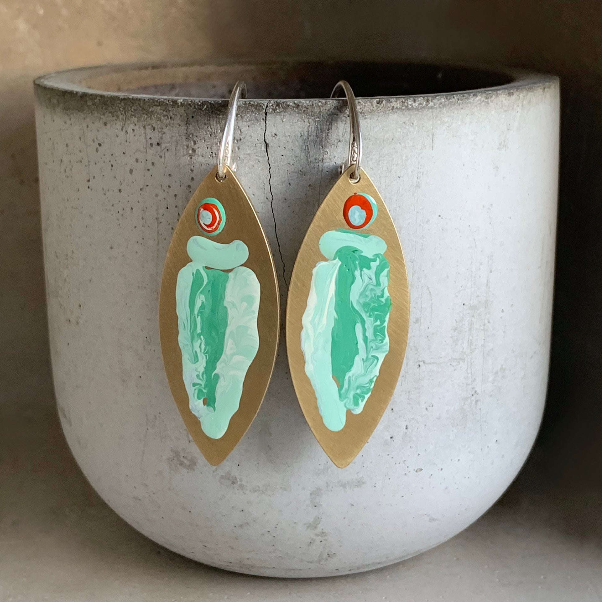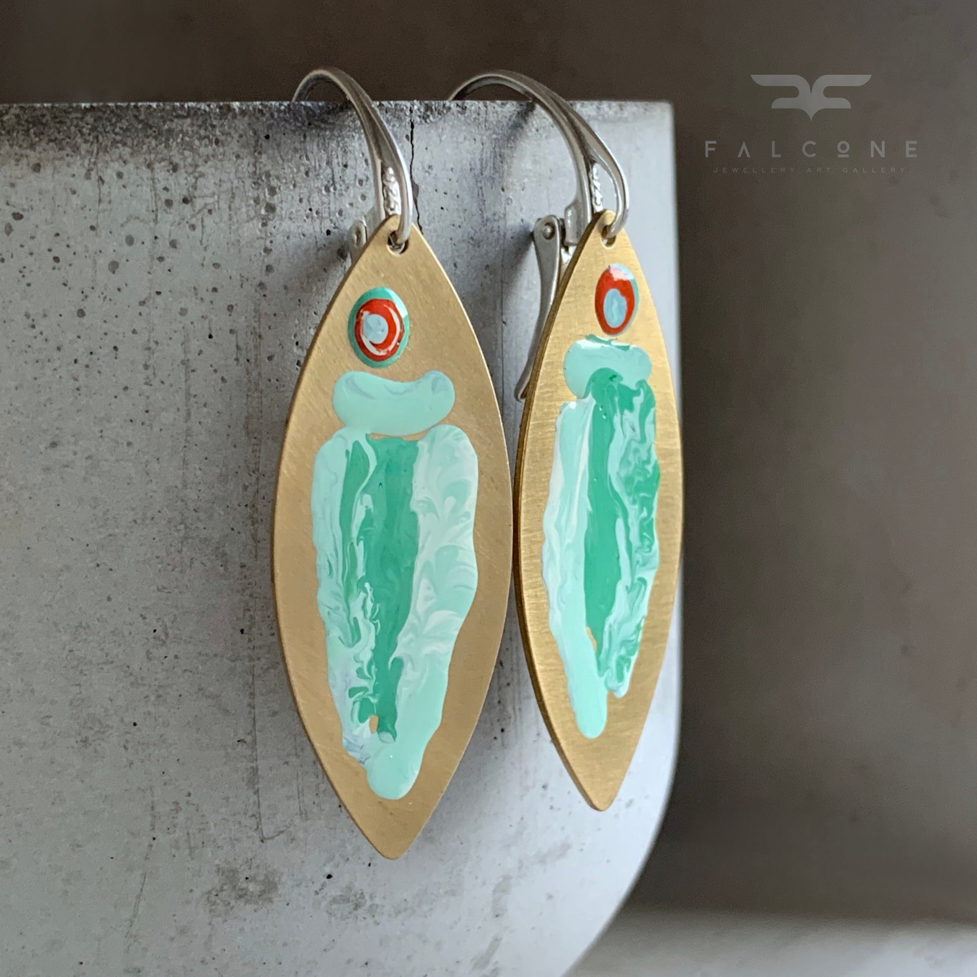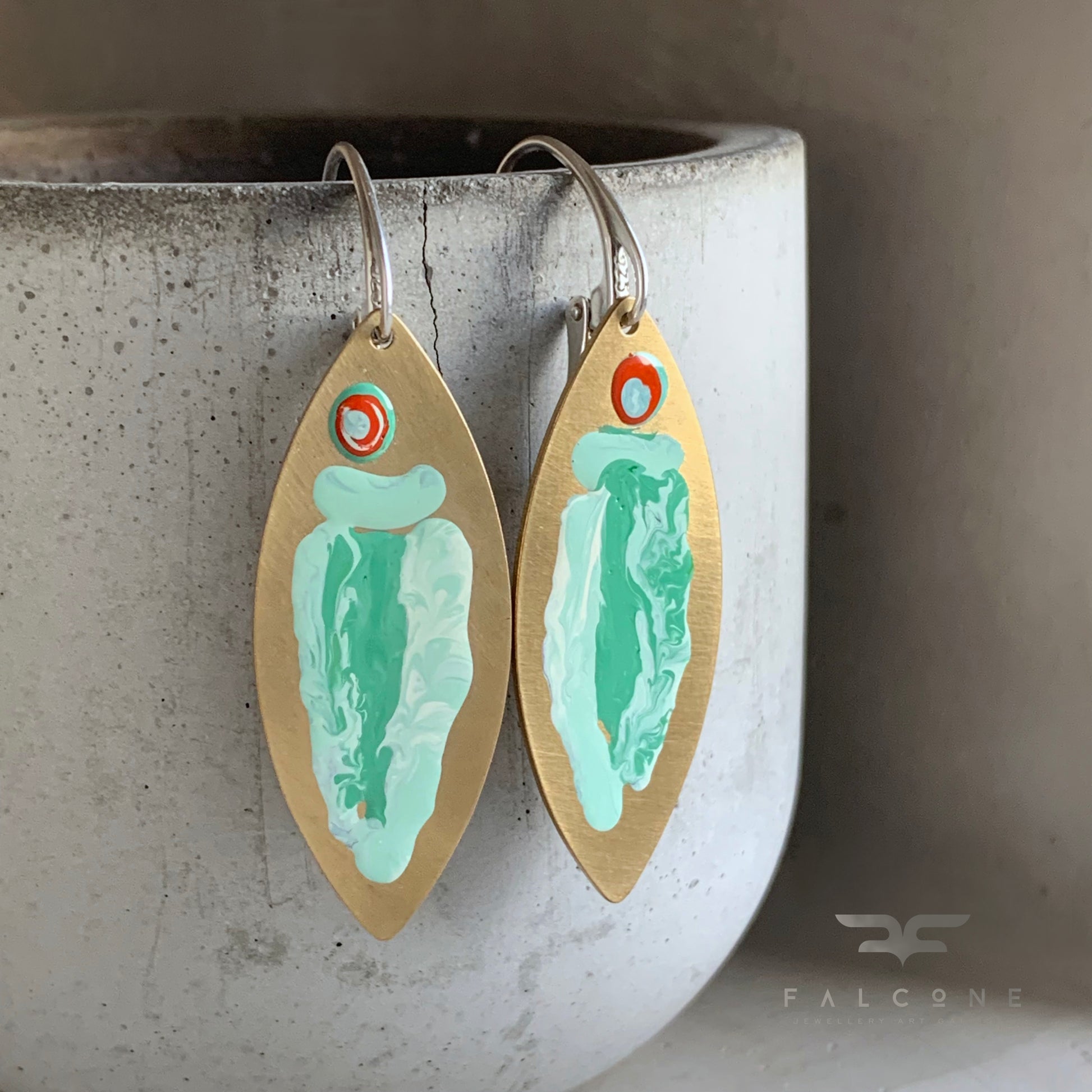 Pendientes de plata de ley y latón. La base de latón natural está decorada con esmalte aplicado a mano con un patrón único inspirado en las paletas de colores subacuáticos. El fresco verde salvia se transforma en un suave celadón con toques de blanco cremoso. Los ojos, acentuados con cálidos puntos de esmalte rojo, realzan sutilmente su brillo. Los colores se mezclan para crear un efecto irregular y distintivo que cambia con la luz. Acabados con brillantes ganchos de plata de ley 925 con cierre de palanca.