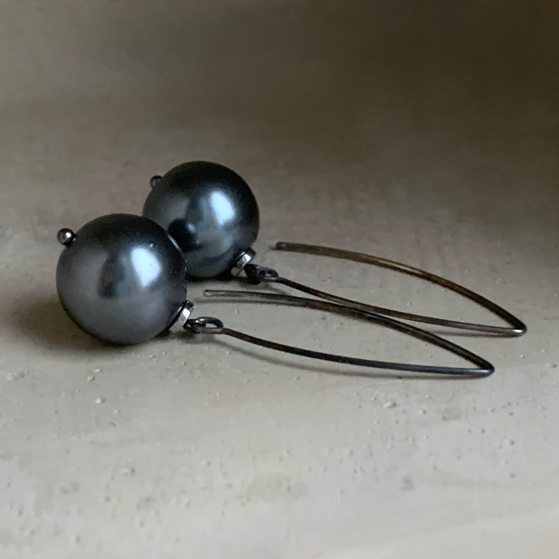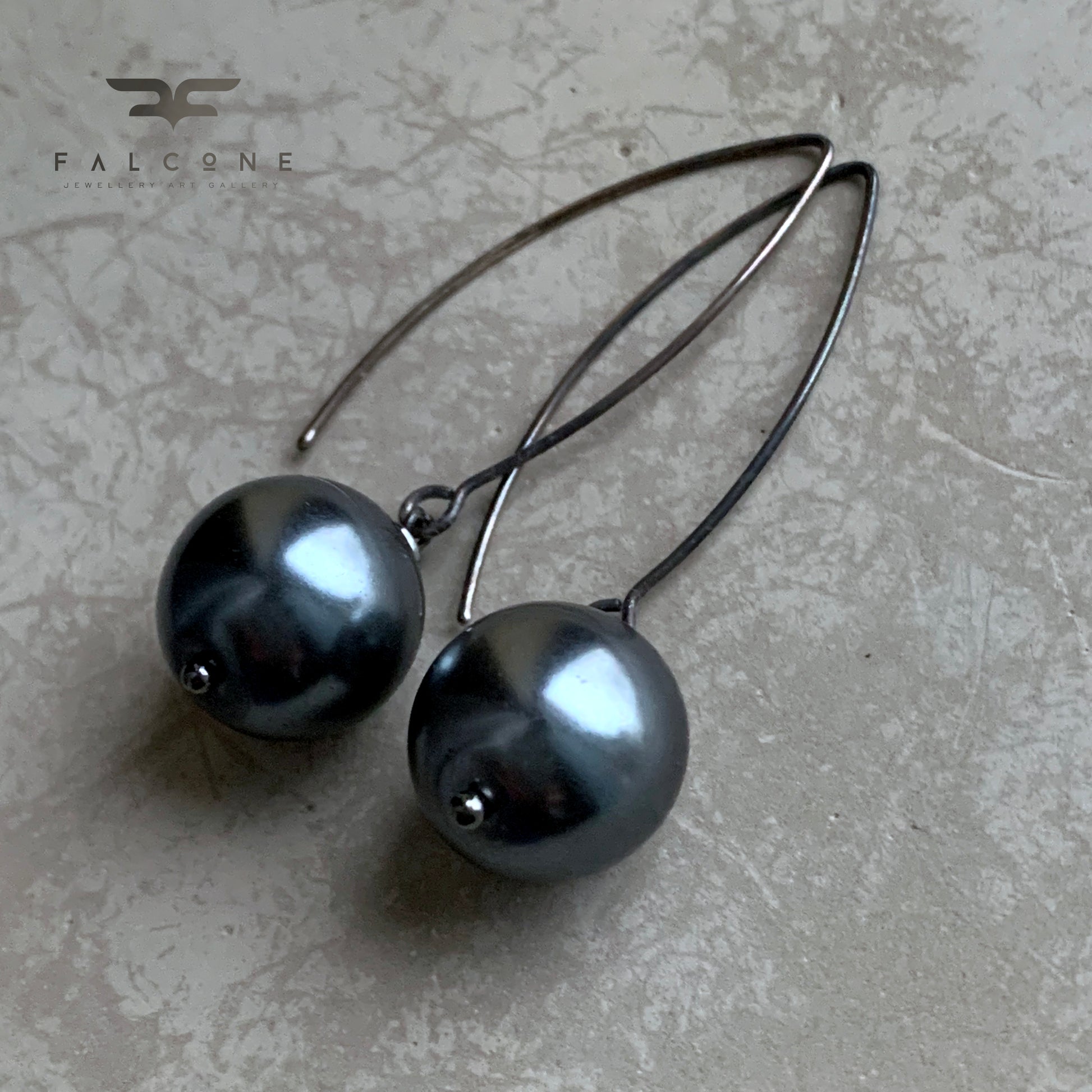 Grandes y llamativas esferas perladas en un tono gris frío, combinadas con plata y suspendidas de elegantes ganchos largos.