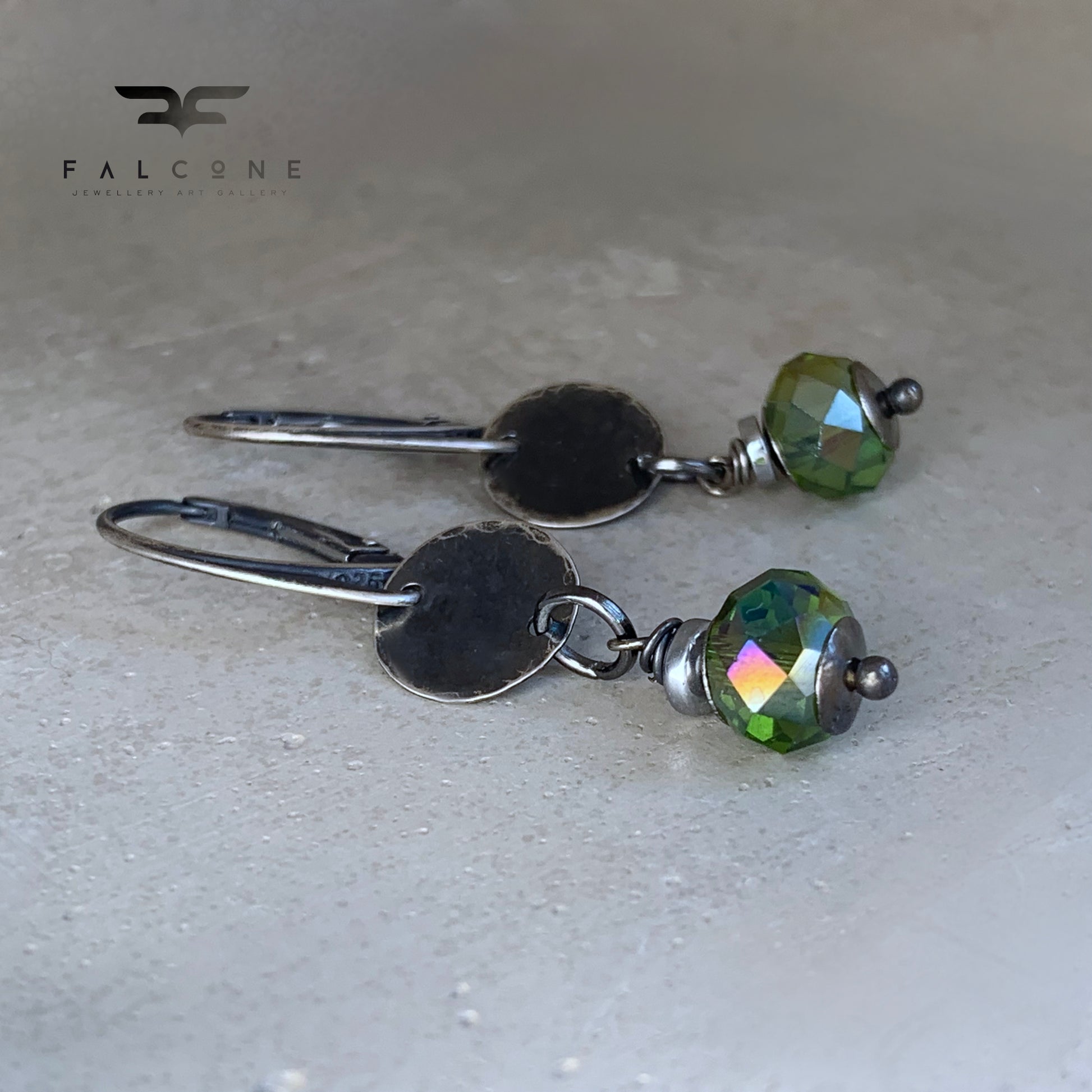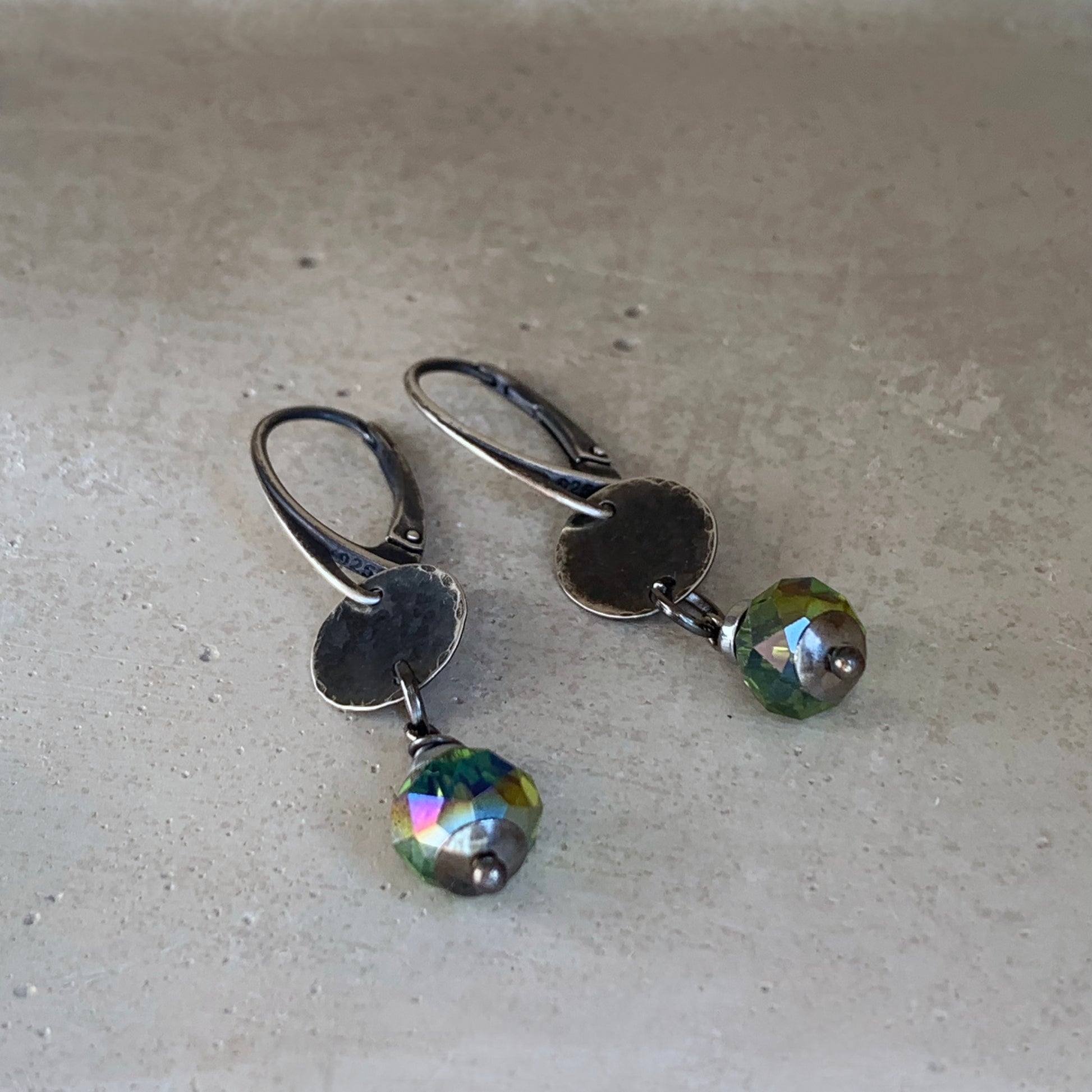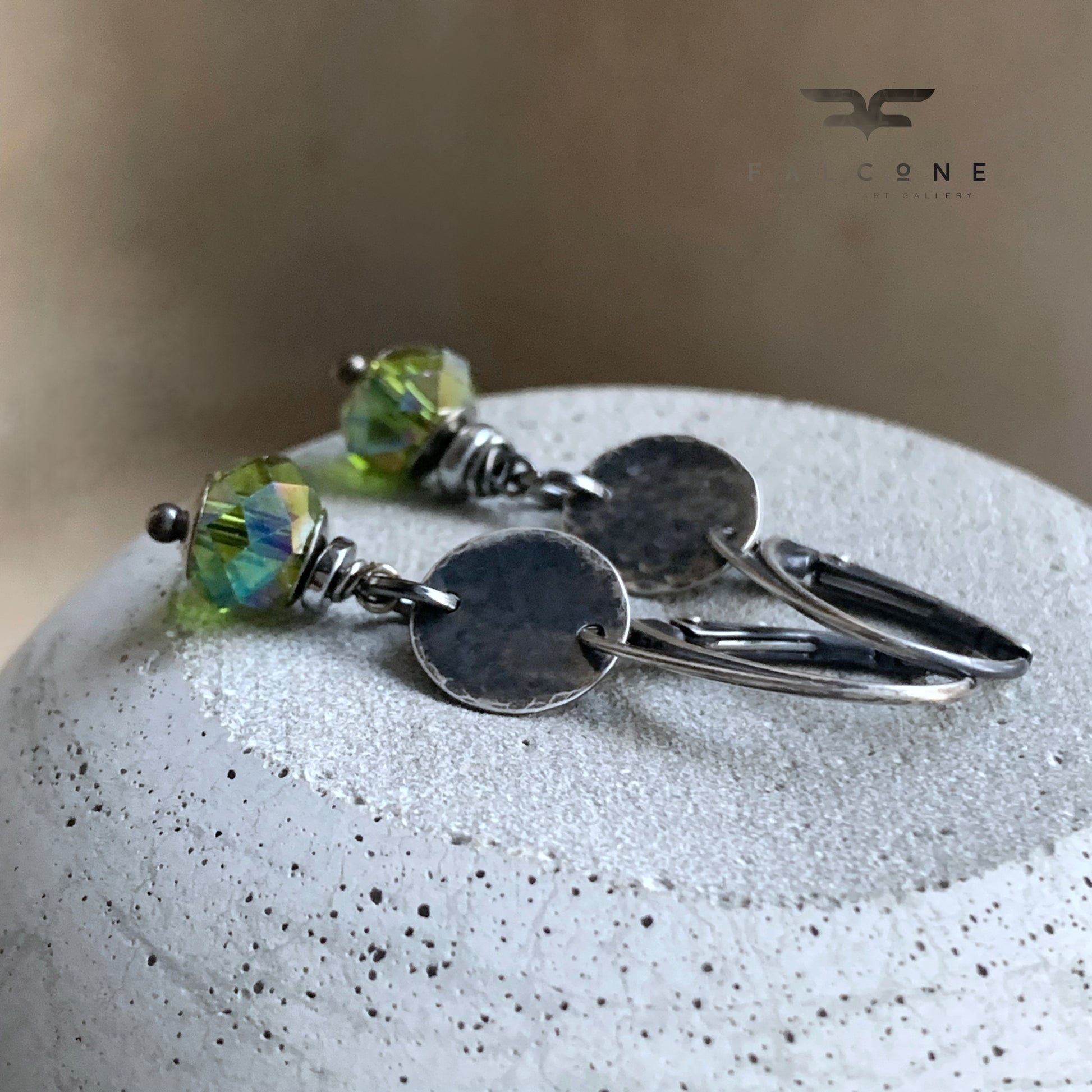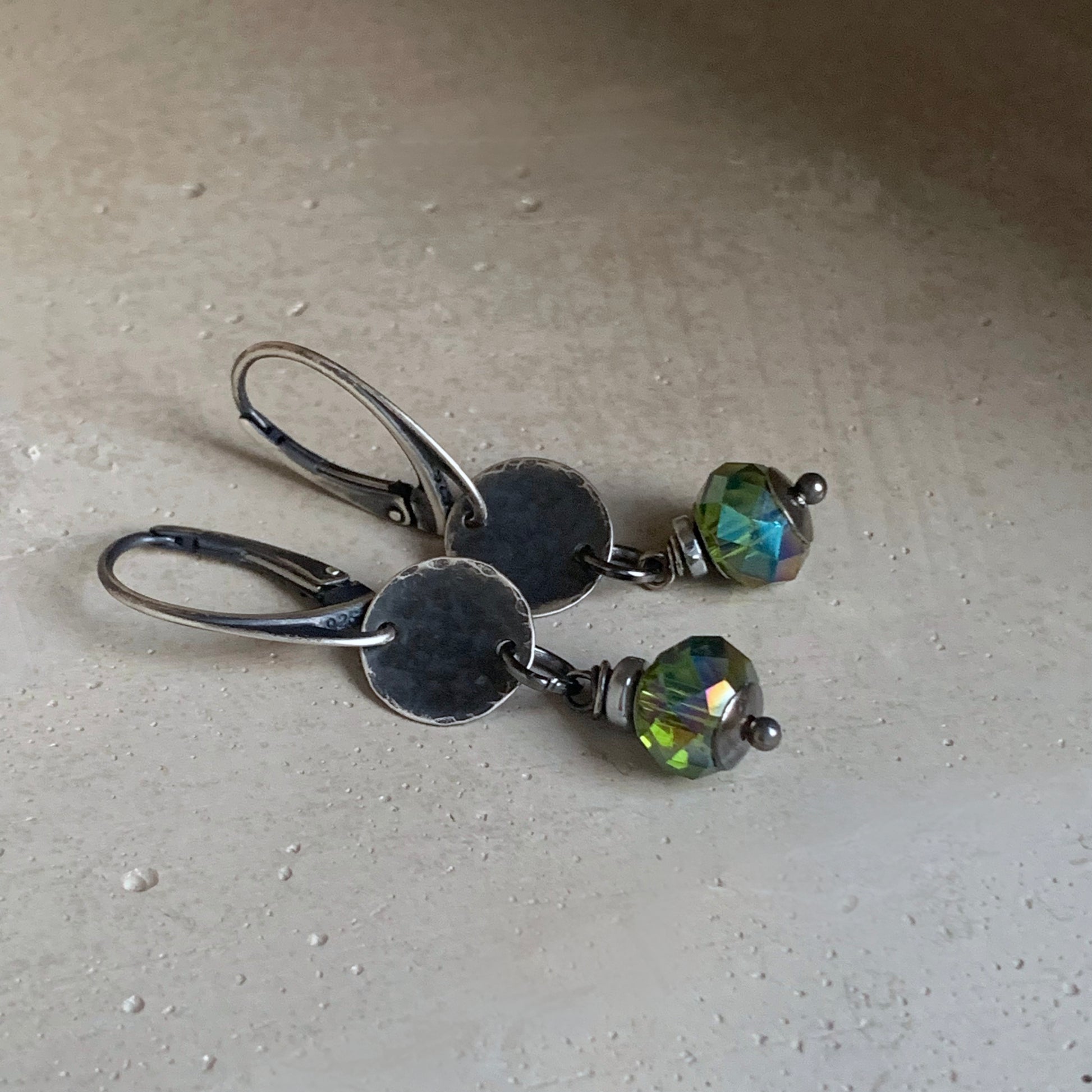 Pendientes de plata y cristal. Las rondellas de cristal verde facetado que parecen pequeños faroles con vidrieras de colores están montadas en plata oxidada y oscurecida. La plata oscura, con reflejos plateados más claros y rastros de trabajo repujado, le da a los pendientes un carácter rústico.