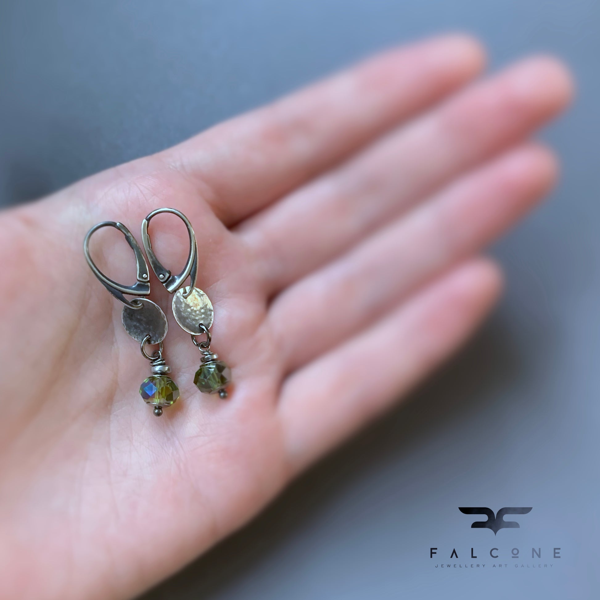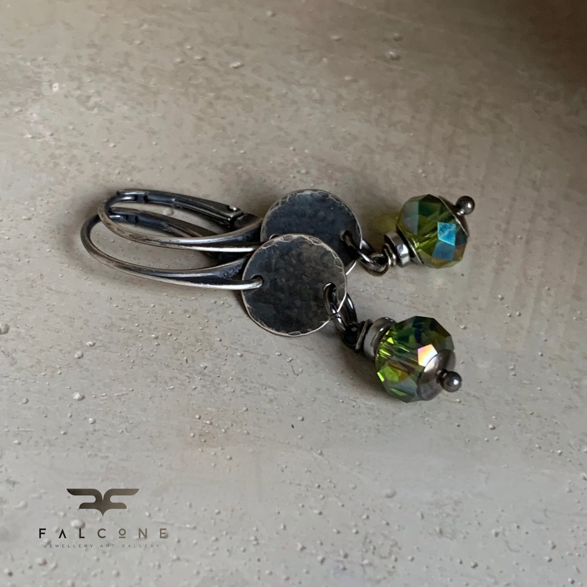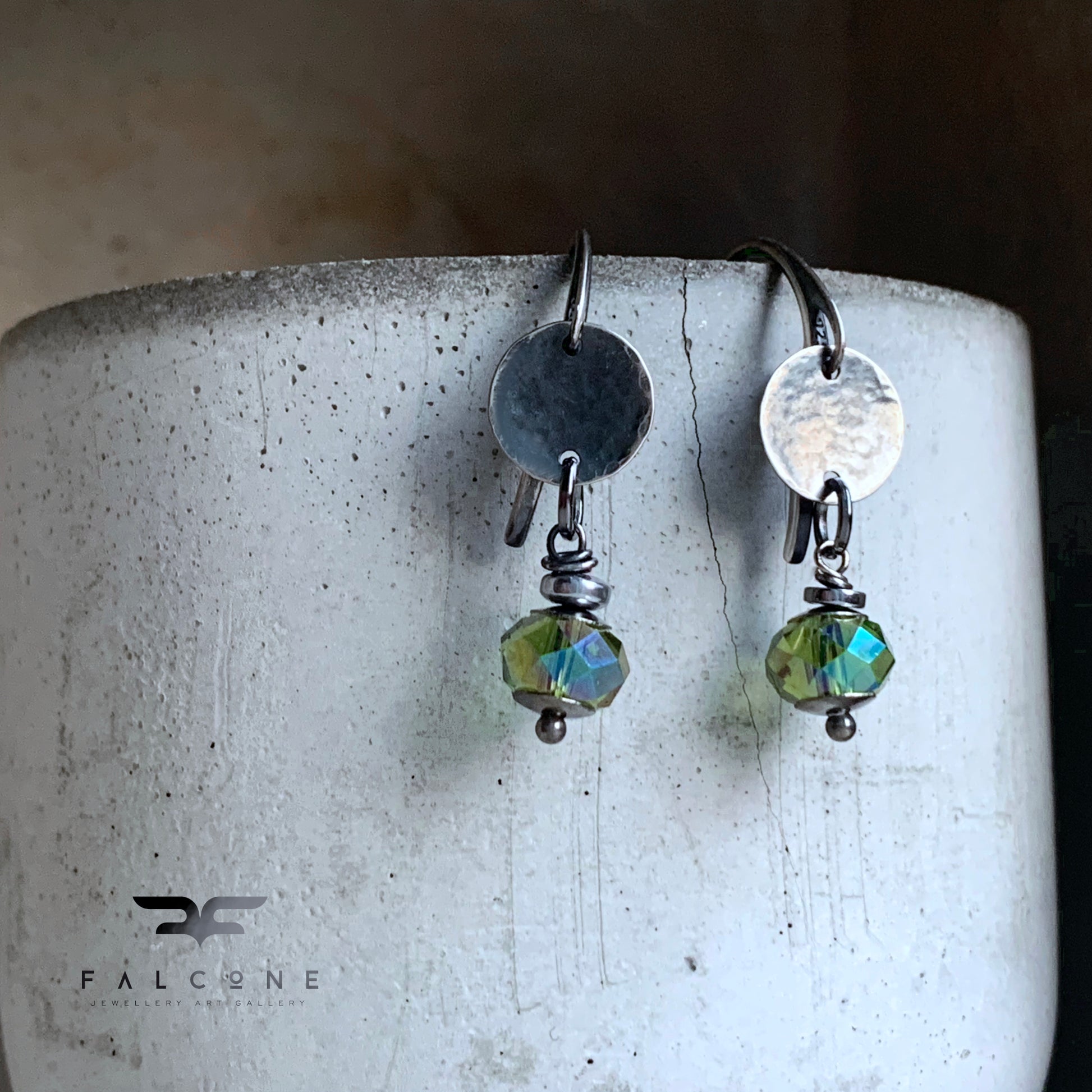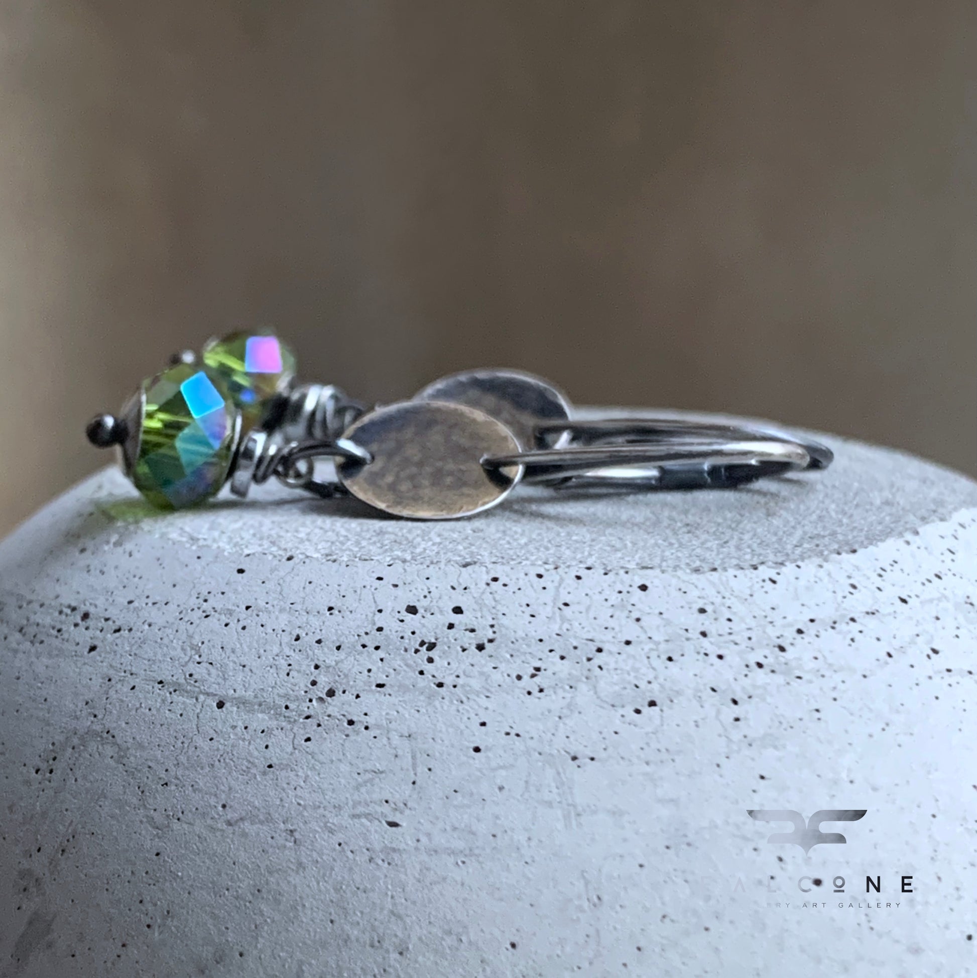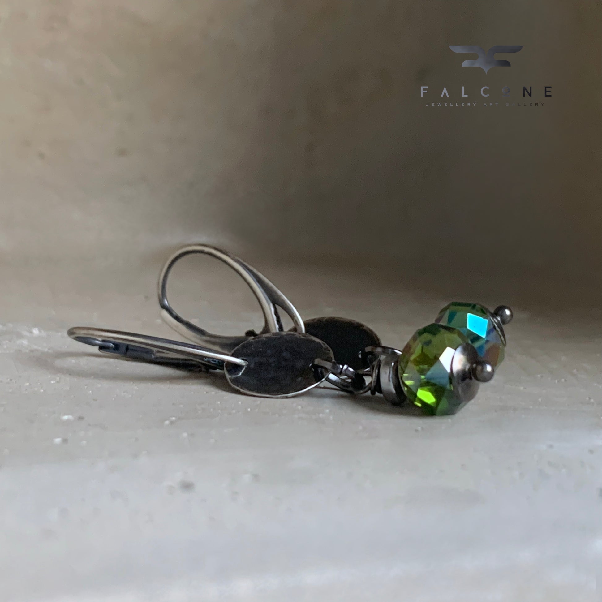 Pendientes de plata y cristal. Las rondellas de cristal verde facetado que parecen pequeños faroles con vidrieras de colores están montadas en plata oxidada y oscurecida. La plata oscura, con reflejos plateados más claros y rastros de trabajo repujado, le da a los pendientes un carácter rústico.