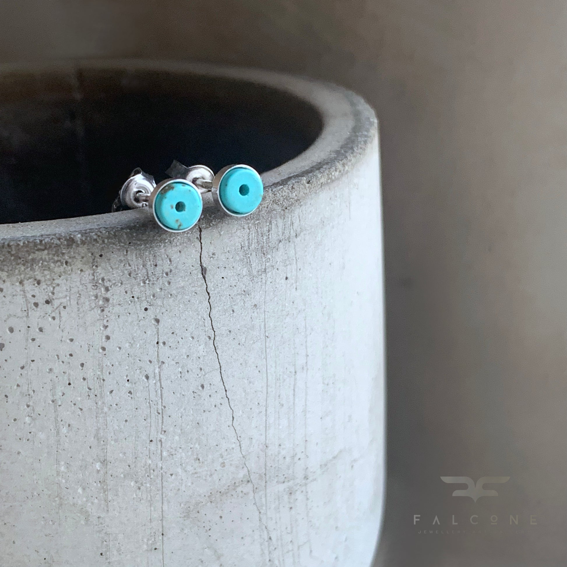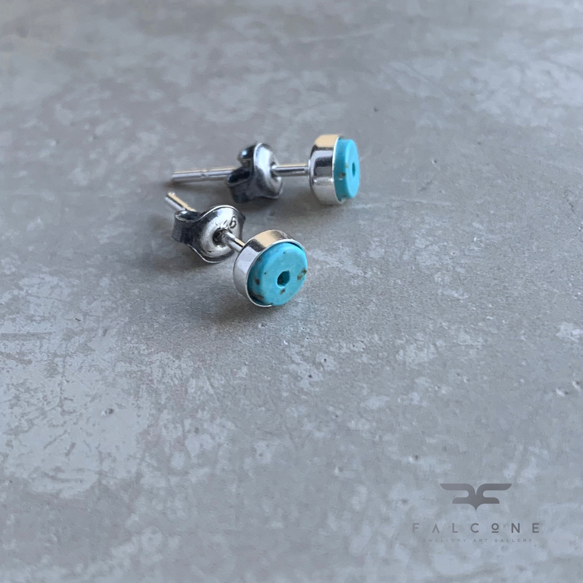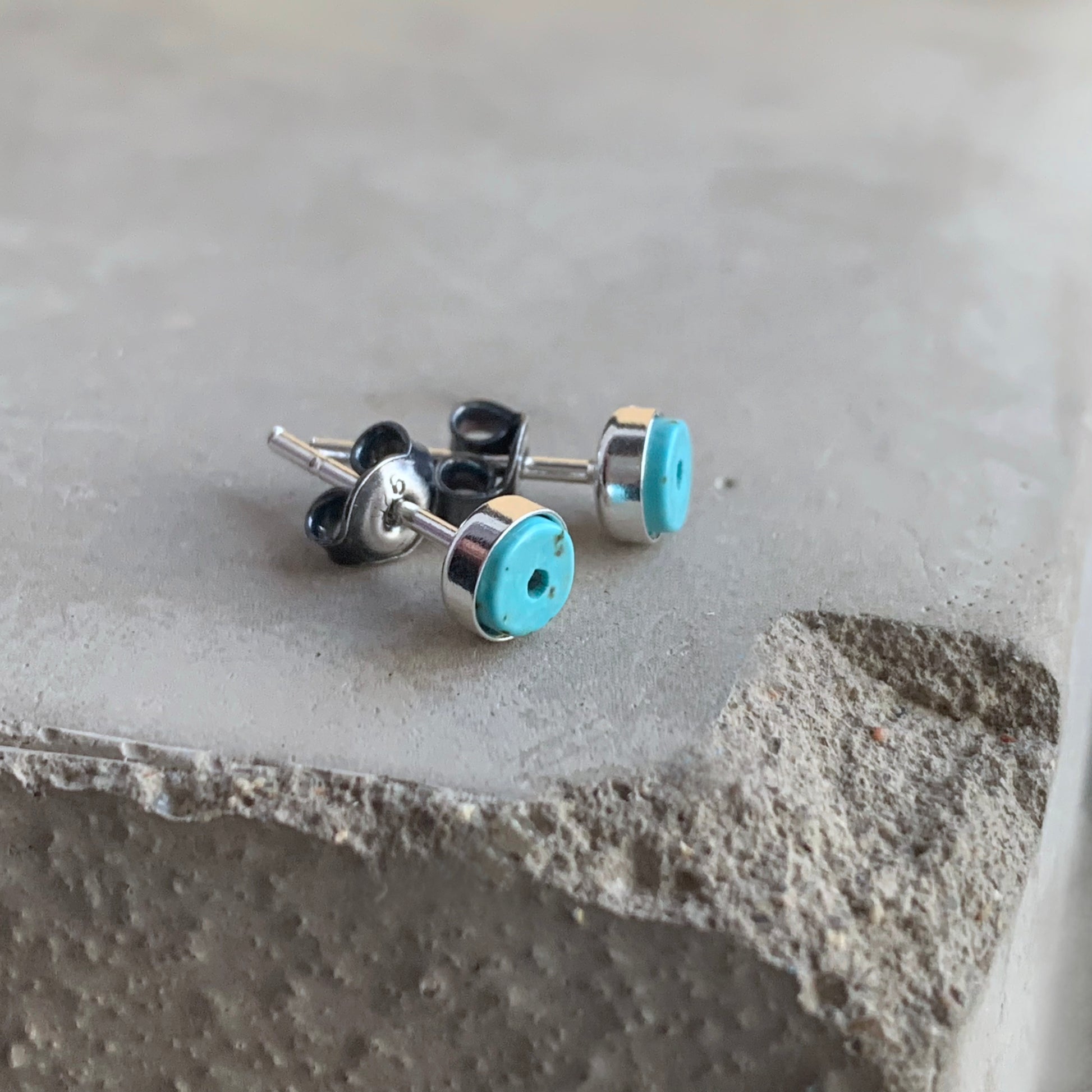 Pendientes de botón elaborados en plata de ley pulida brillante. Presentan cabujones de turquesa en un suave tono azul claro pastel. Las pequeñas motas oscuras en las piedras les aportan un carácter natural y singularidad.