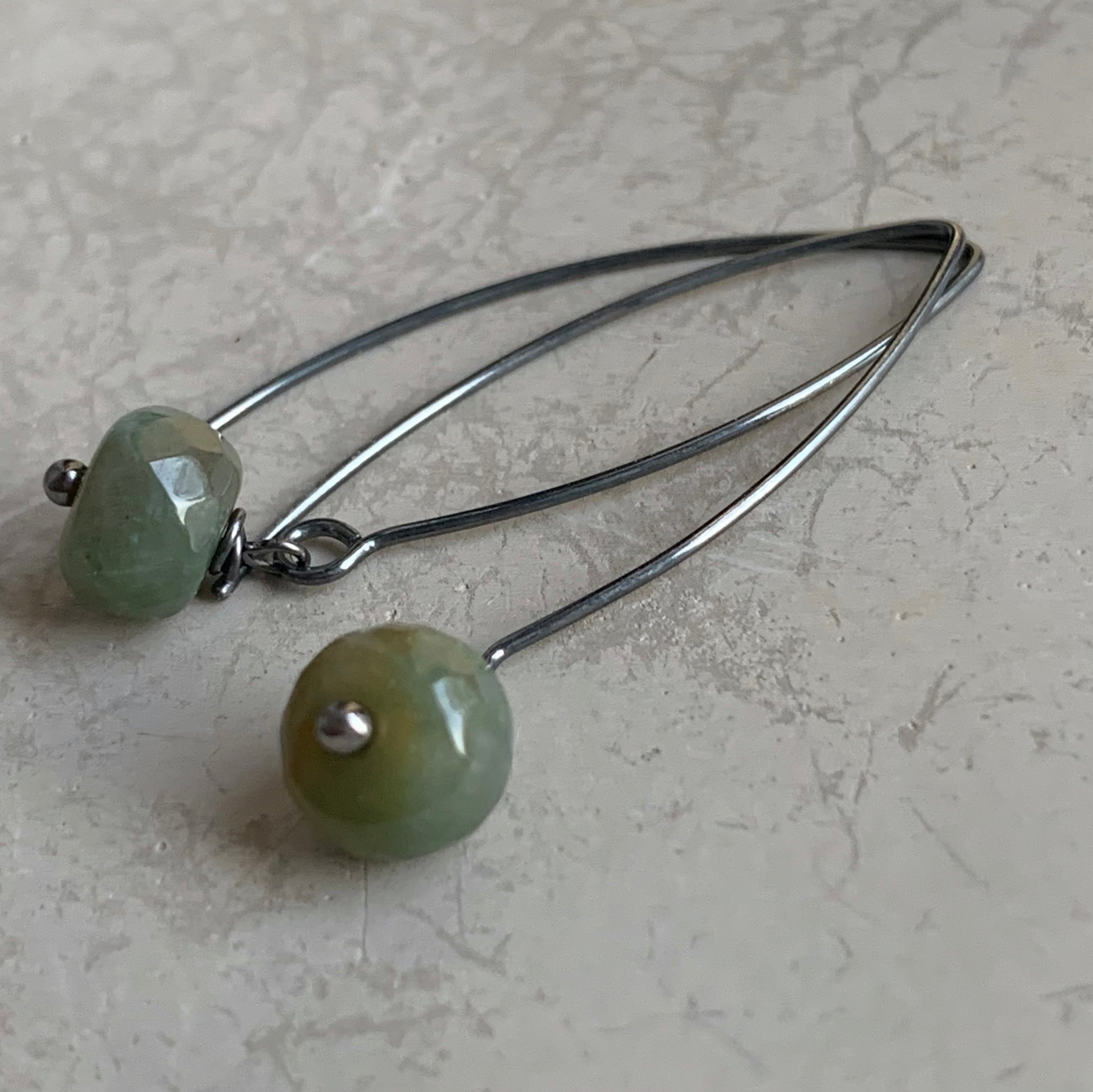 Earrings made of sterling silver and Indian agate gemstones. The stones, shaped as smooth rondelles, display earthy green tones blended with milky grey and warm beige hues. Their colours shift subtly depending on the angle of light and the stone’s position. Finished with long, elegant 925 sterling silver fish hook earwires.