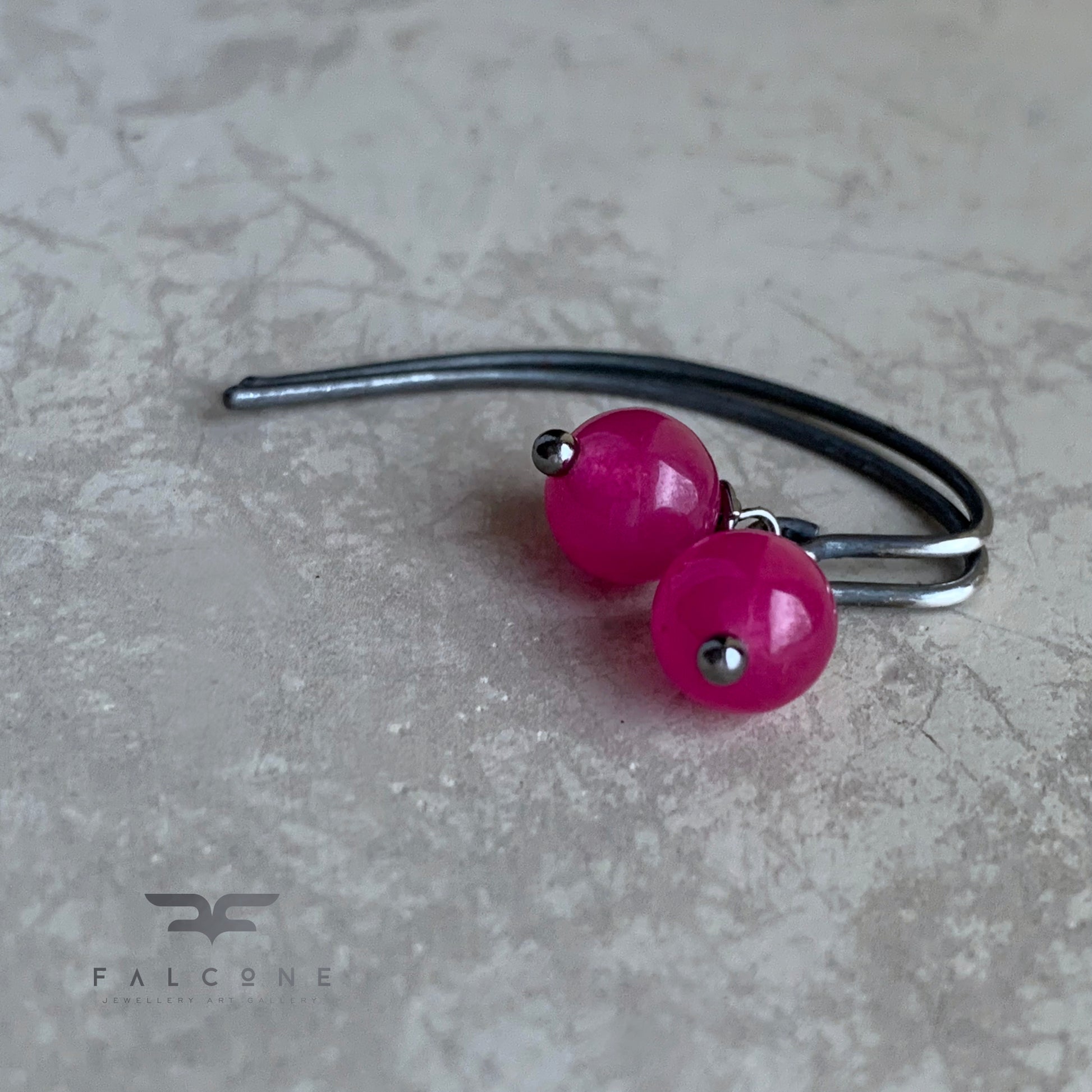 Earrings made of sterling silver and natural stones. Small agate beads are smoothly polished and display a slightly glassy, translucent structure. The stones show a soft pink colour with subtle hints of fuchsia.
