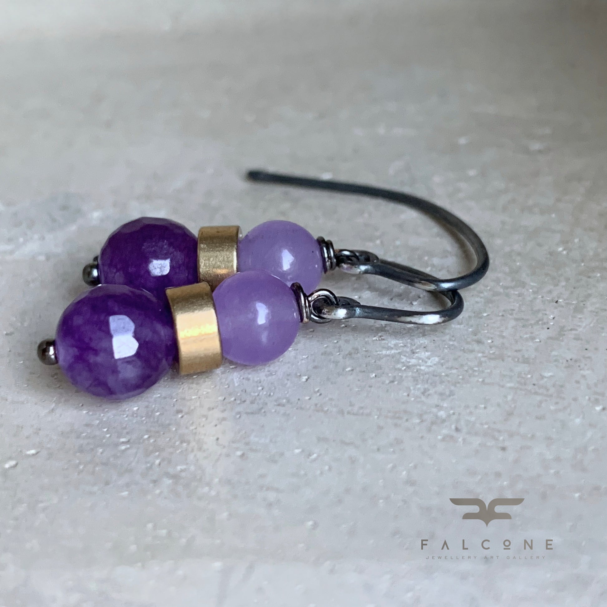 Earrings made of sterling silver, brass, and gemstones. The brass, in a modern minimalist golden form, frames agate and jade beads. Faceted agate spheres in deep purple are paired with smooth pastel jade beads.