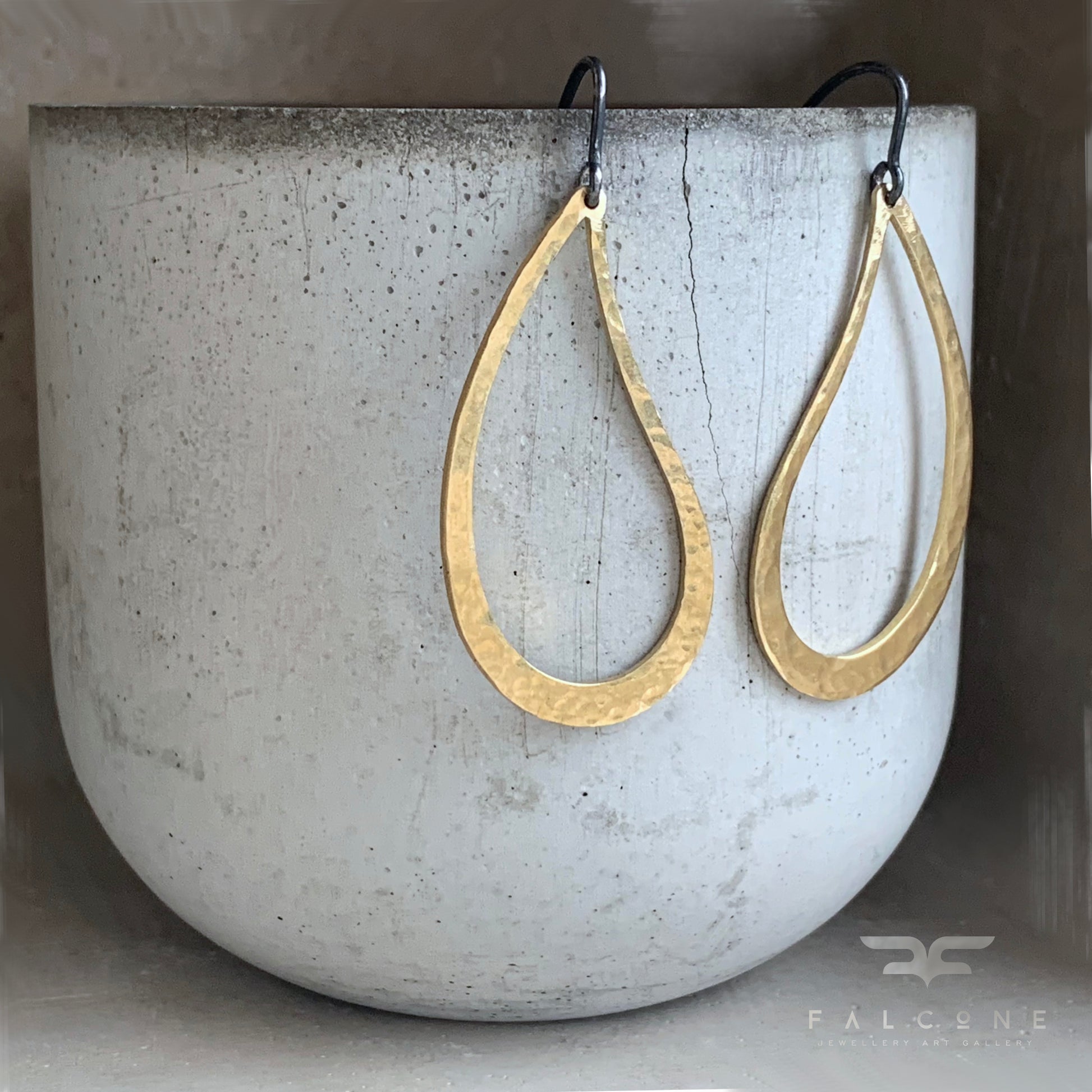 Earrings made of silver and brass. Large, eye-catching earrings crafted from hand-forged brass. The brass takes the form of bold, graphic drops in a warm gold tone. The hammered and repoussé surface enhances their sculptural, expressive character.