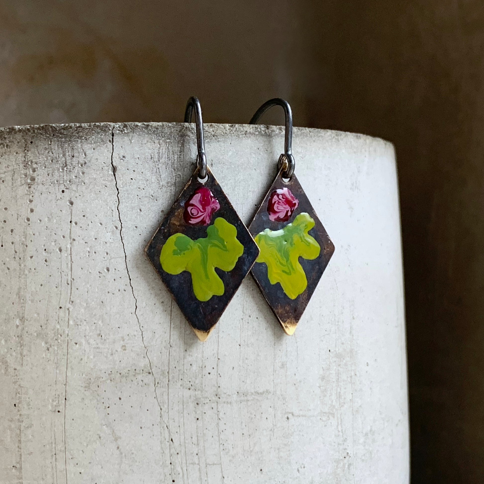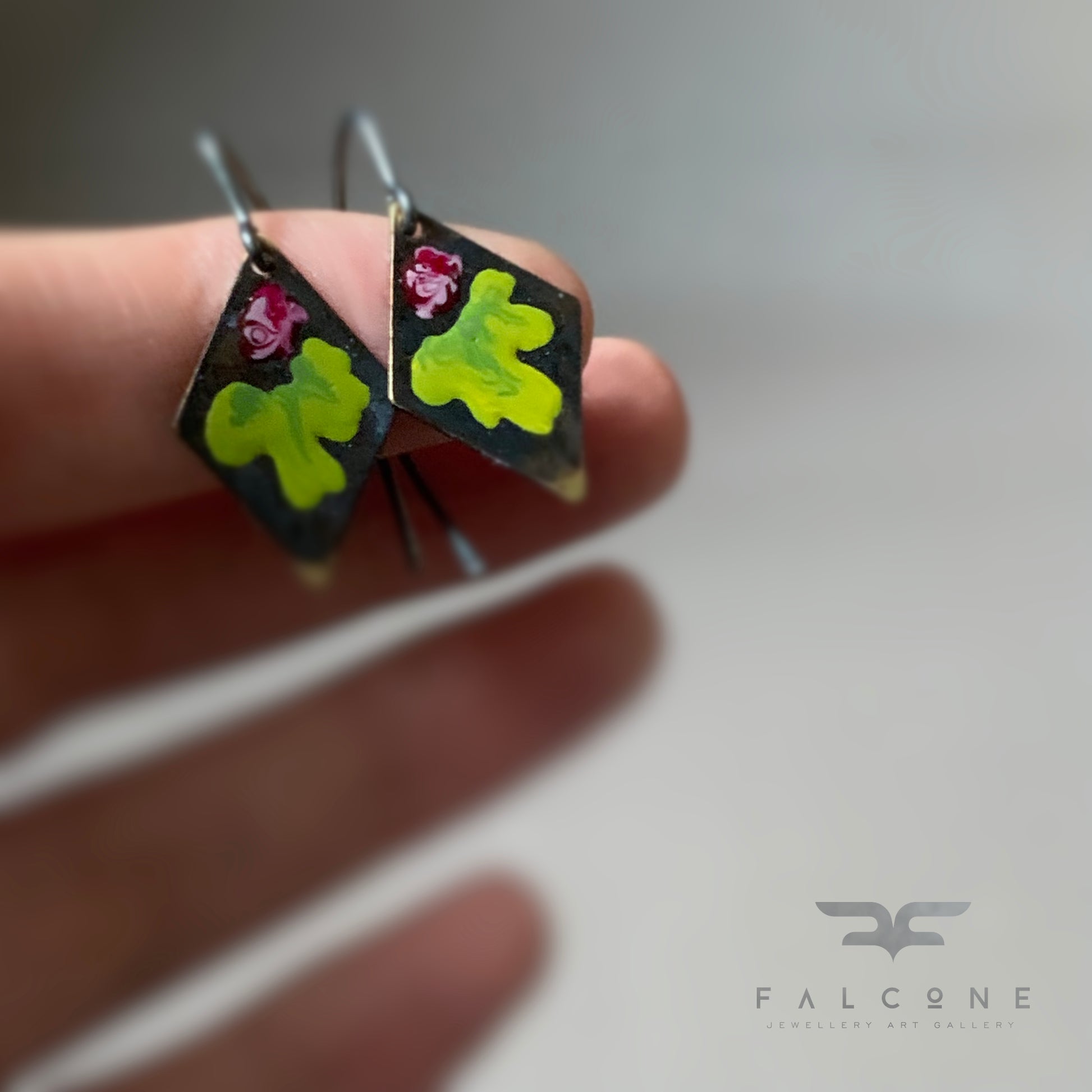 Earrings made of sterling silver and brass. The patinated brass, in warm brown tones, is hand-decorated with a vivid floral motif inspired by exotic nature’s rich colours and whimsical forms. The palette combines lime green with accents of cool pink and deep burgundy.