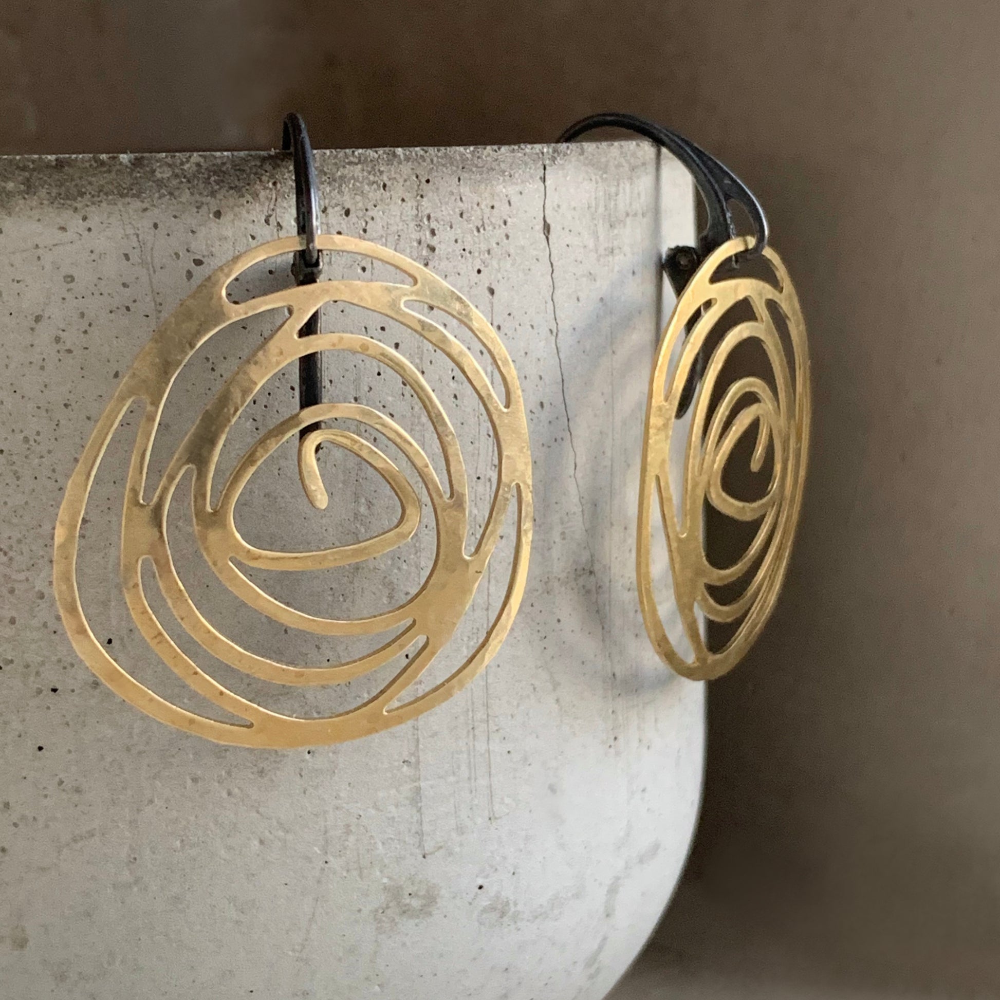 Earrings made of silver and brass. A floral symbol captured in a bold, graphic form that blends modern design with classic romanticism. The roses are forged from gold-tone brass with a gently raised shape. Finished with sterling silver leverback earwires (925).