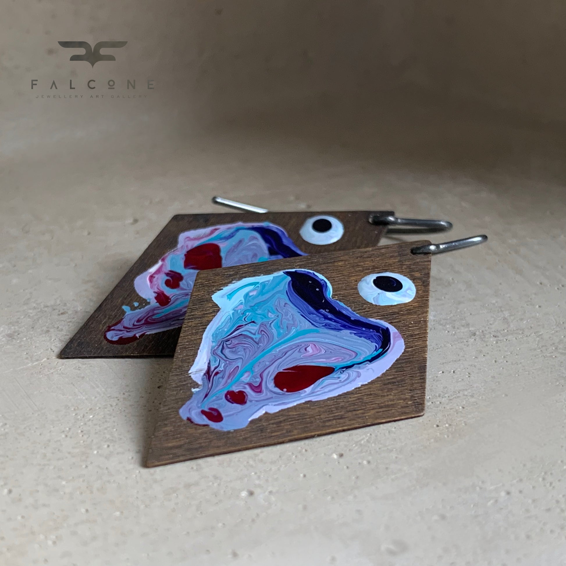 Large, statement brass earrings featuring a fish motif. Textured and repoussé brass with a scratched surface, patinated in a cool brown tone. The fish are hand-enameled in shades of blue, navy, turquoise green, with hints of purple and ruby, creating a cool, layered color palette. Finished with 925 sterling silver hook earwires.