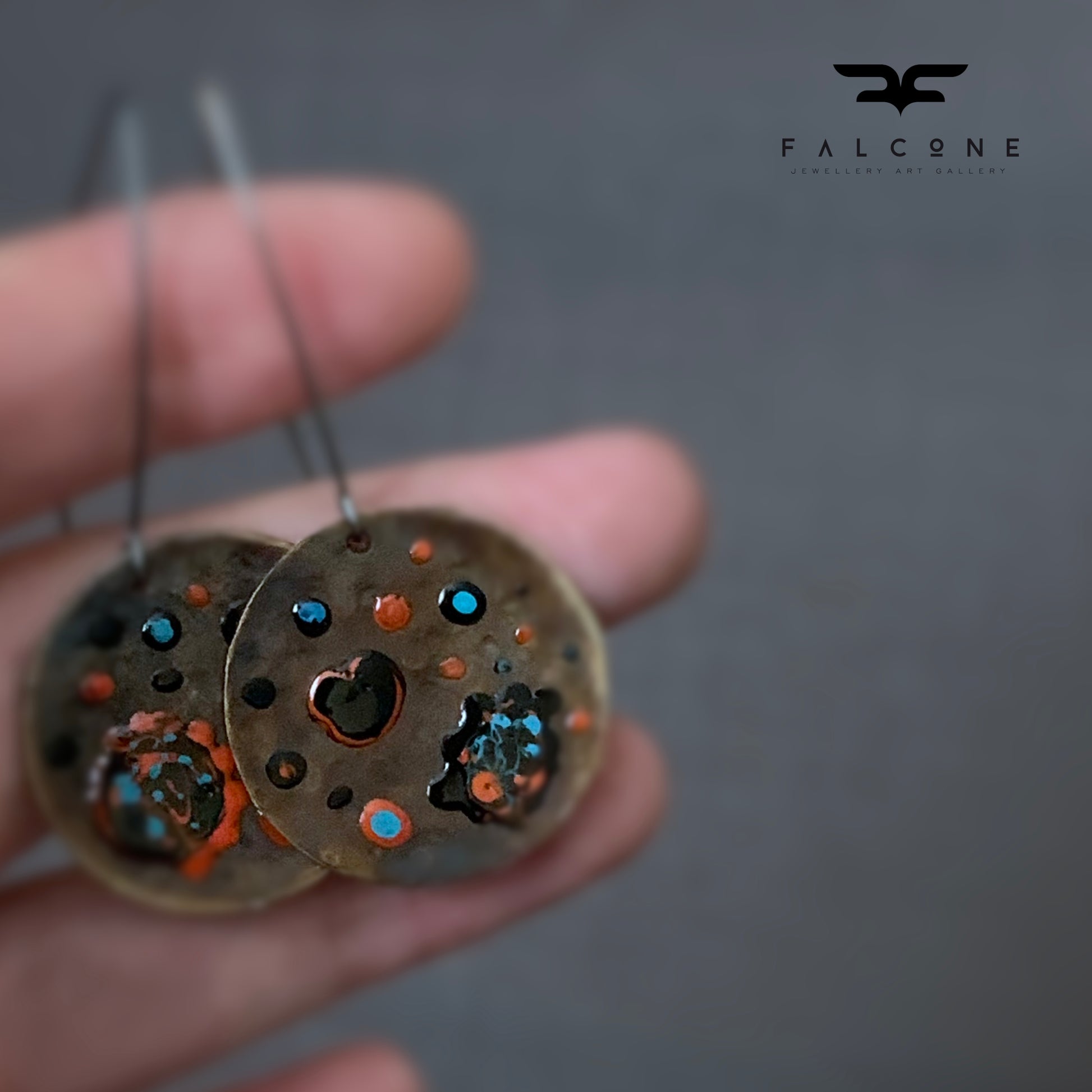 The rustic character of the earrings is contrasted by a decorative enamel motif in bold colours of black, orange-red and turquoise green.