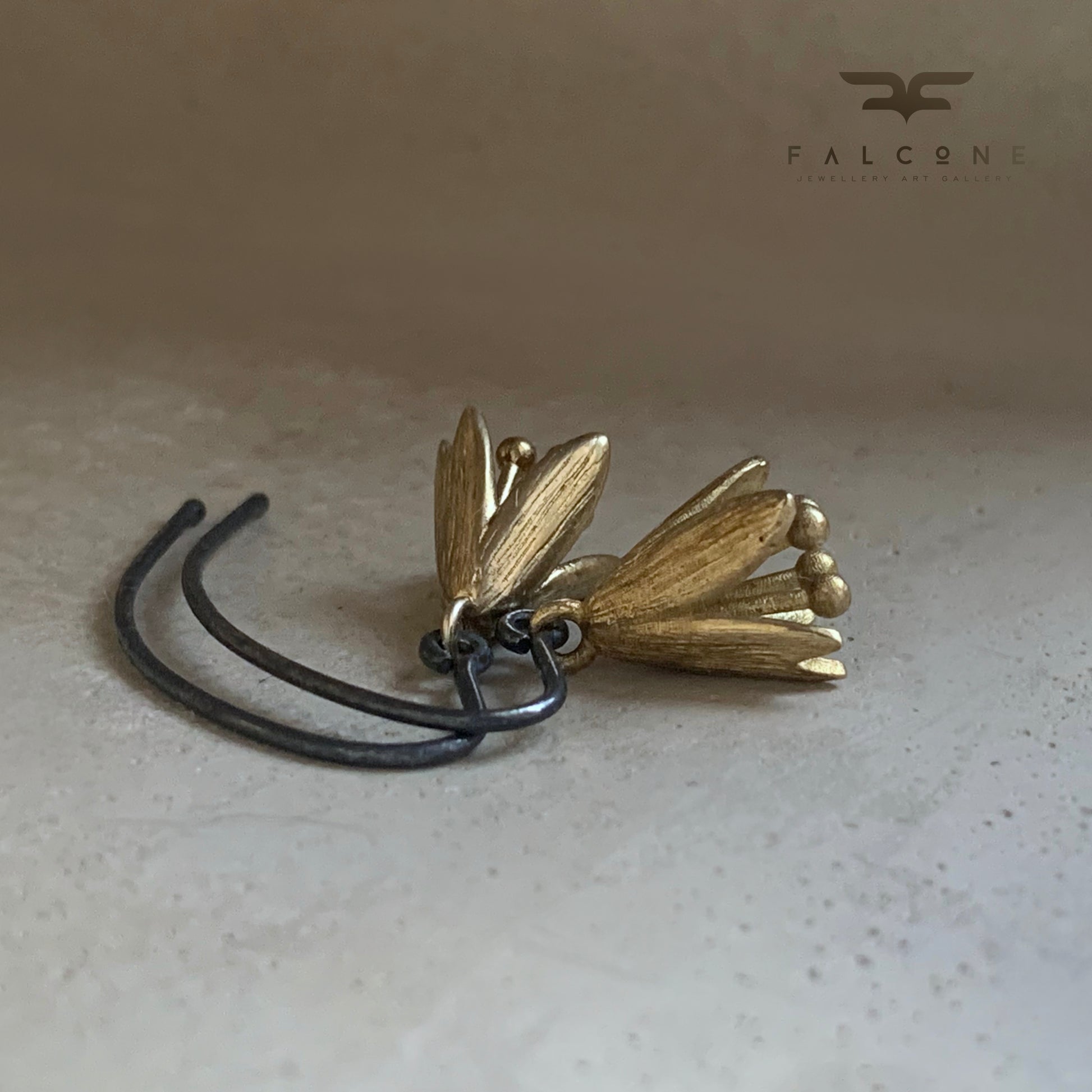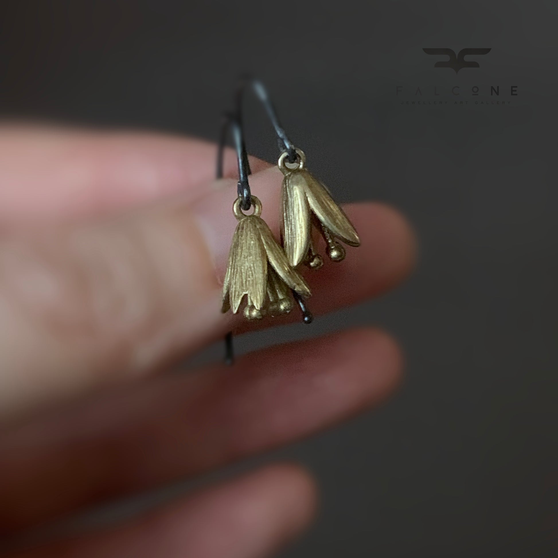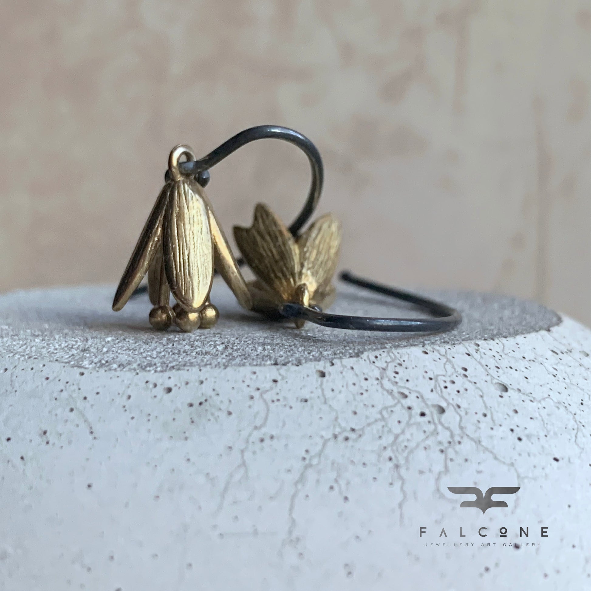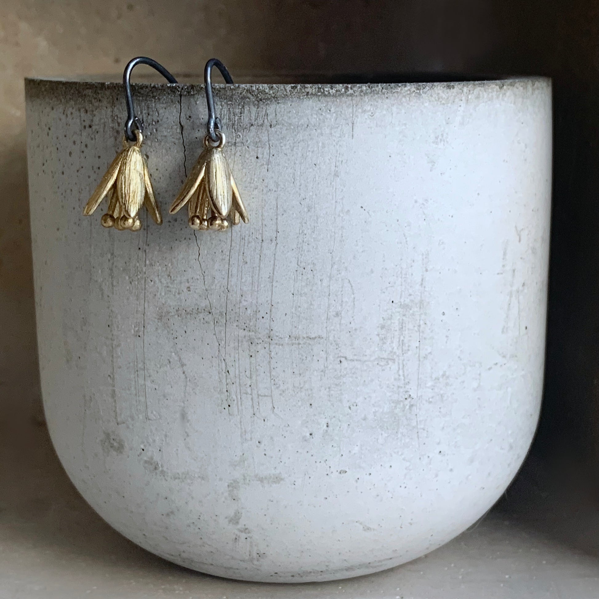 Earrings made of sterling silver and brass. Shaped like delicate floral bells crafted from brass, featuring the natural warm tone of the metal that complements their expressive form. Suspended from oxidized sterling silver earwires.
