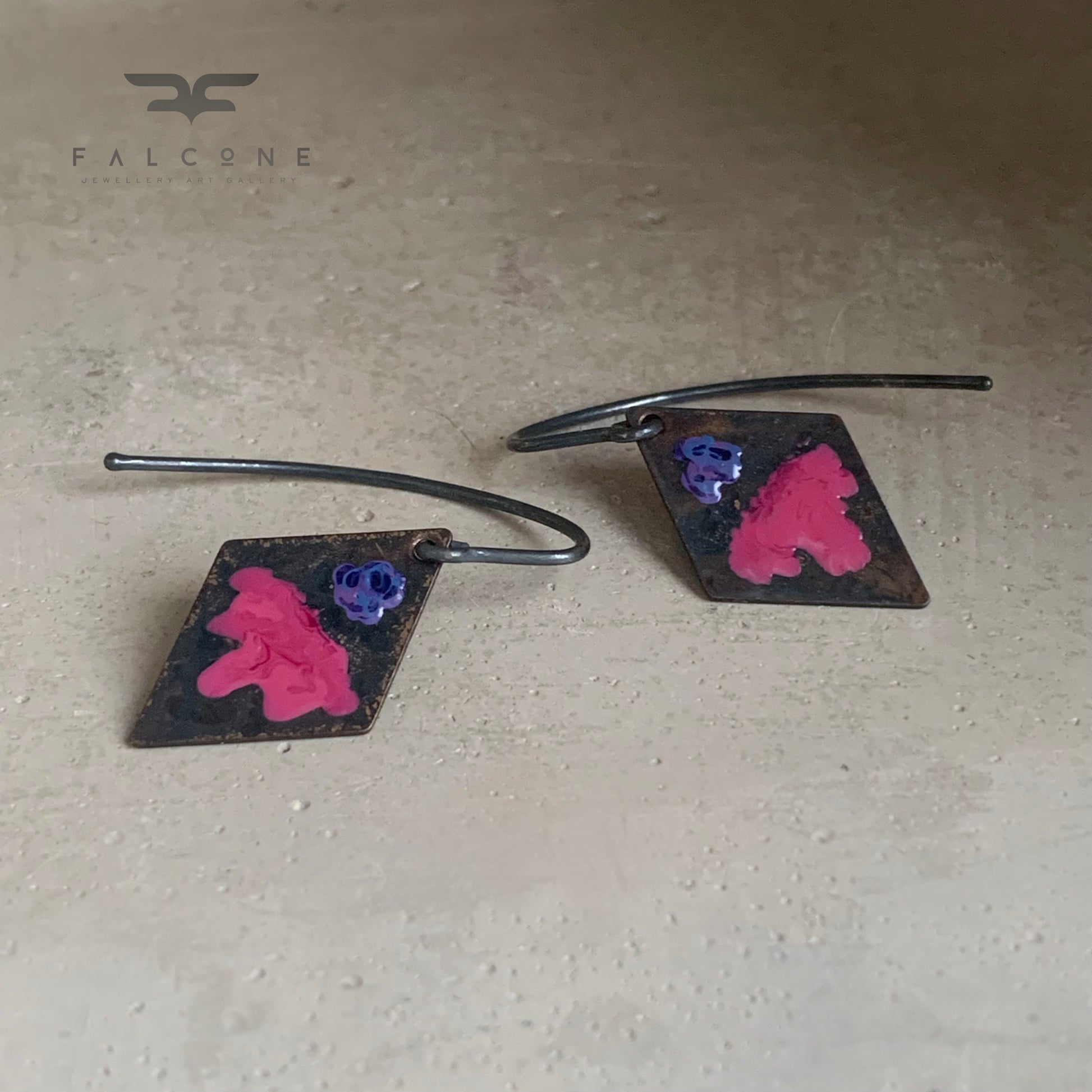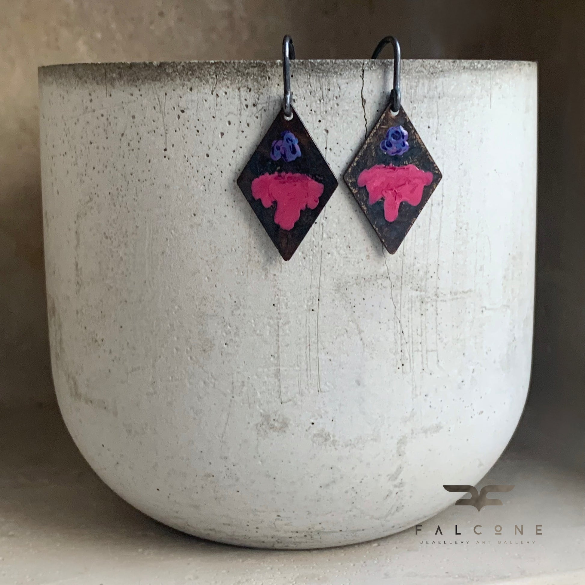 The floral palette features cool shades of deep rose and blue, accented with subtle hints of violet. Finished with oxidised sterling silver 925 hook earwires.