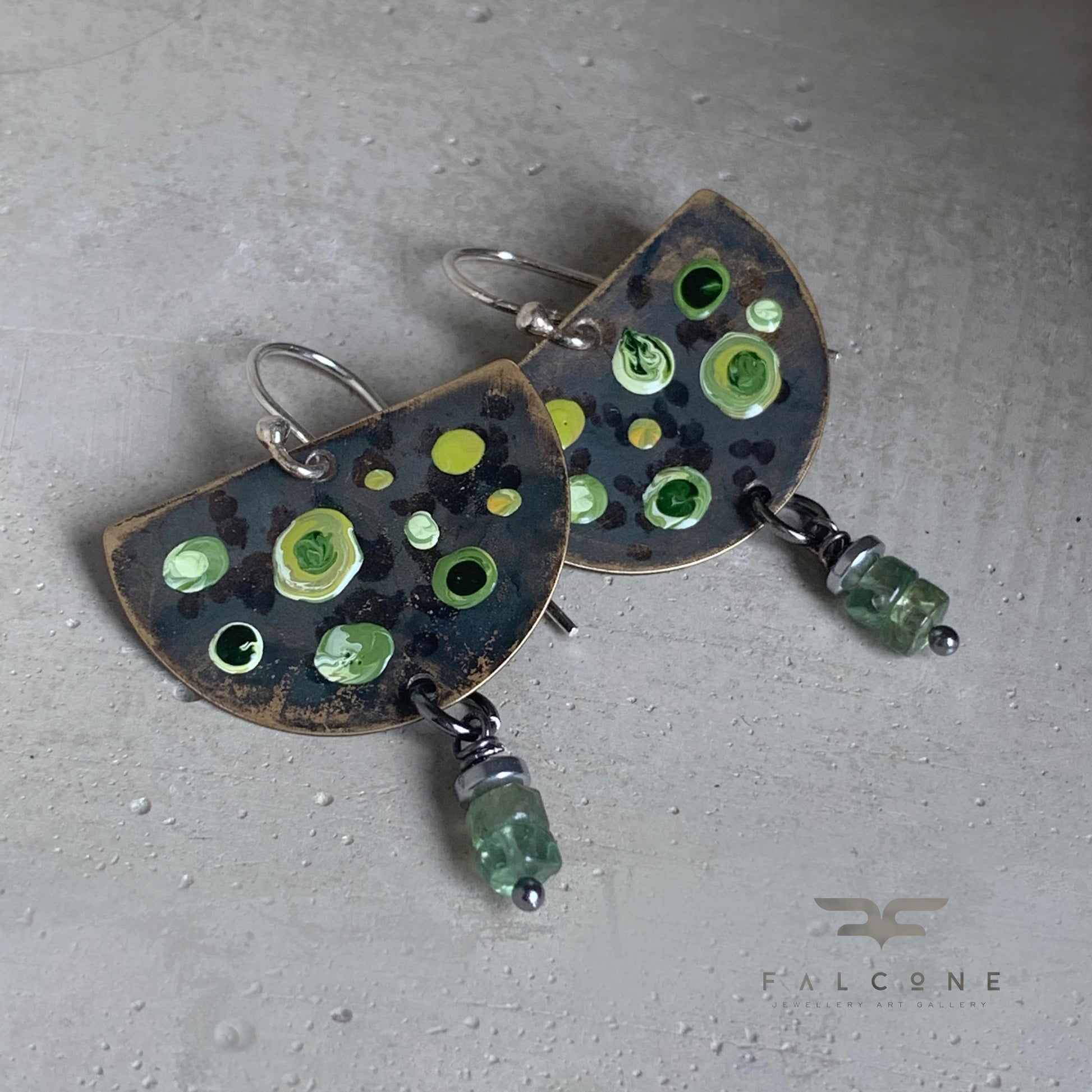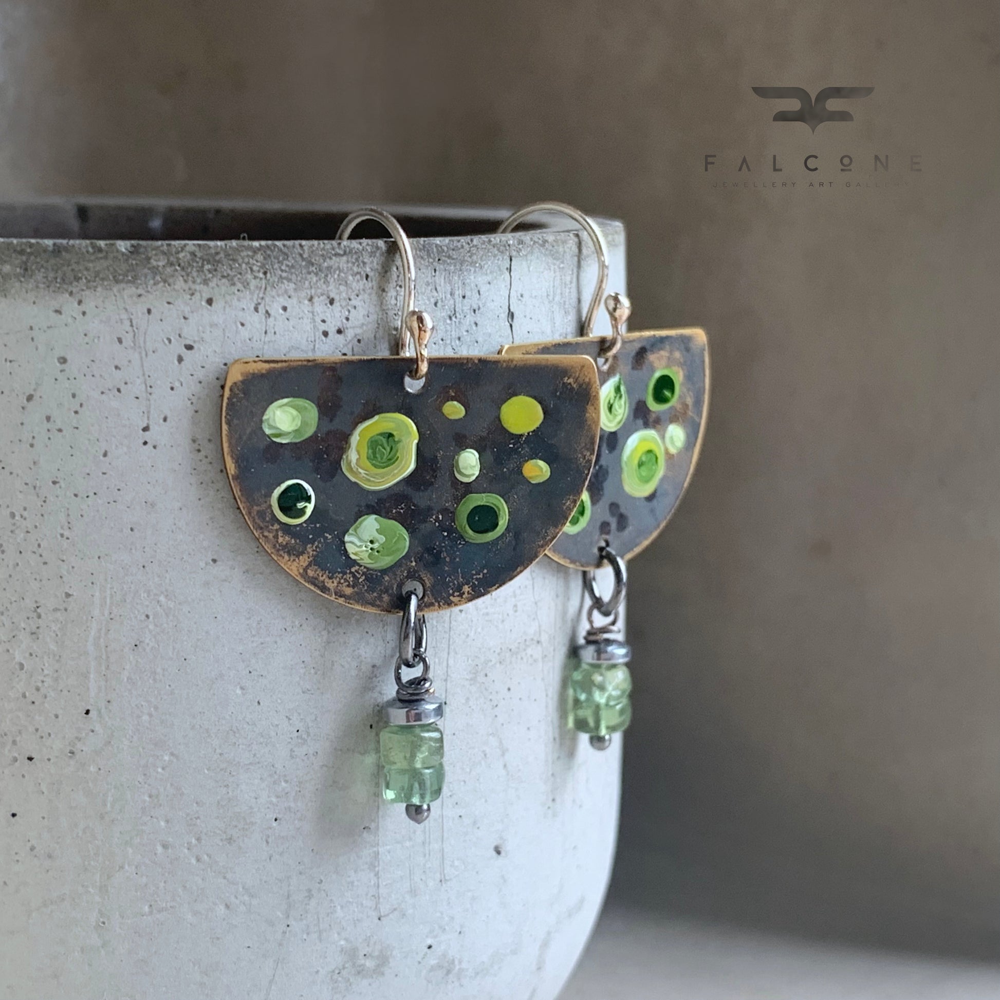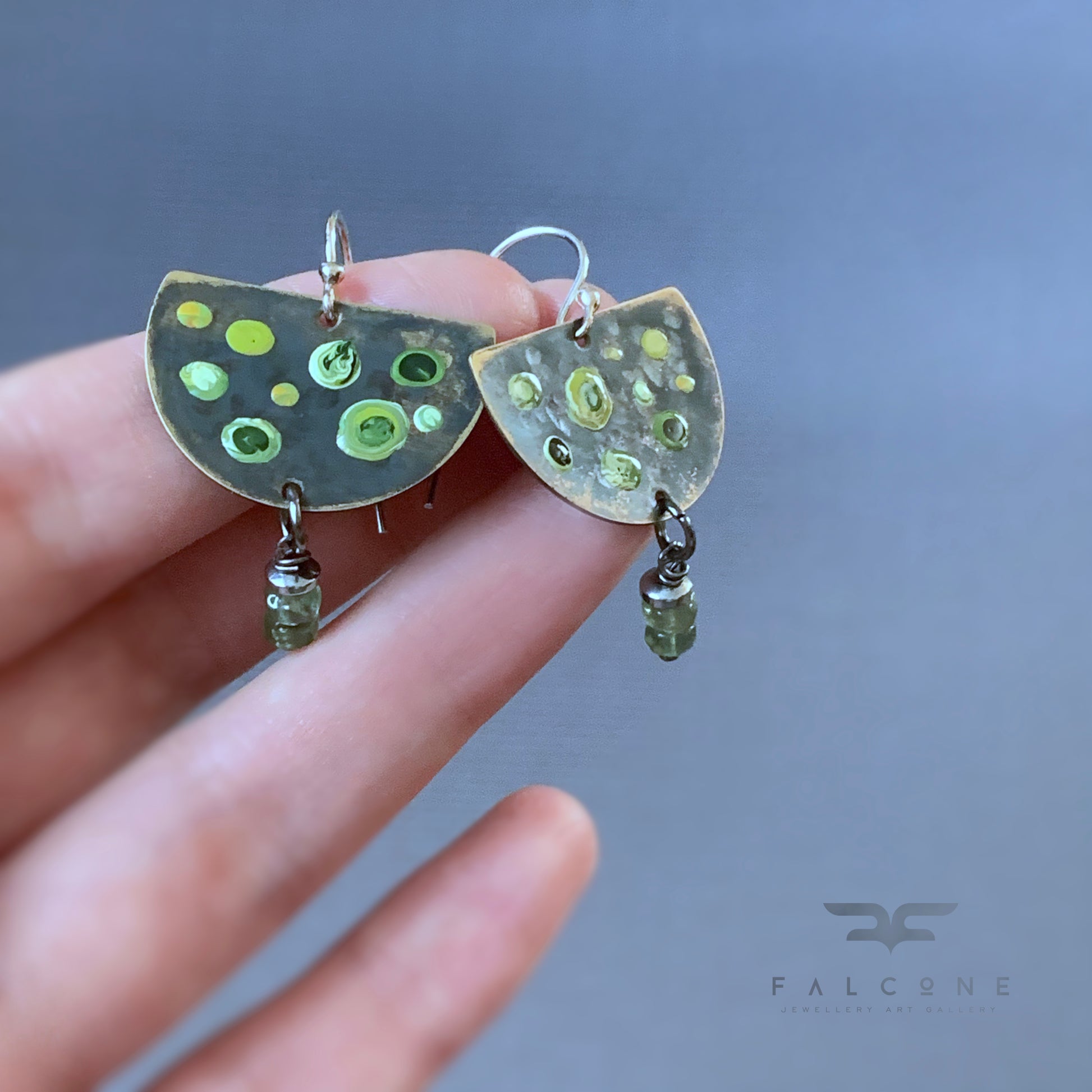 Earrings made of sterling silver, brass, and gemstones. The brass has an aged effect, patinated to a varied brown with worn and repoussé details in a rustic style. Adorned with irregular enamel dots in green shades – from olive and lime to light pastels. The lower part of the earrings is decorated with irregular green apatite rondelles, slightly translucent and refined in tone, blending harmoniously with the enamel dots.