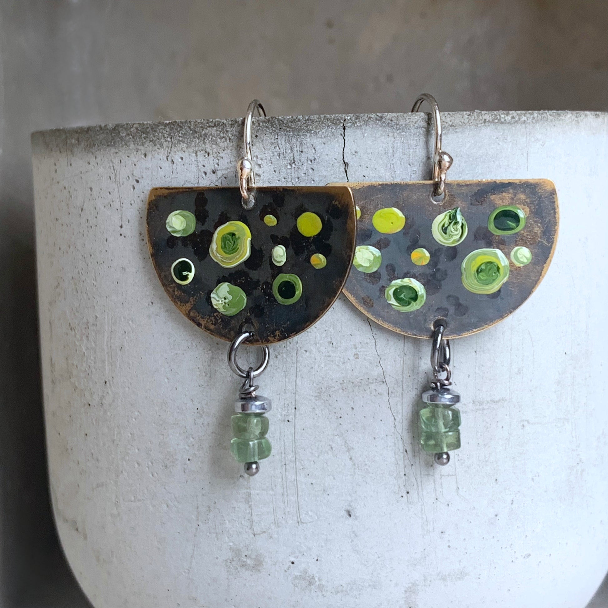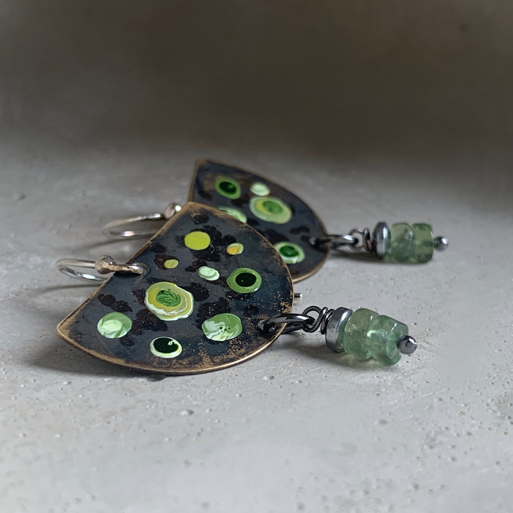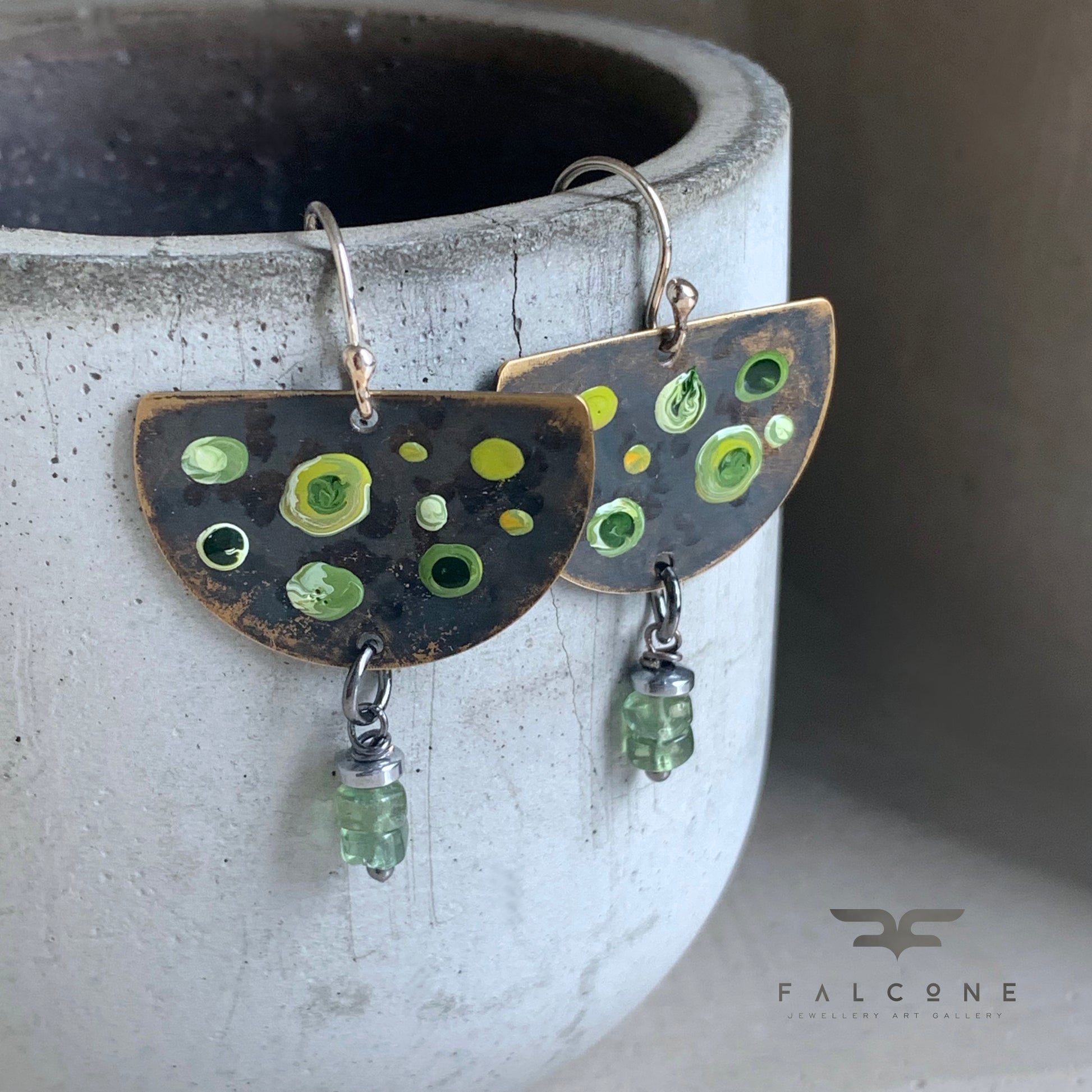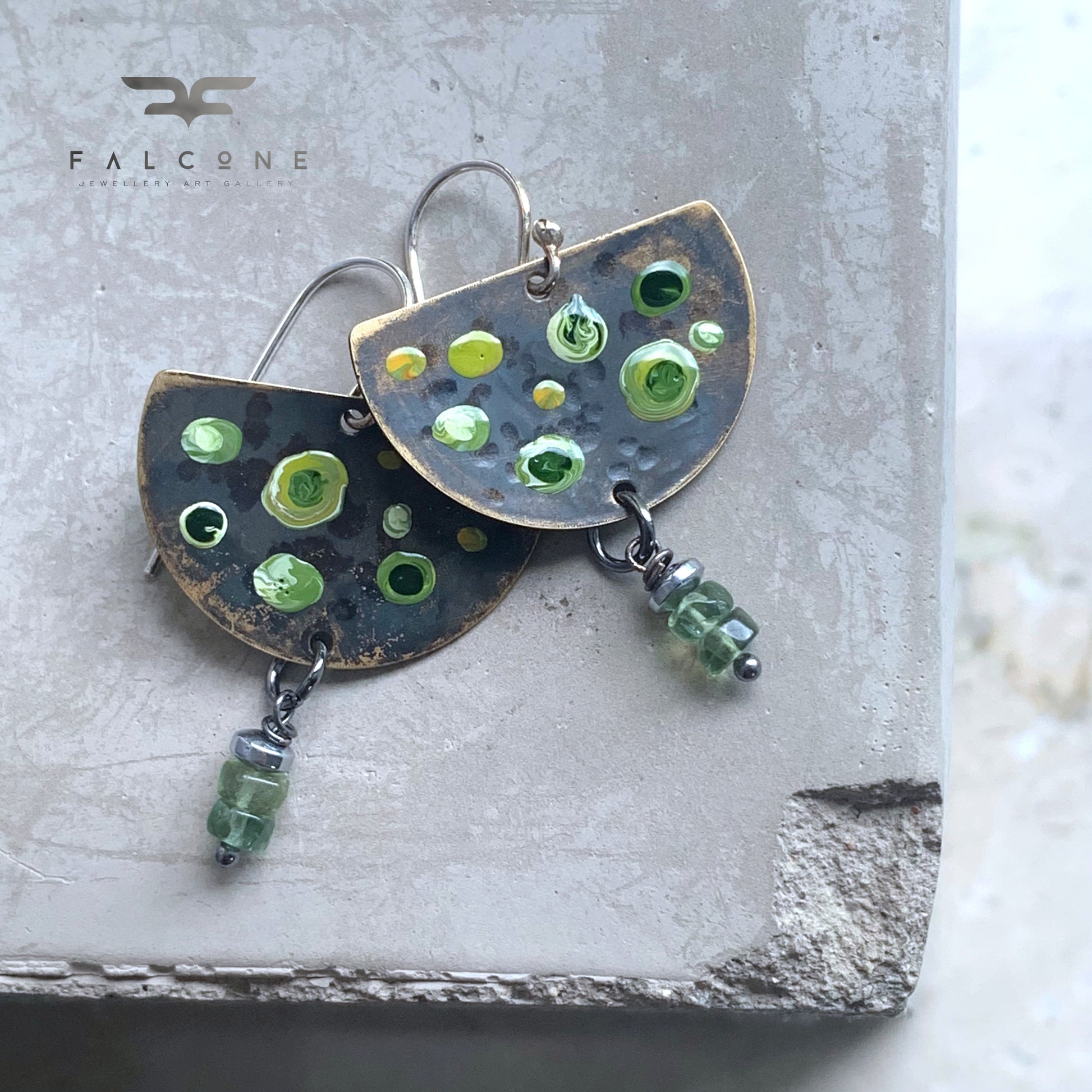 Earrings made of sterling silver, brass, and gemstones. The brass has an aged effect, patinated to a varied brown with worn and repoussé details in a rustic style. Adorned with irregular enamel dots in green shades – from olive and lime to light pastels. The lower part of the earrings is decorated with irregular green apatite rondelles, slightly translucent and refined in tone, blending harmoniously with the enamel dots.