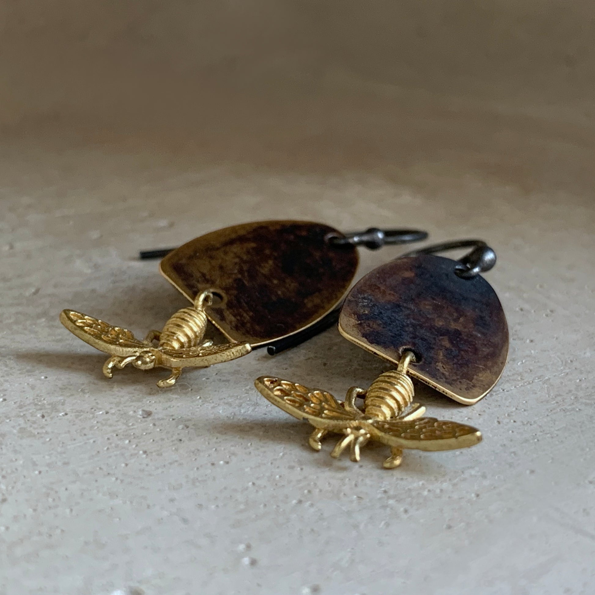 Patinated brass, in a deep bitter-brown tone with subtle distressed highlights, forms the base for delicate golden brass bees. The design is completed with darkened sterling silver 925 open hook earwires.