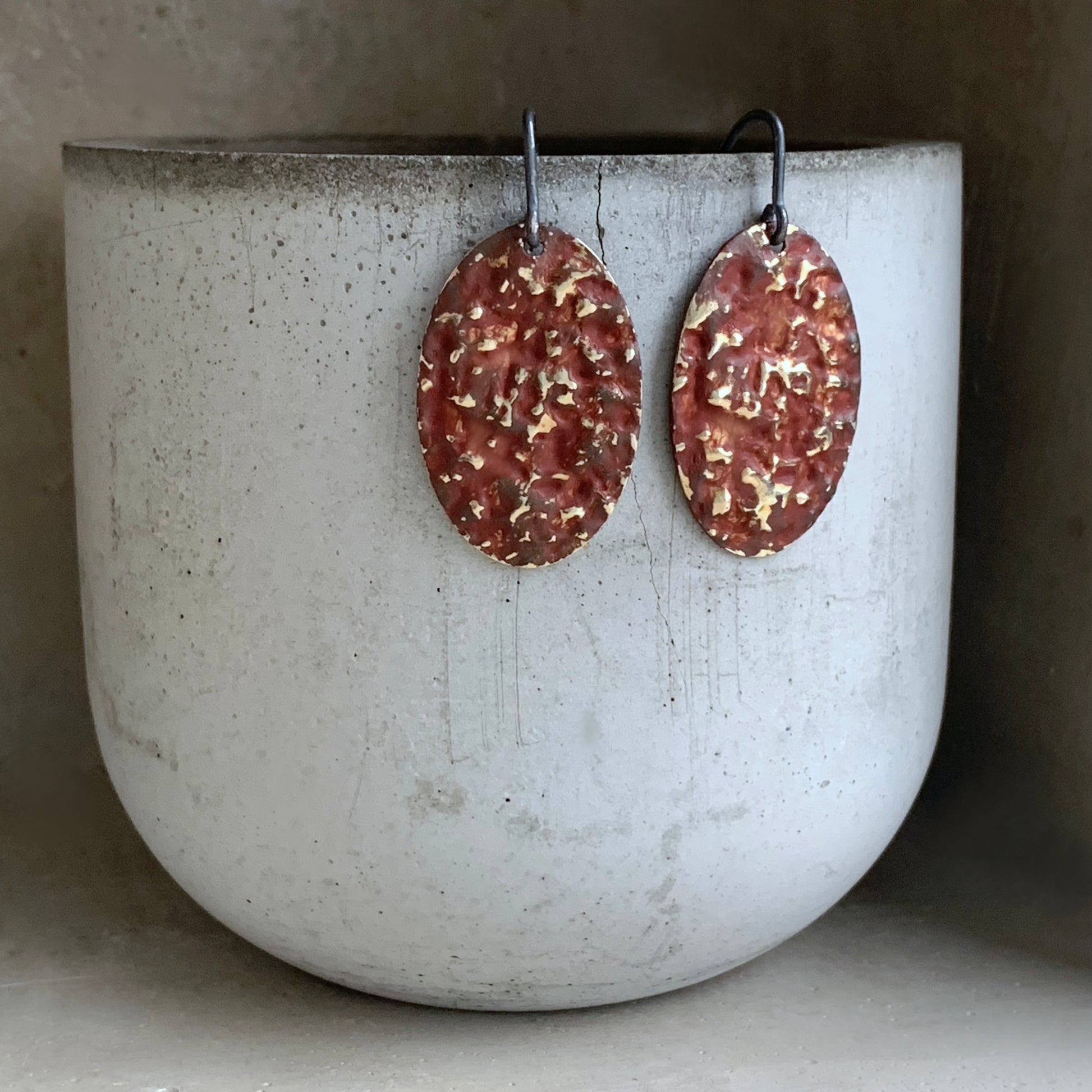 The textured brass ovals are patinated in a unique marsala shade - a blend of brown with hints of burgundy.
