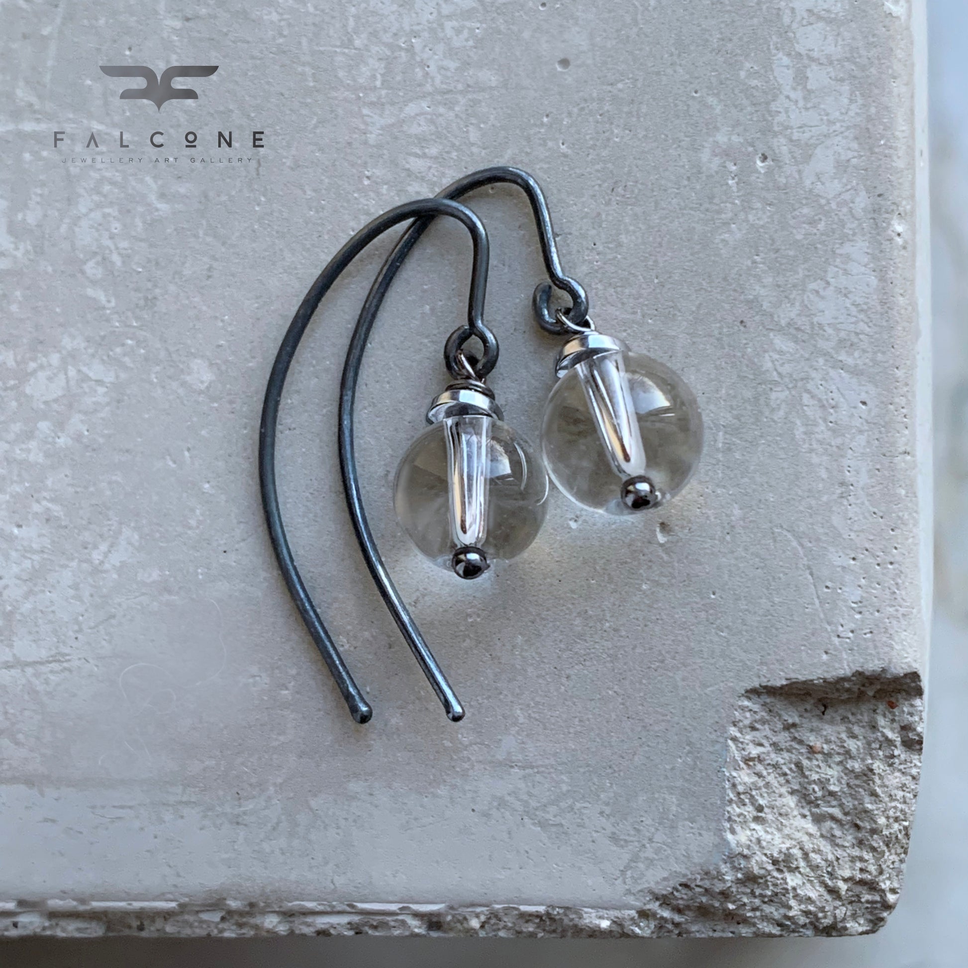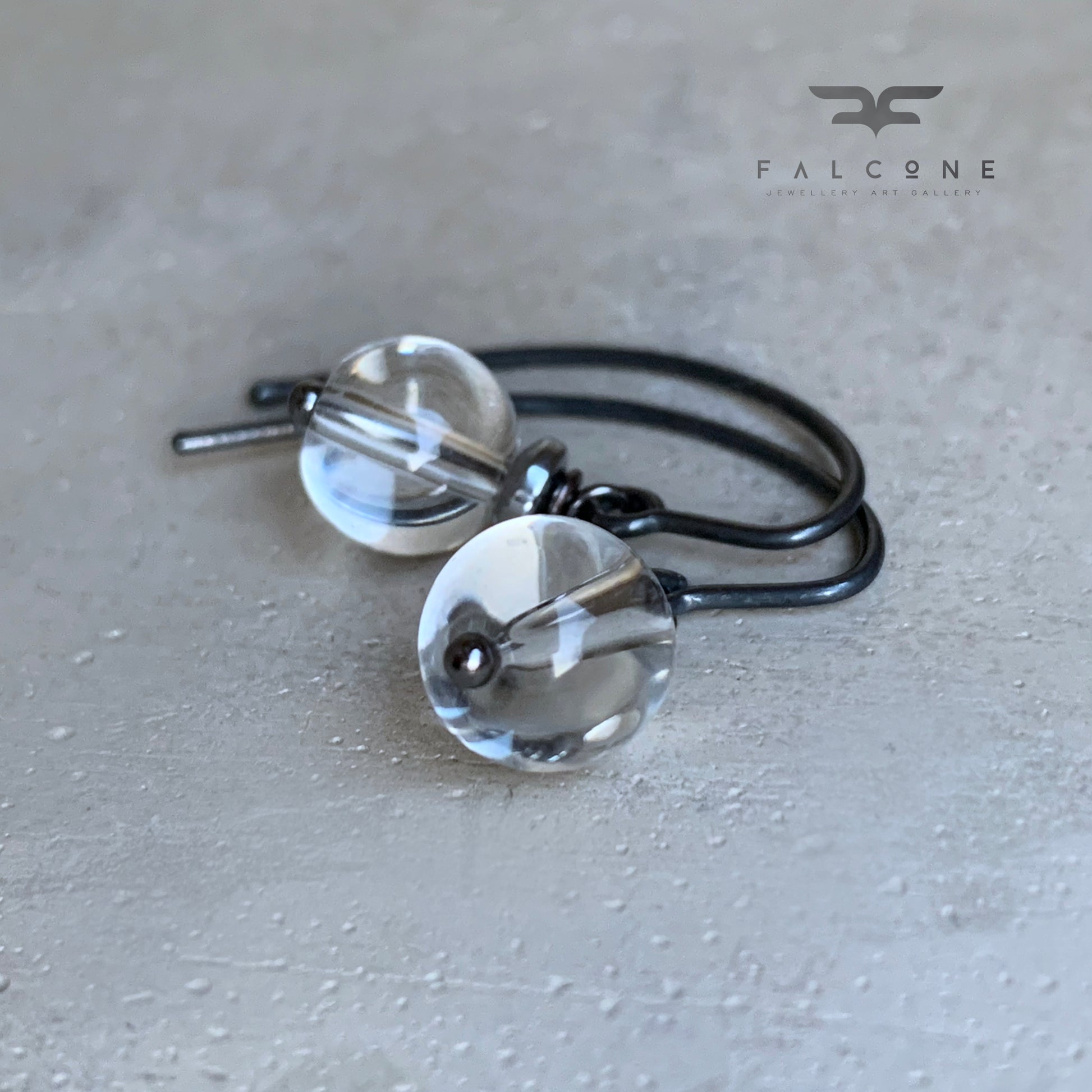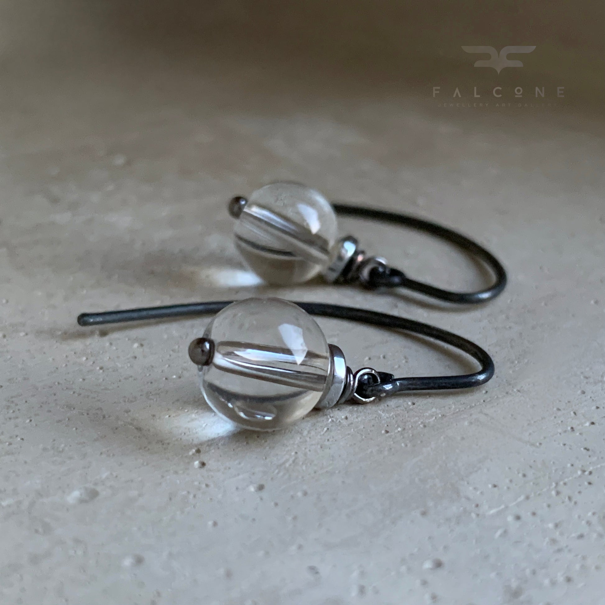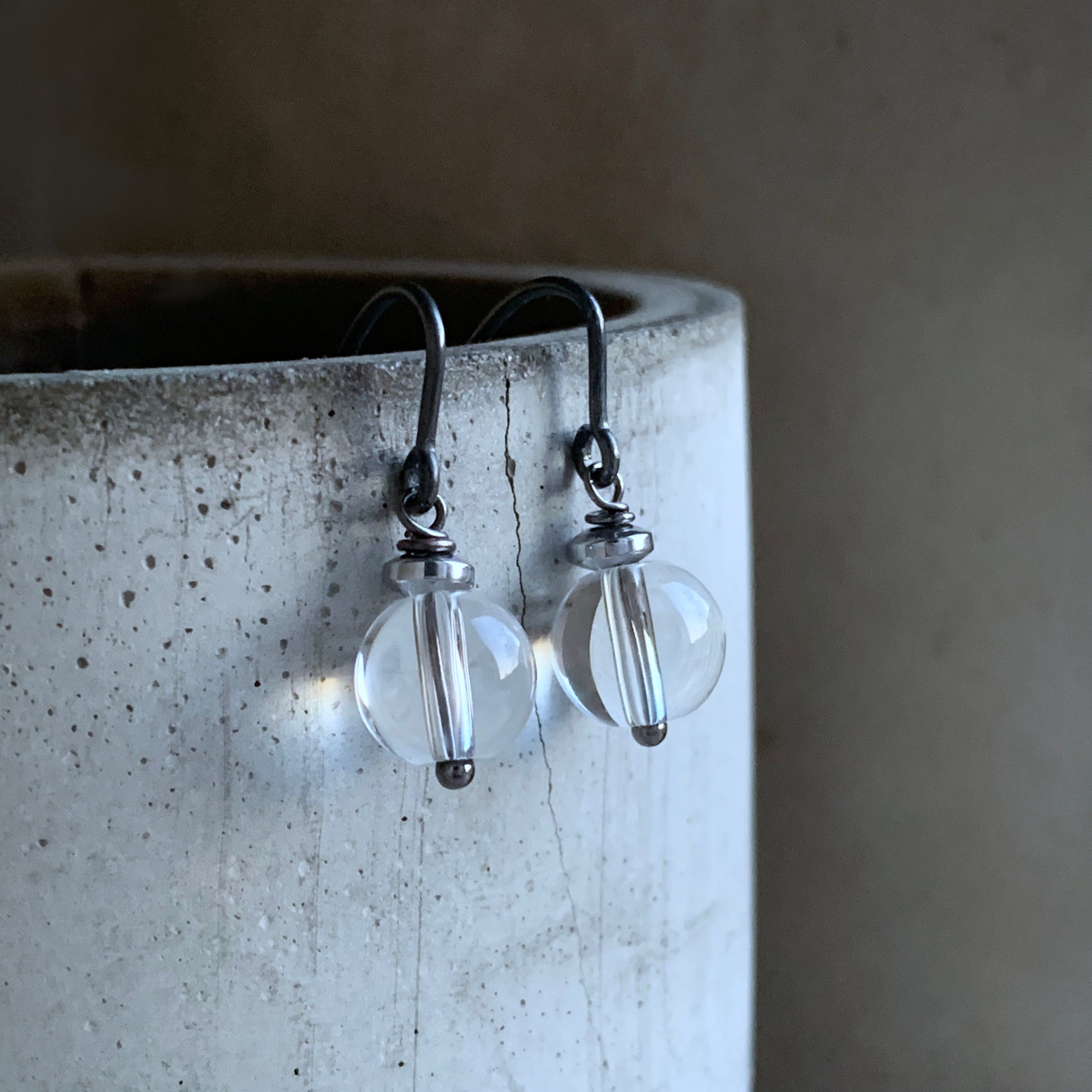Earrings made of sterling silver and clear crystal glass. Smoothly polished crystal spheres - cool to the touch and transparent like water droplets - are paired with silver-plated hematite and darkened silver for contrast.