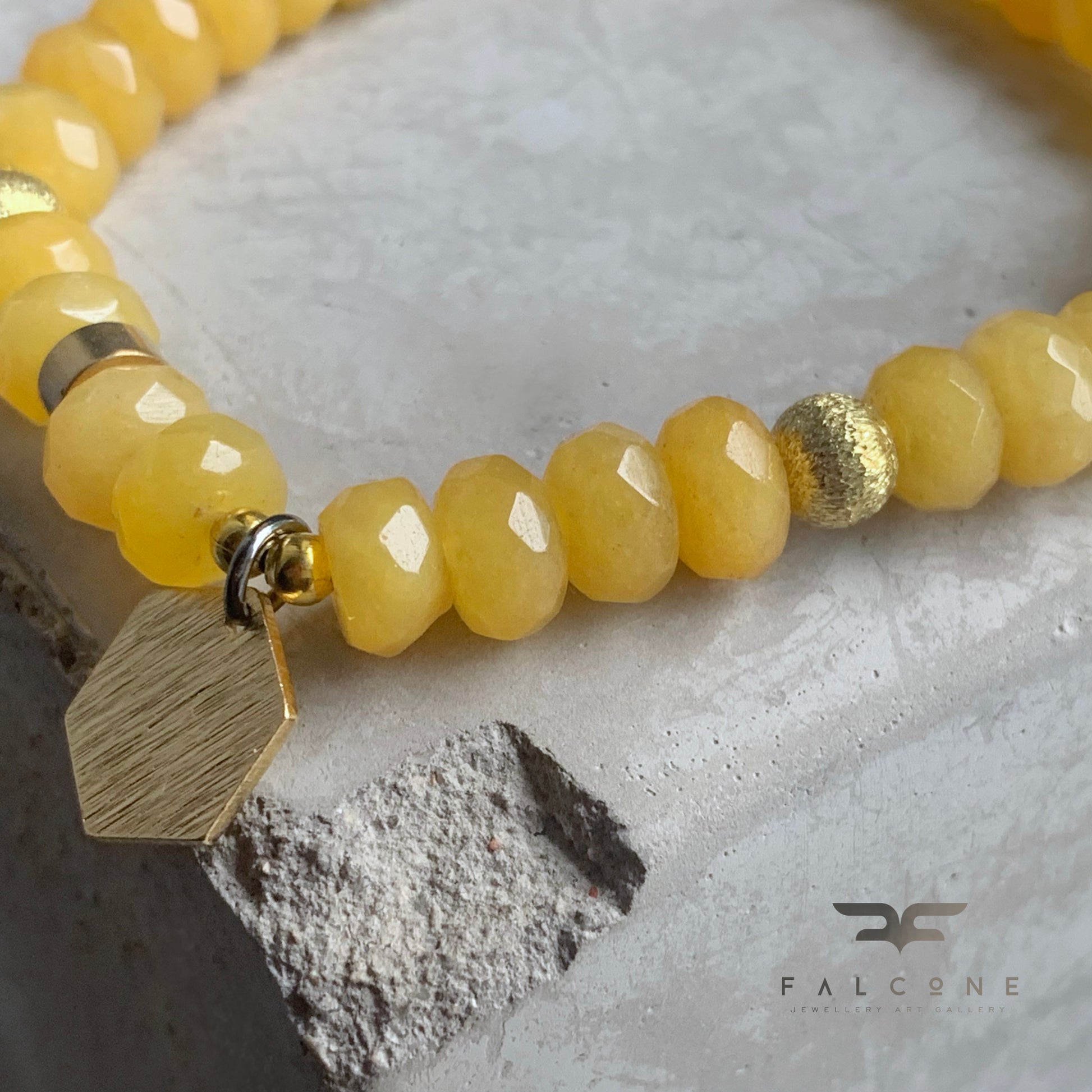 Crafted from faceted rondelles of yellow jadeite, the stones have a warm yet muted colour. Interspersed elements of brushed golden-tone brass highlight the jadeite’s beauty.