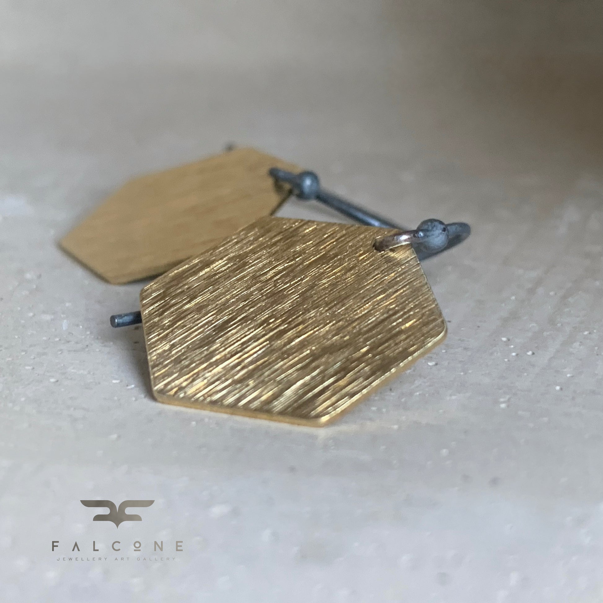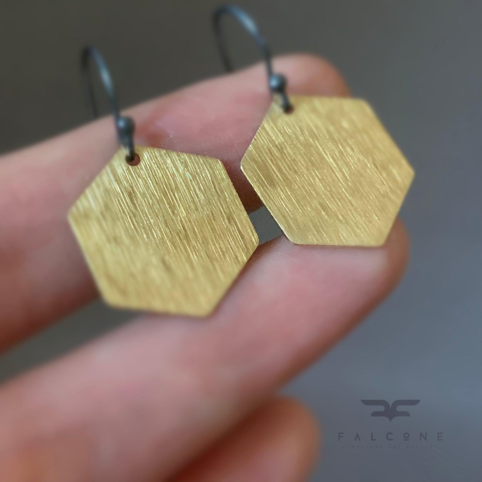 The earrings feature a minimalist hexagon shape in brushed brass, evoking golden honeycombs. They catch the light with a subtle shimmer and are suspended from 925 sterling silver open hooks.