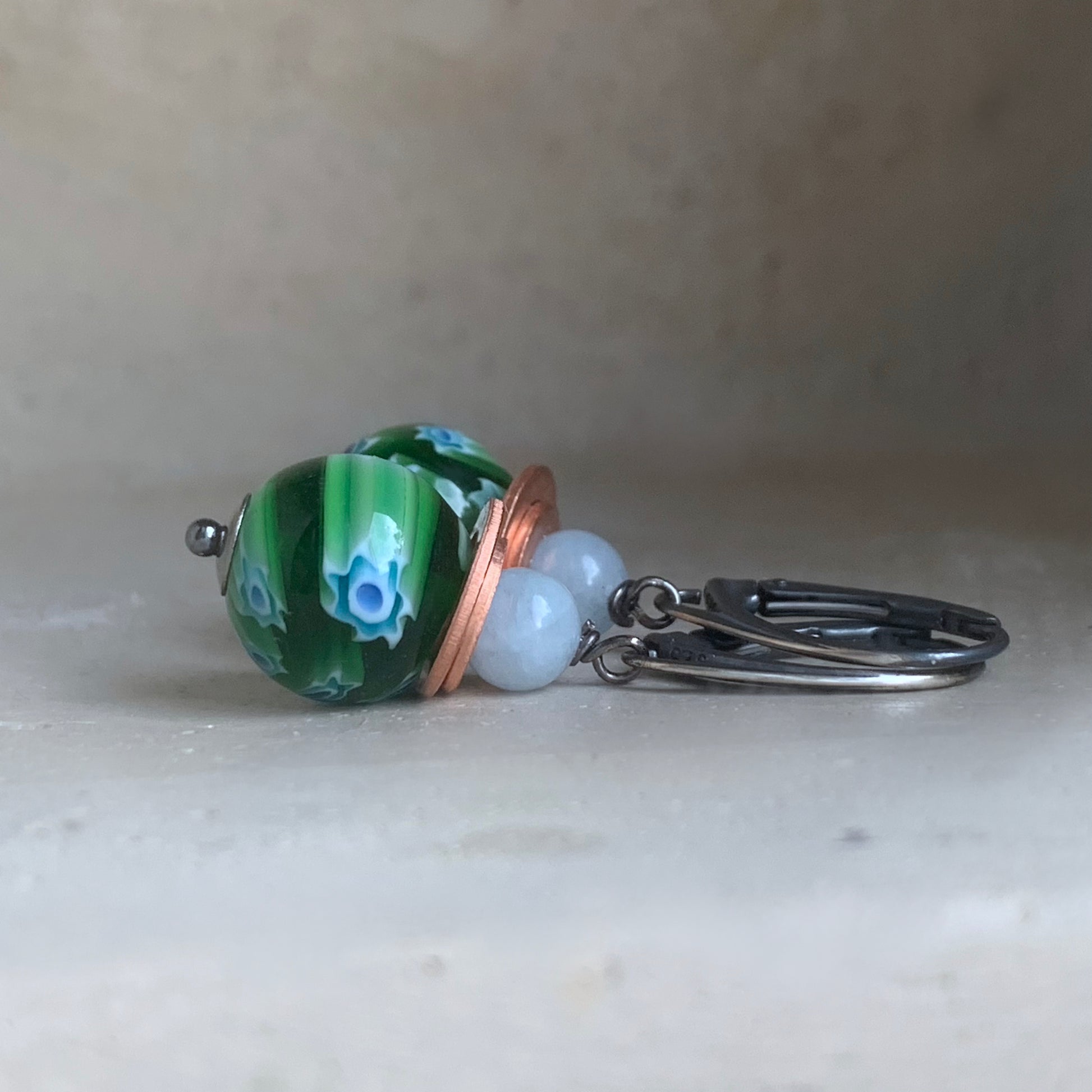Glass, Jadeite, Copper and Silver Earrings 'Green Millefiori - Baby Blue Accent'