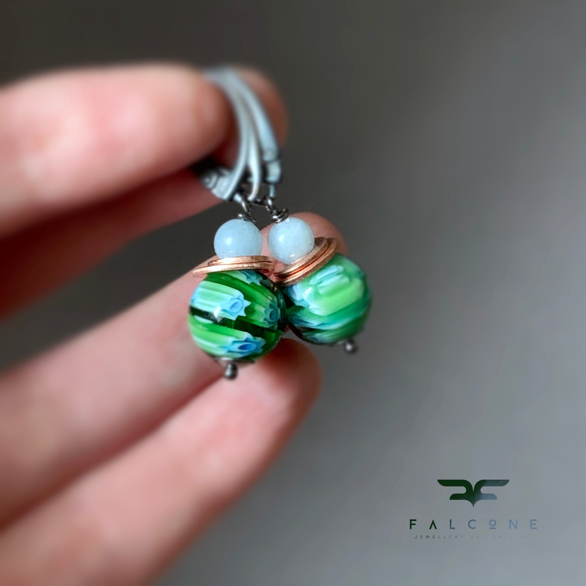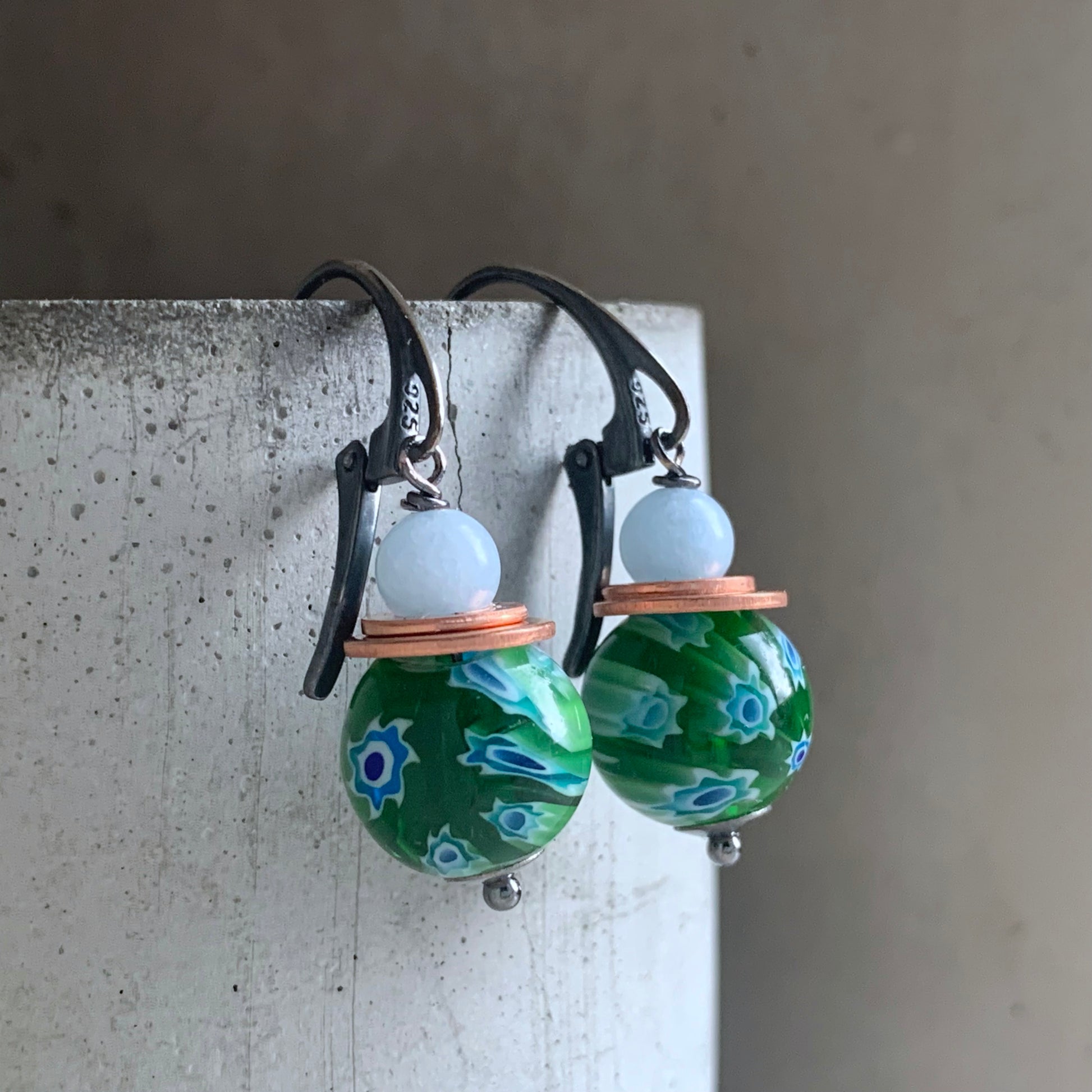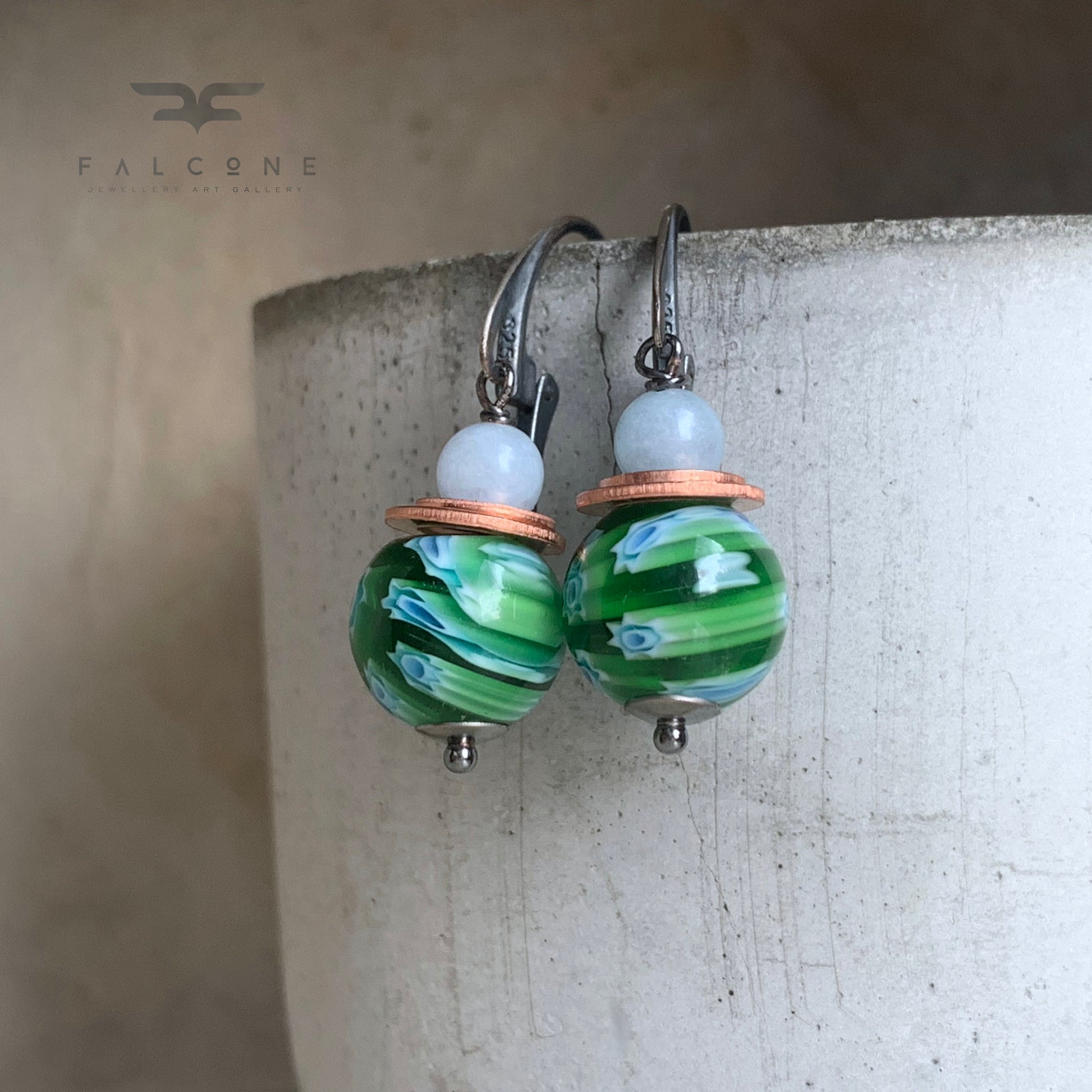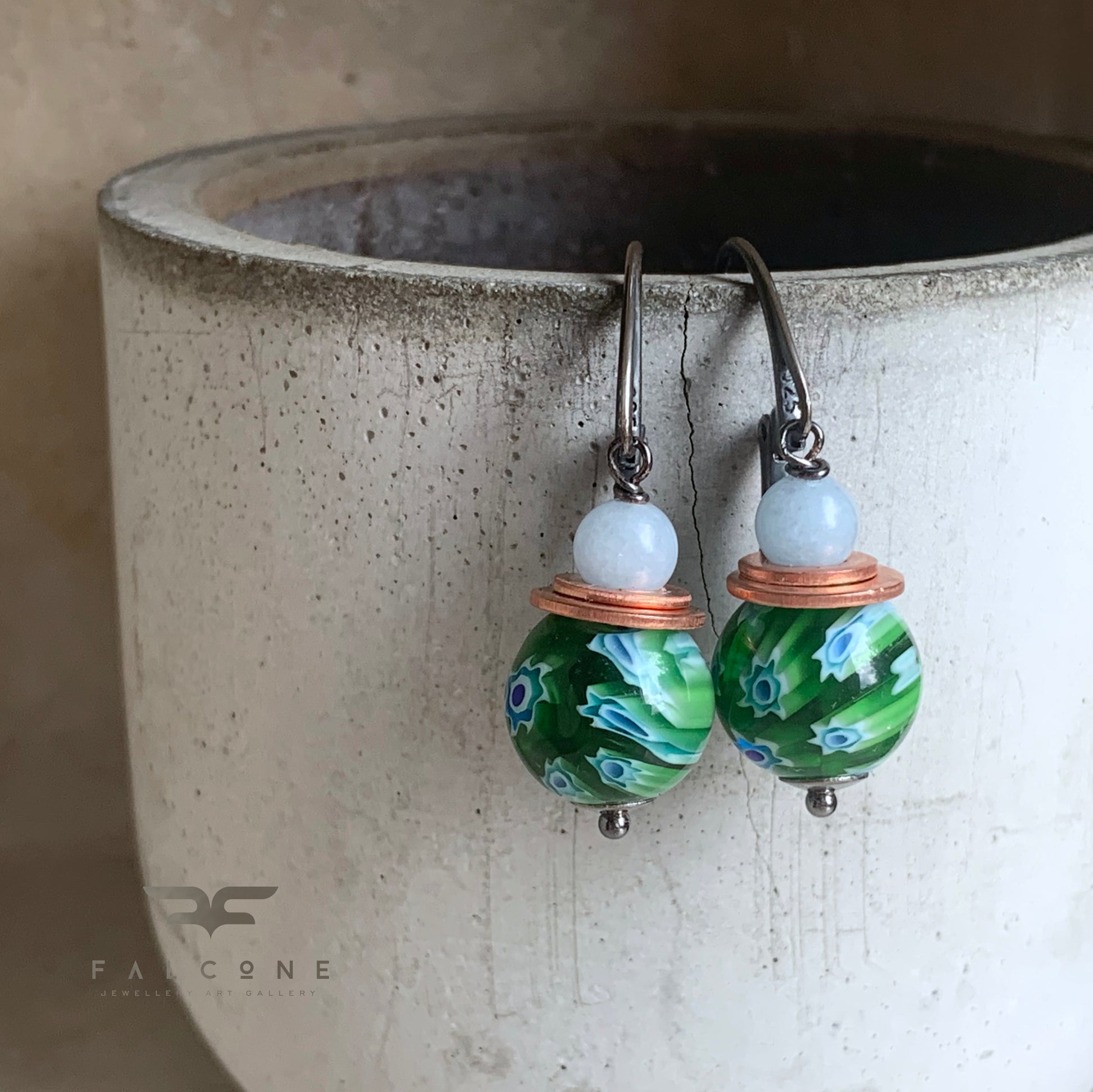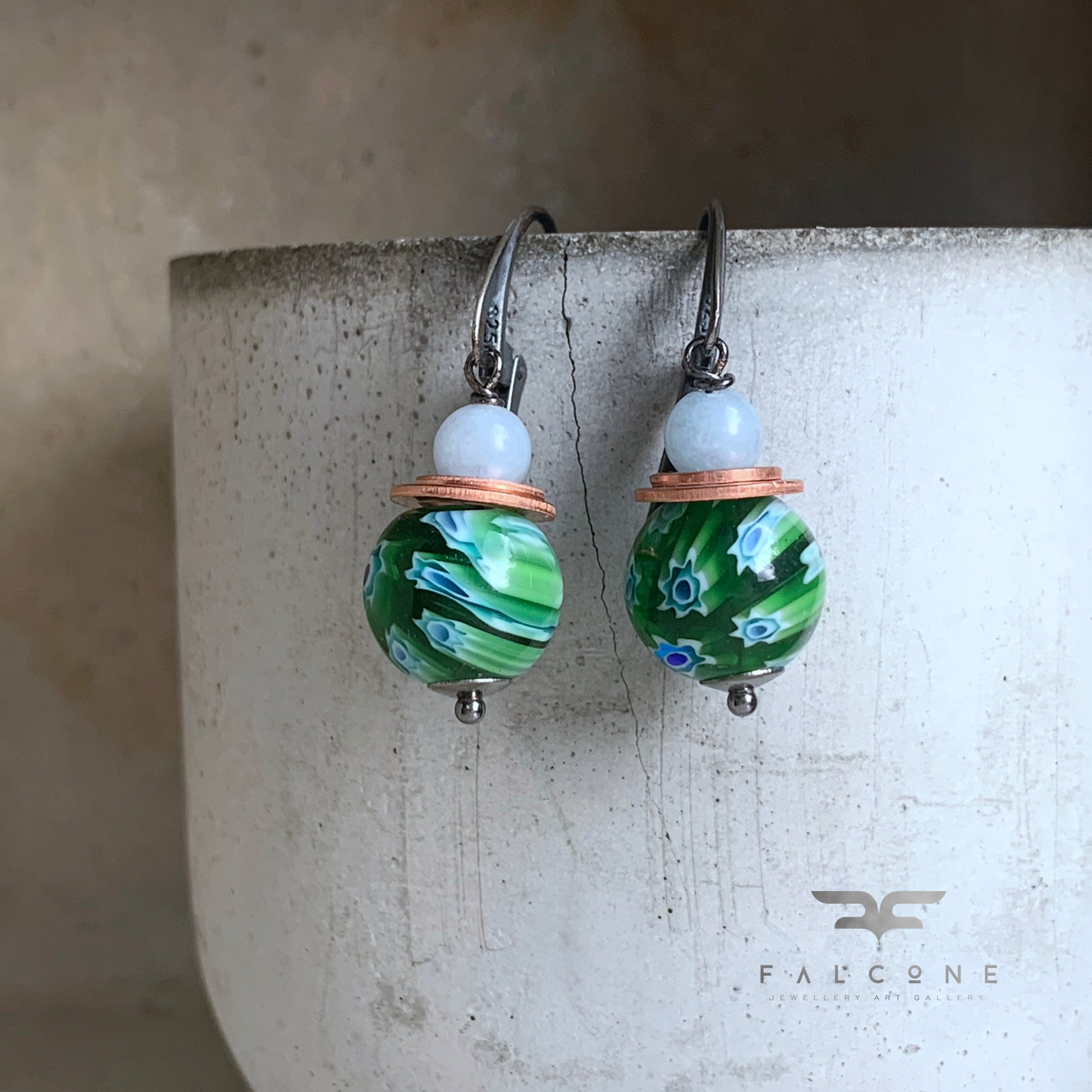 Earrings made of sterling silver, glass, copper, and gemstones. Millefiori glass, an Italian decorative technique meaning "a thousand flowers", forms smooth green hand-crafted spheres with refined tones. The floral motifs appear in pastel blue shades, highlighted by jadeite beads in soft baby blue. A salmon-toned copper collar adds a warm accent that contrasts with the cooler colours.