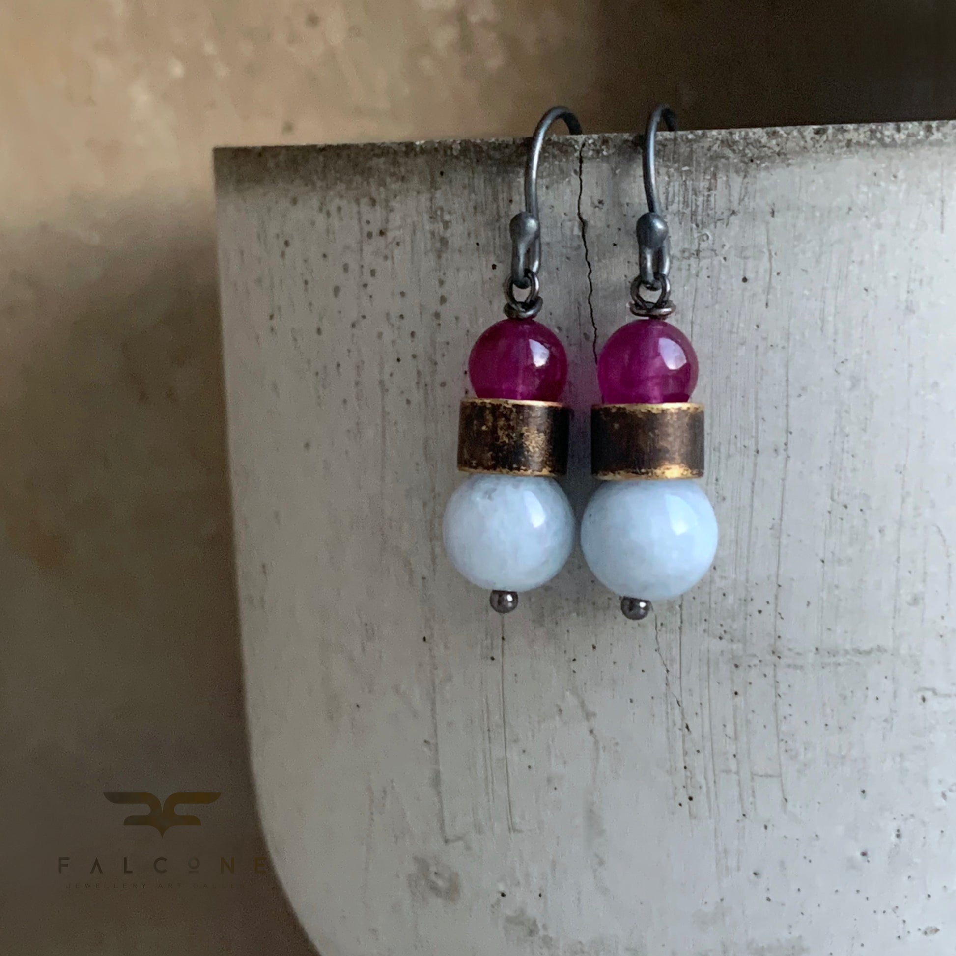Jadeite, Agate Brass and Silver Earrings 'Baby Blue & Rose'