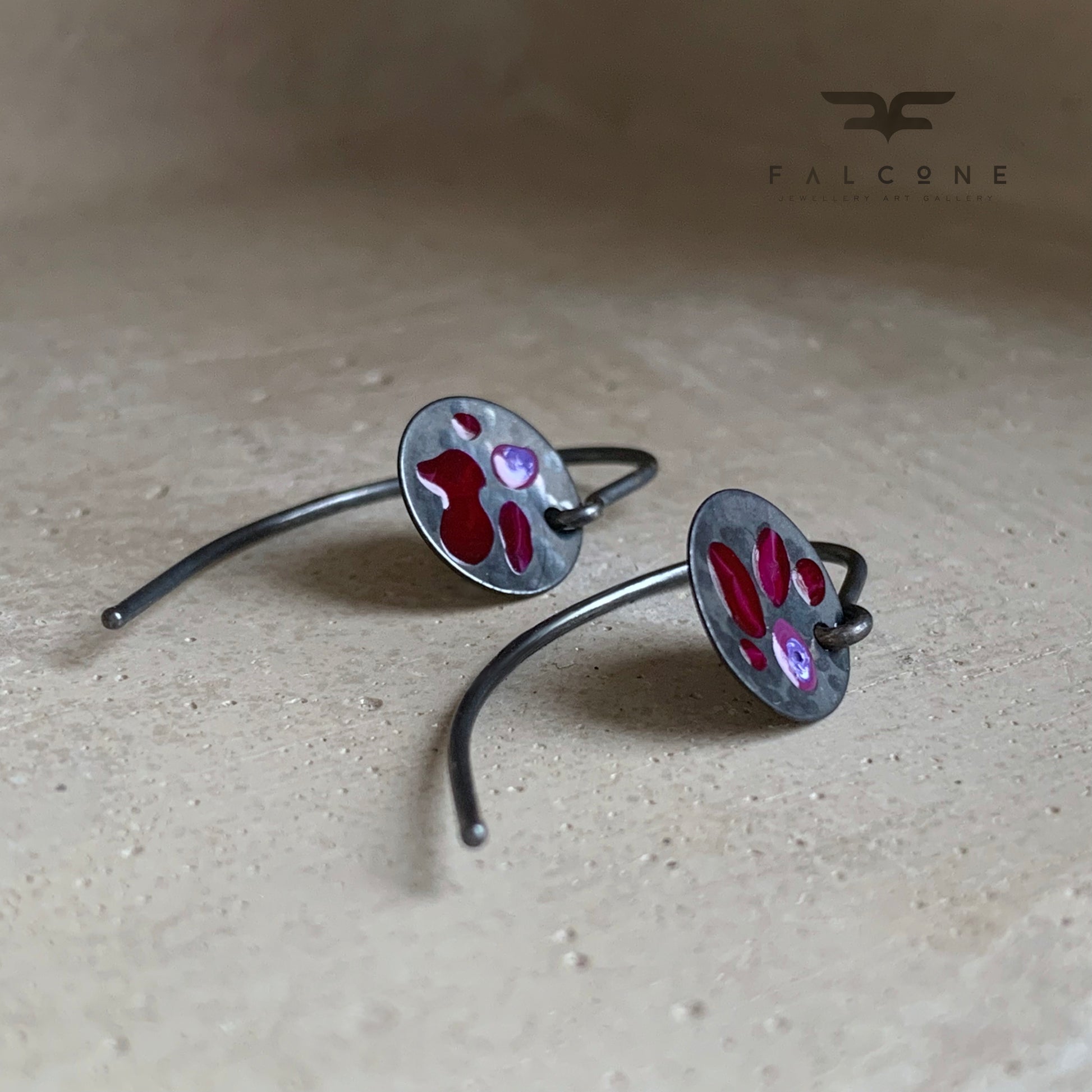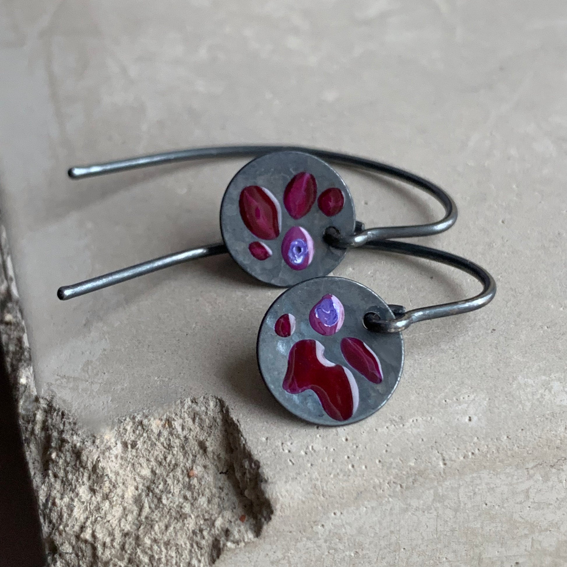 Sterling silver earrings with a floral motif. These small, delicate earrings are designed in a dark colour palette and decorated by hand with enamel in a picturesque, irregular floral pattern.