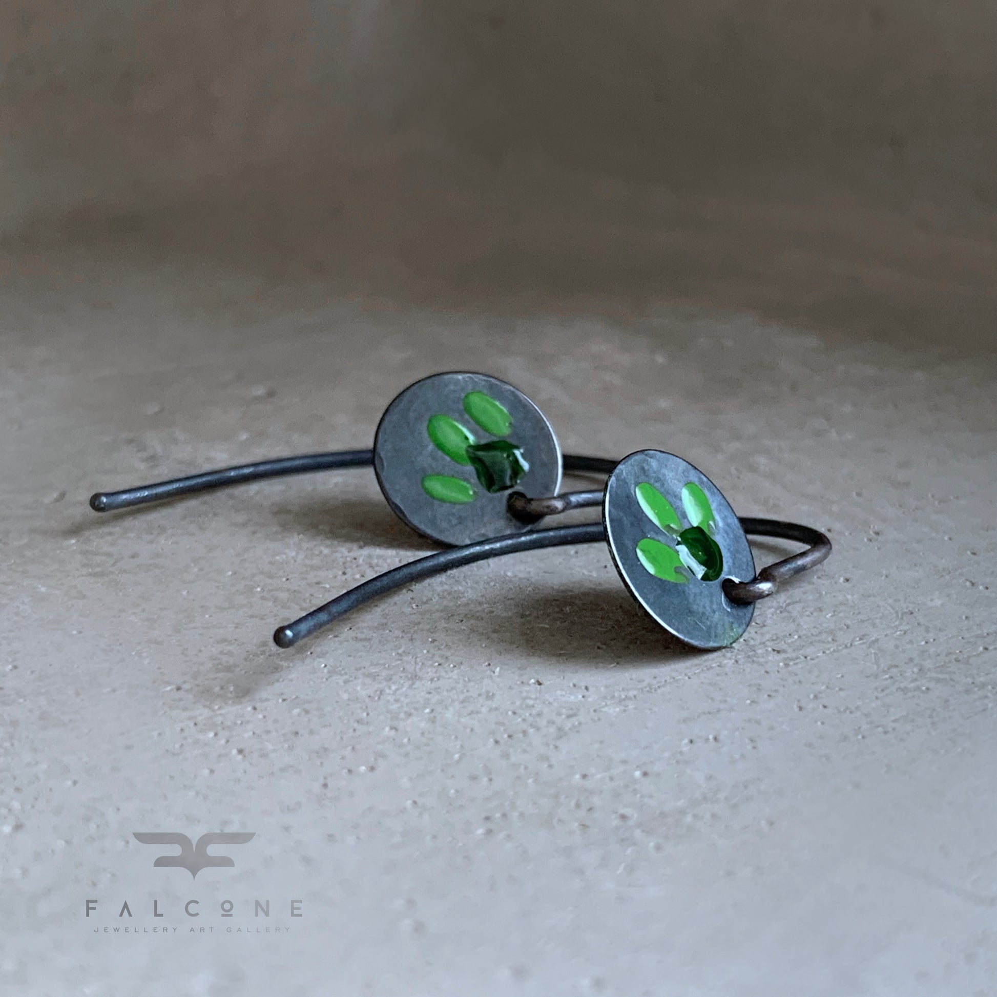 The color palette combines deep green with petals in a fresh grass-green tone. Small and elegant, the earrings feature a subtle colour accent against the darker silver.