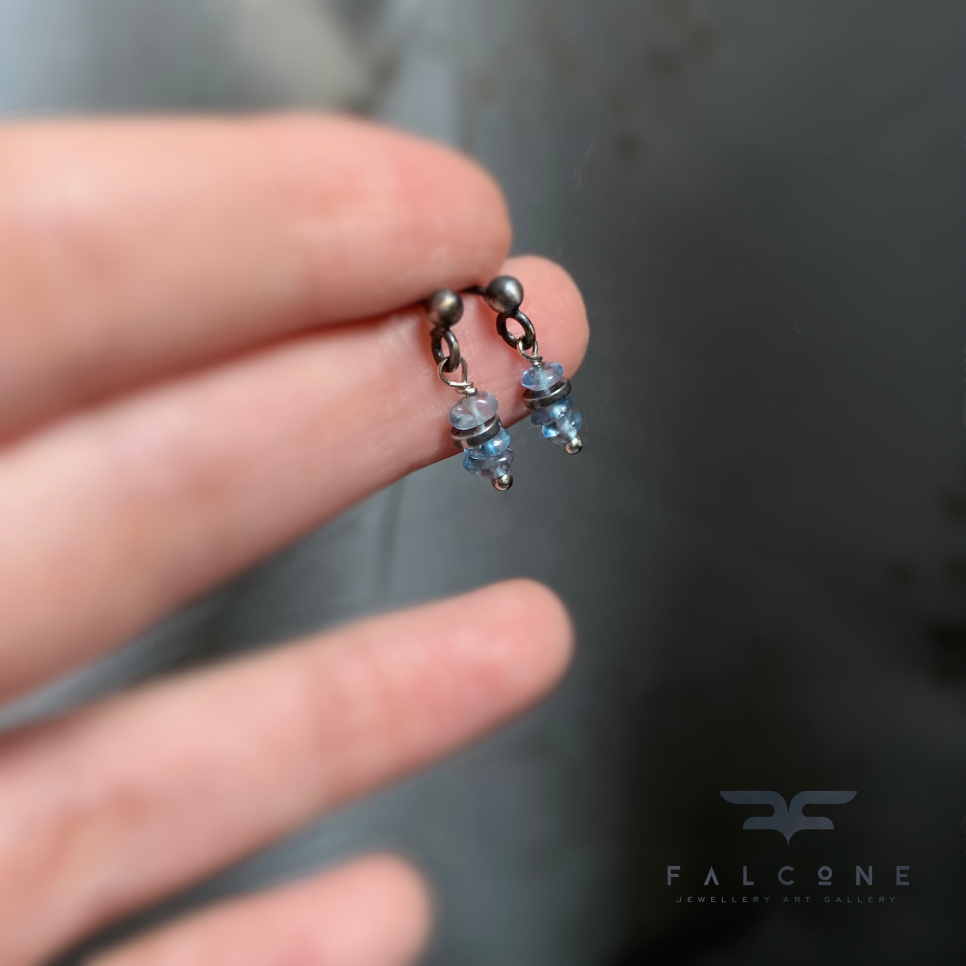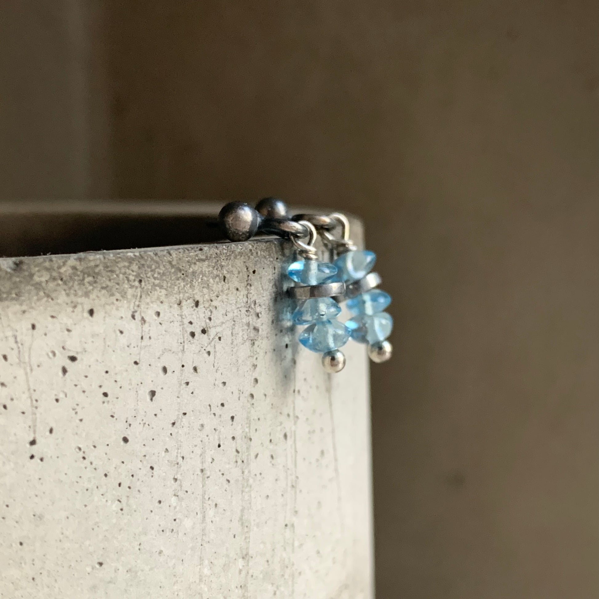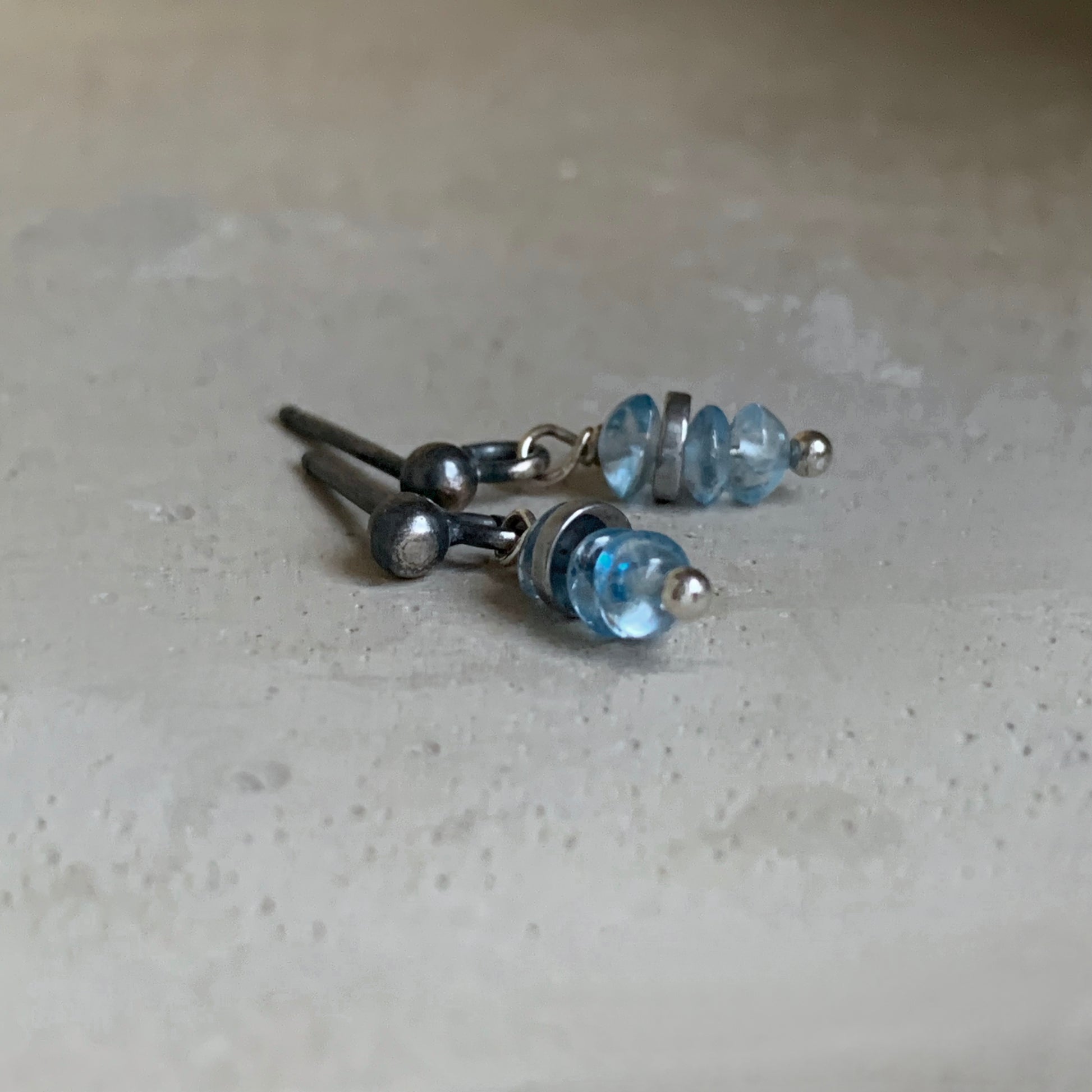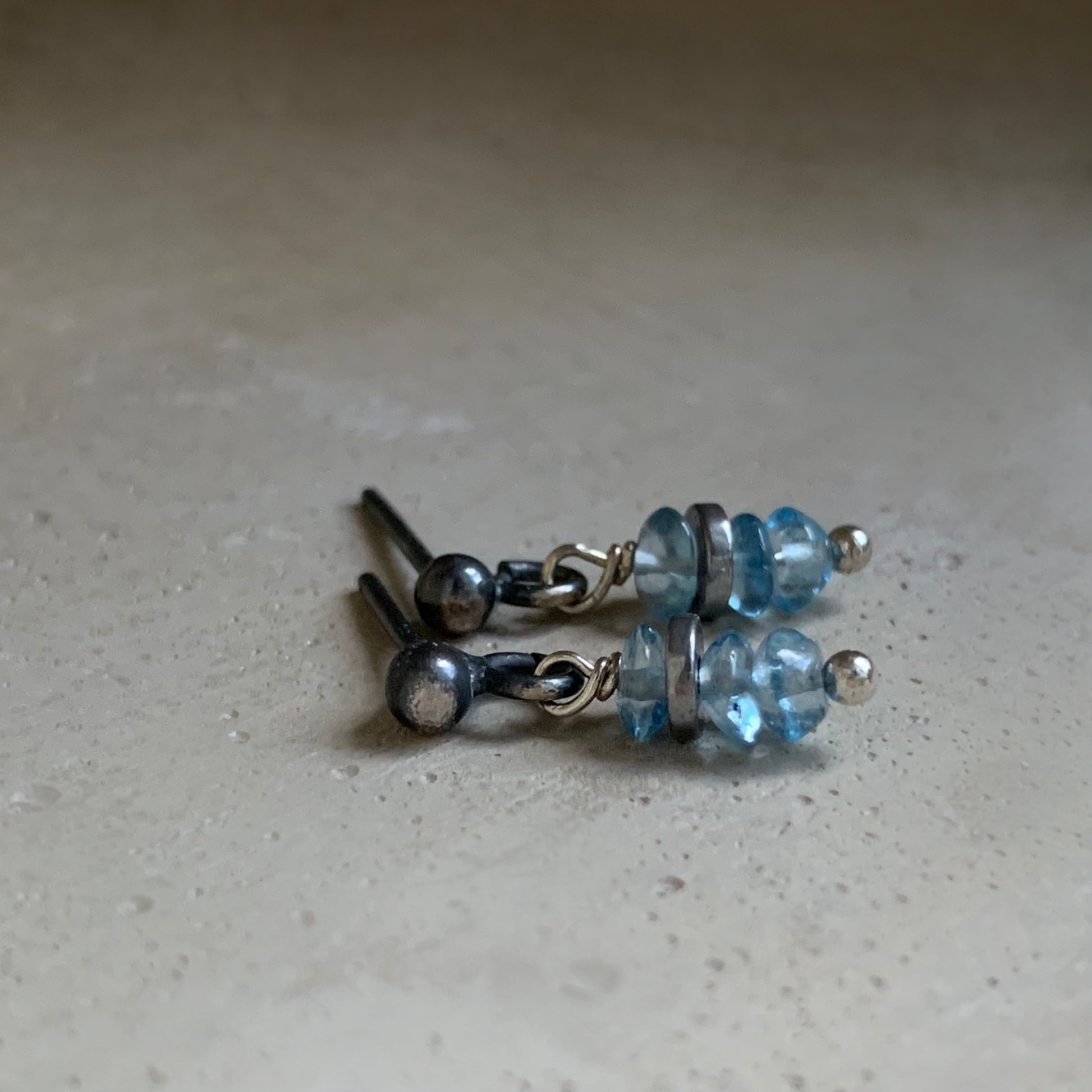 Earrings made of sterling silver and topaz. The stones are smooth-polished, irregular topaz rondelles in a light, transparent blue reminiscent of a clear sky.